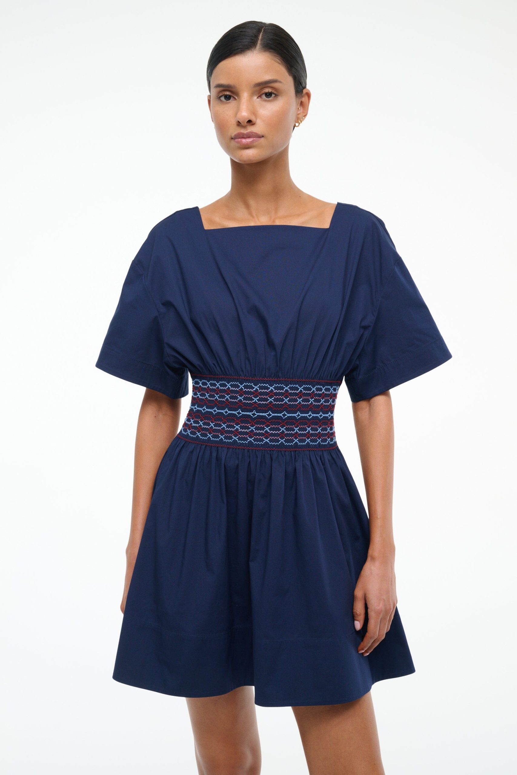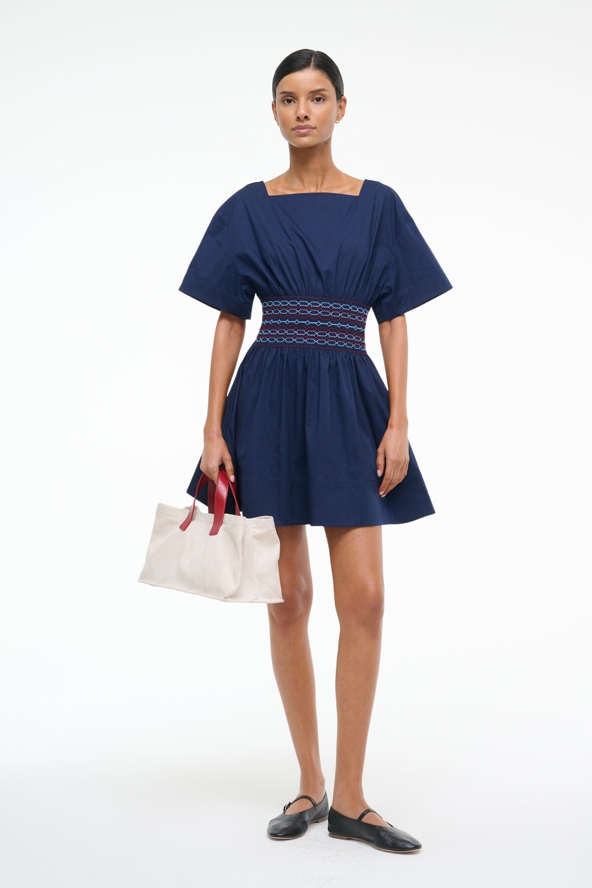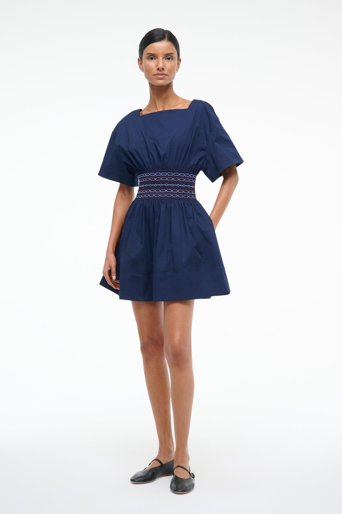 A structured mini dress made from our slightly stretchy cotton poplin fabric. The Mini Amy features a square neckline. wide neck and embroidered stitching at the waist.
