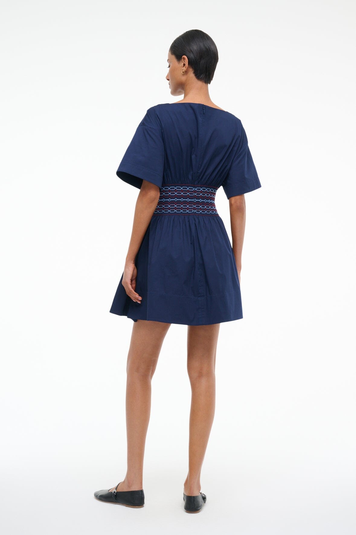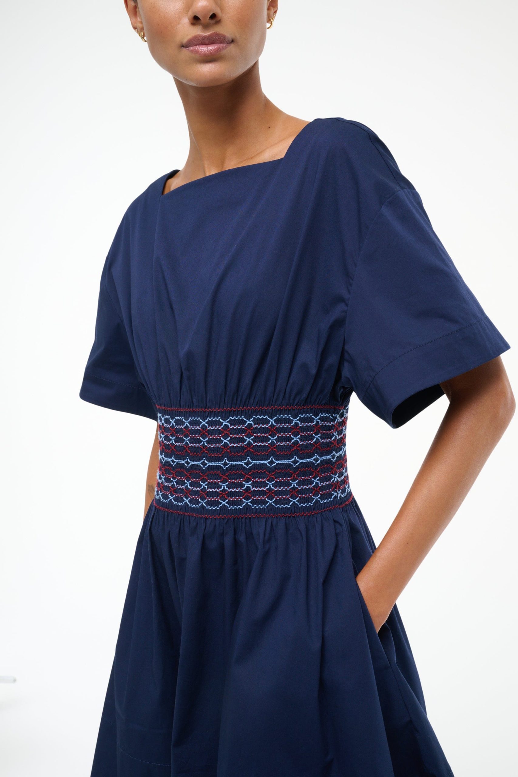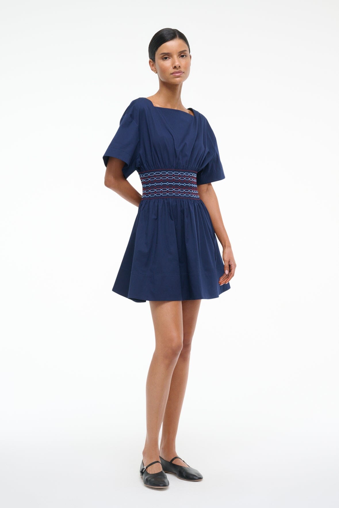 A structured mini dress made from our slightly stretchy cotton poplin fabric. The Mini Amy features a square neckline. wide neck and embroidered stitching at the waist.