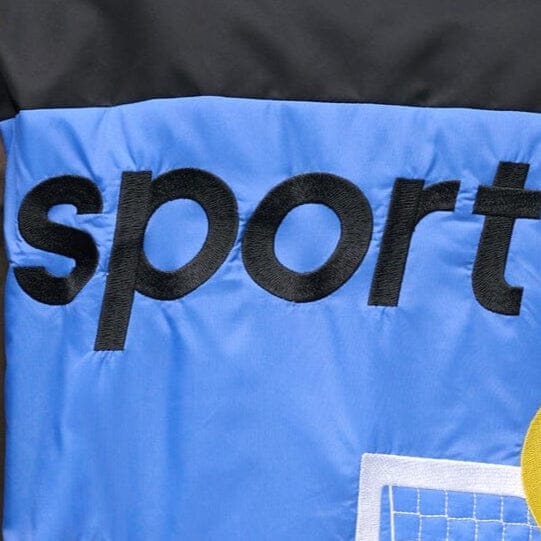 The Athena Jacket is a padded bomber jacket crafted in nylon. This style has a front zip. ribbed collar. cuffs. and hem. featuring a playful tennis motif on the back.?