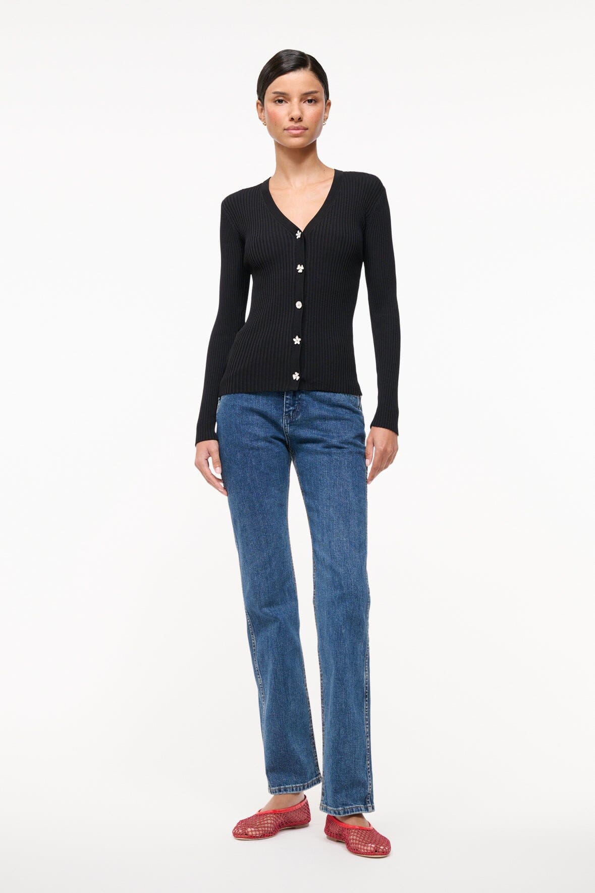 Our best-selling cardigan can easily be layered or worn as a top on its own. Made out of stretchy. comfortable compact rib knit fabric with silver tone floral buttons.