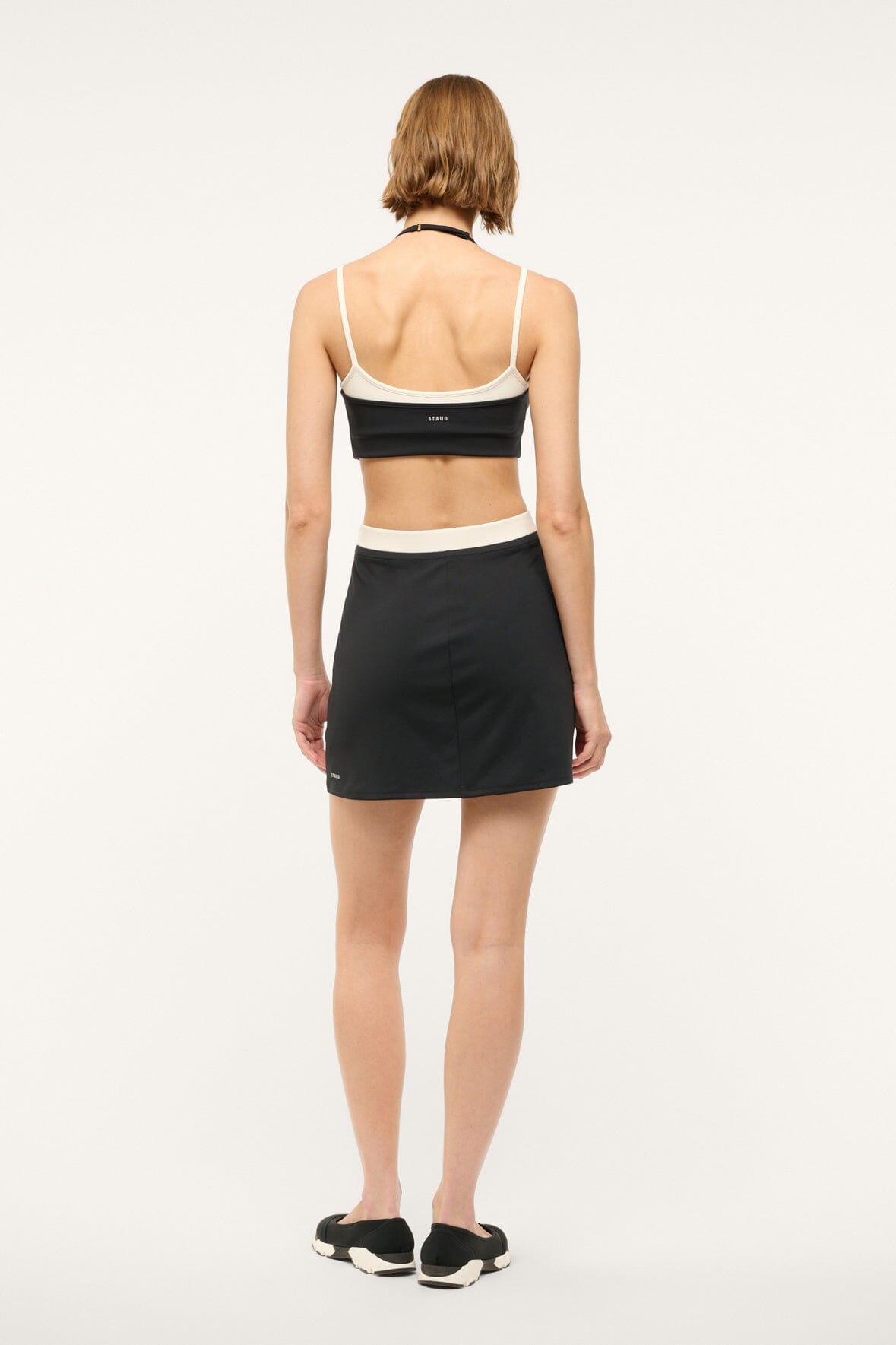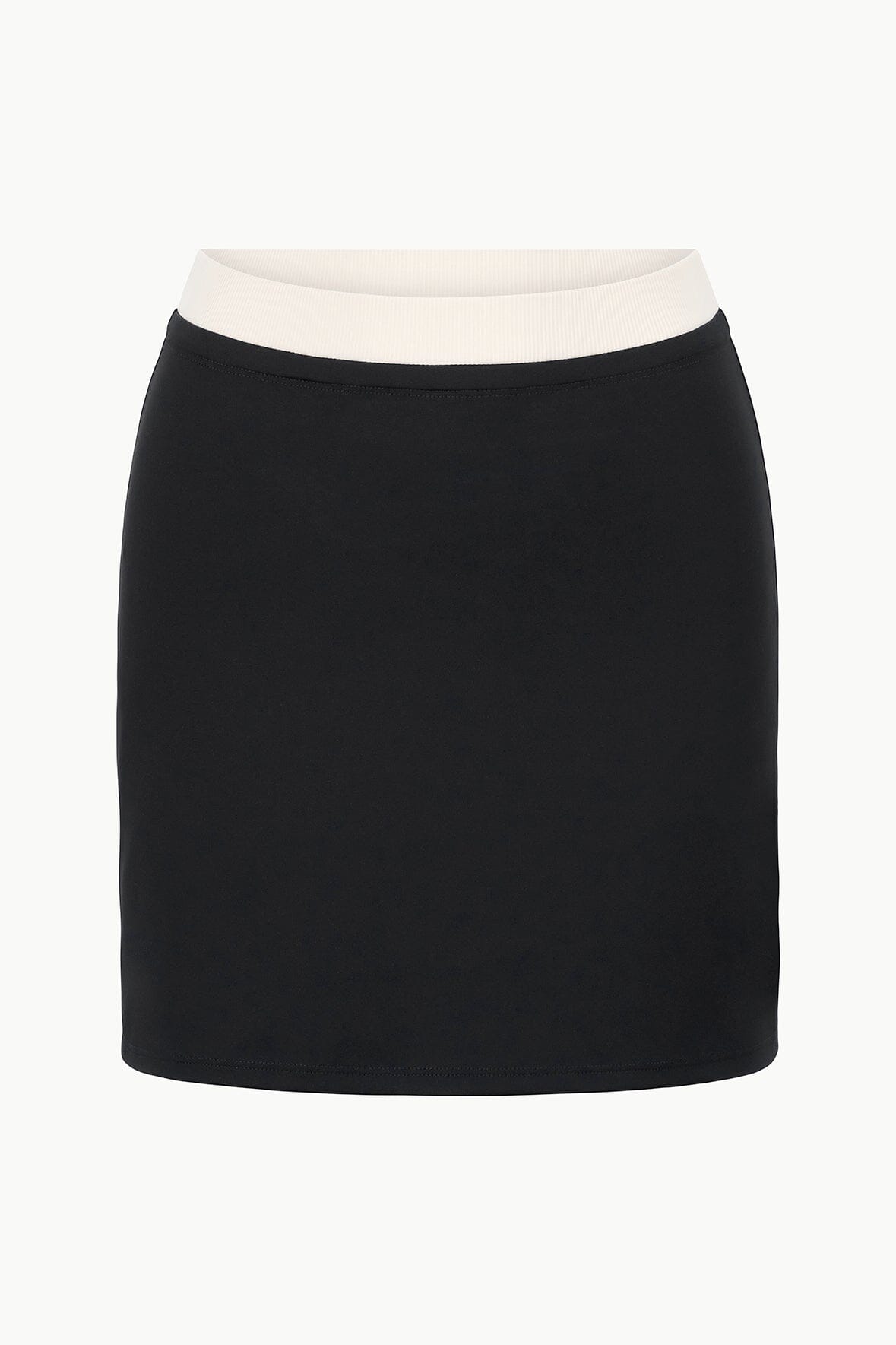 A combo mini skirt with contrast rib waistband and built-in shorts. The Catch Skirt is made from stretchy shapewear for an easy. flattering feel.