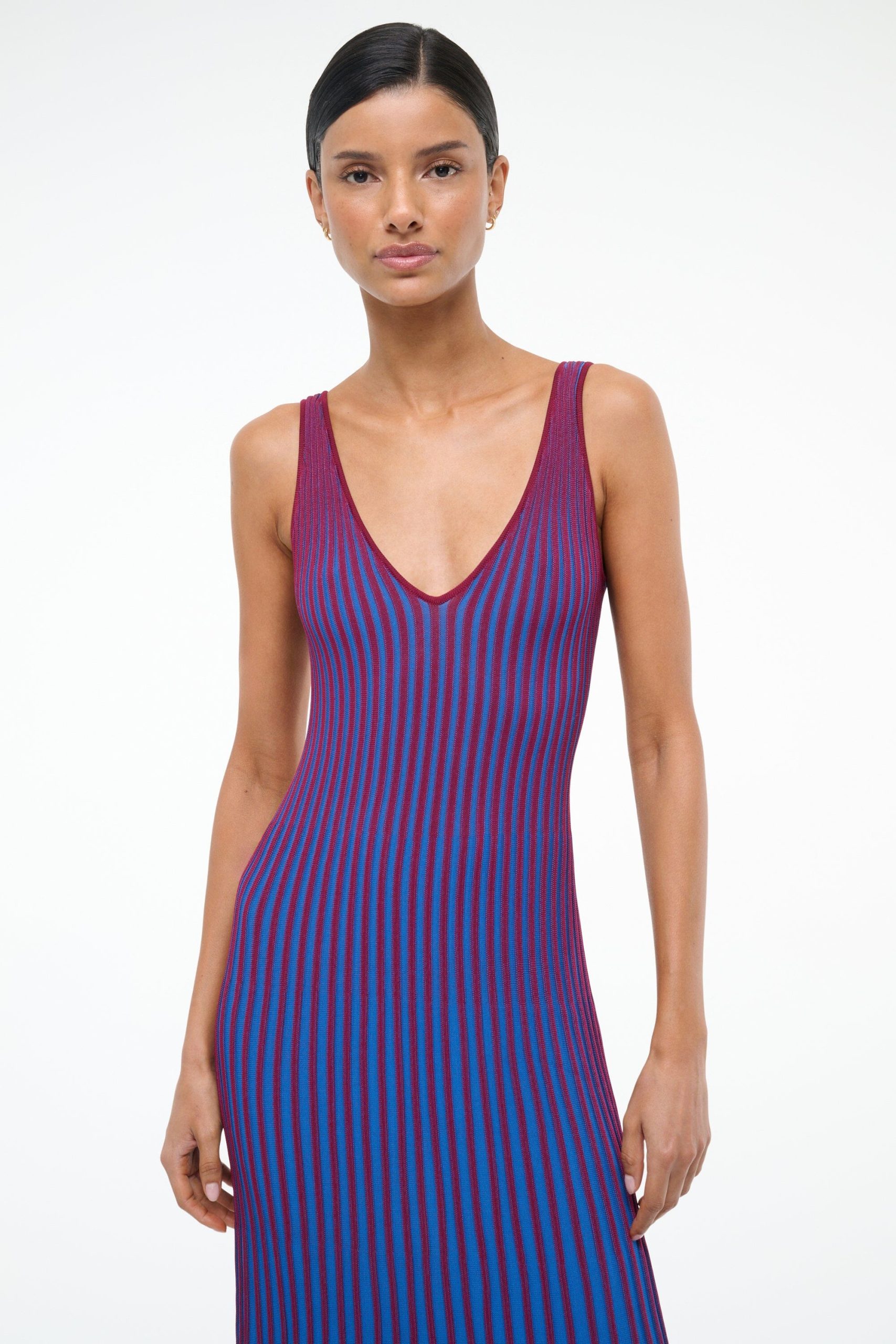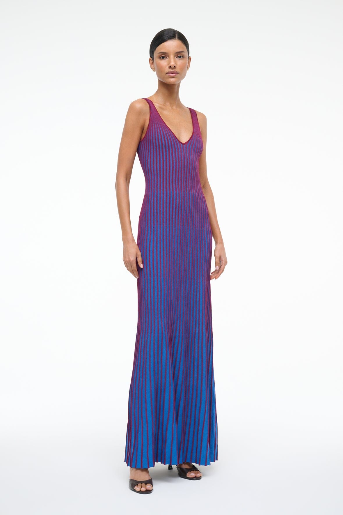 A sleeveless. maxi length dress made out of a flattering two-toned pleated rib knit fabric. This slip-on dress features a deep v neckline and slightly fluted skirt.