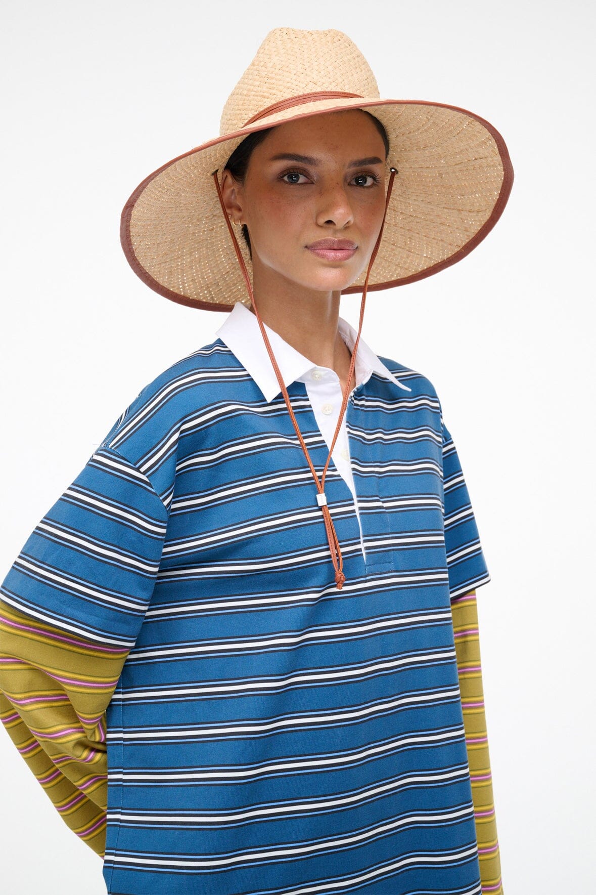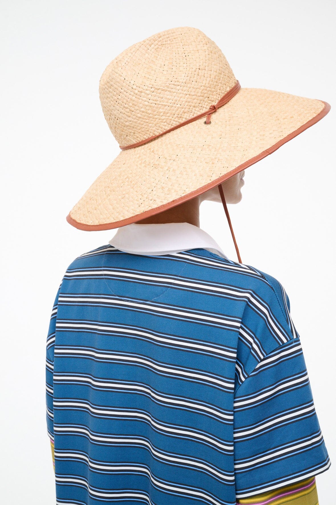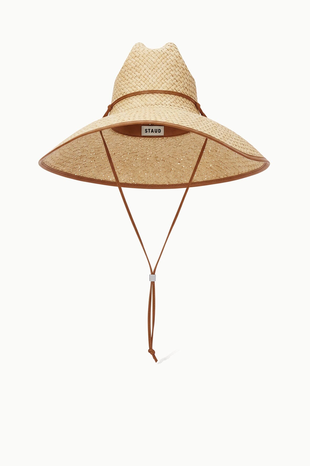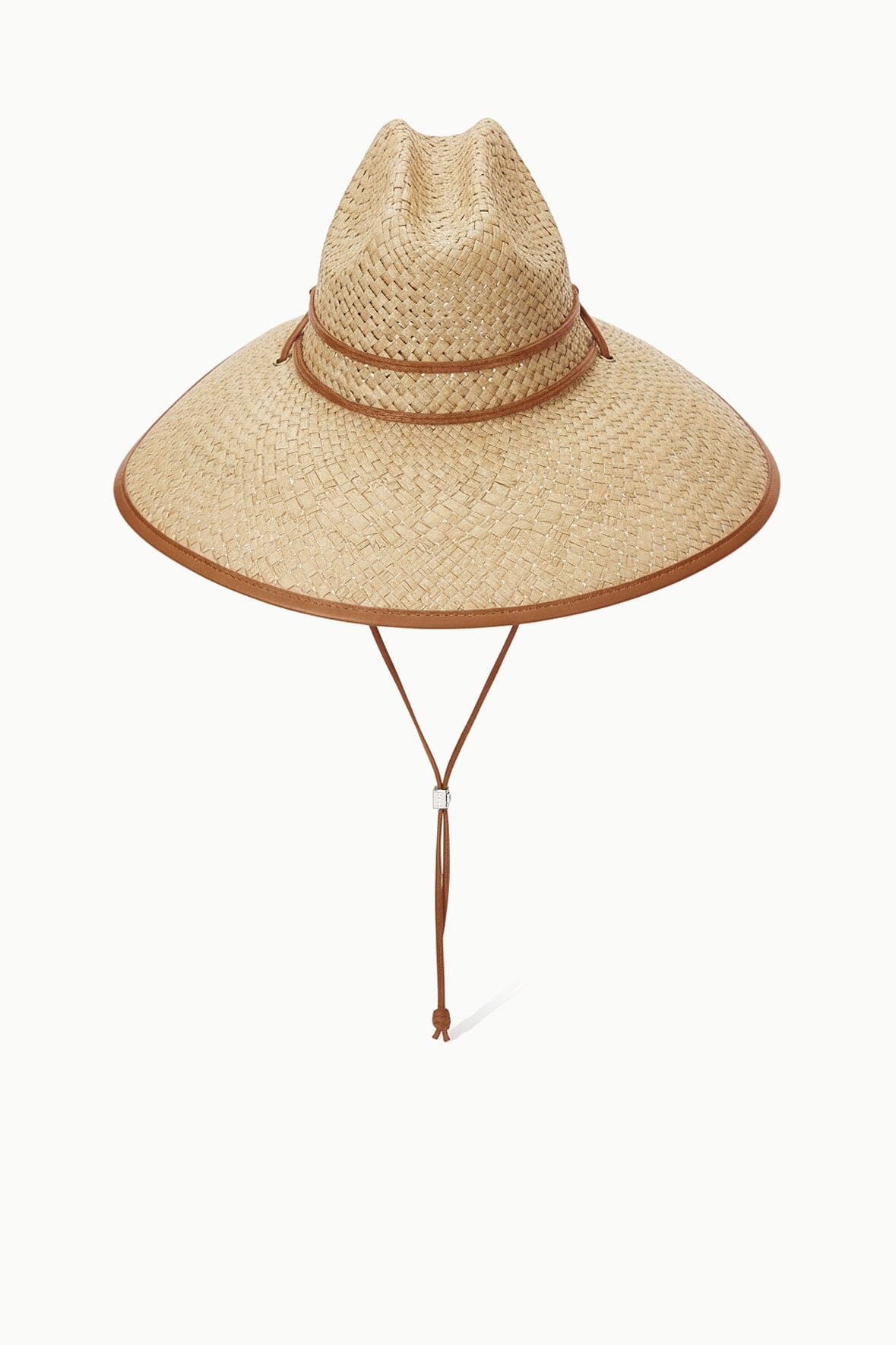 The Cove Hat is a wide-brim woven straw hat with leather trim. This style features a chin strap with signature metal hardware.?