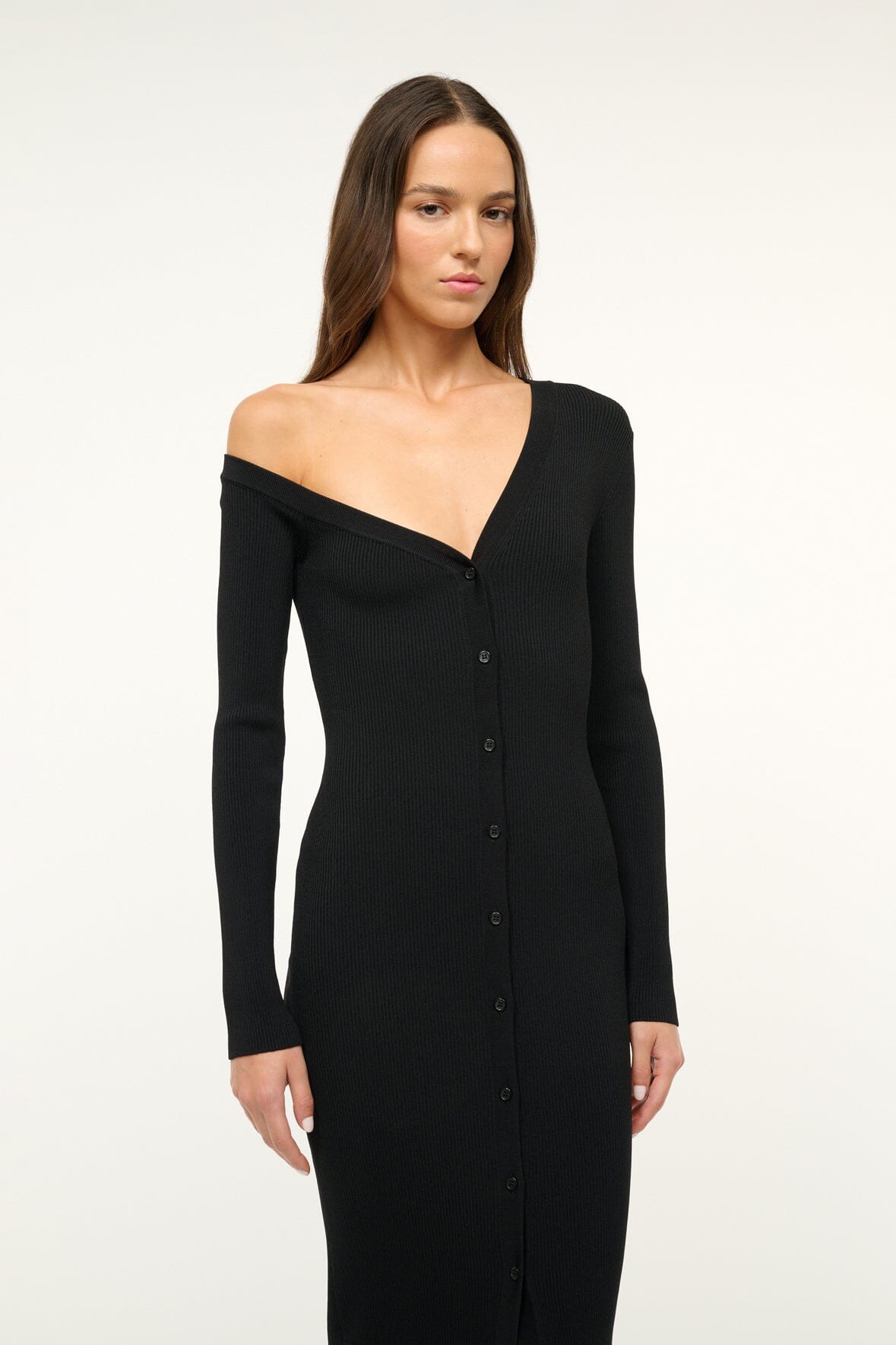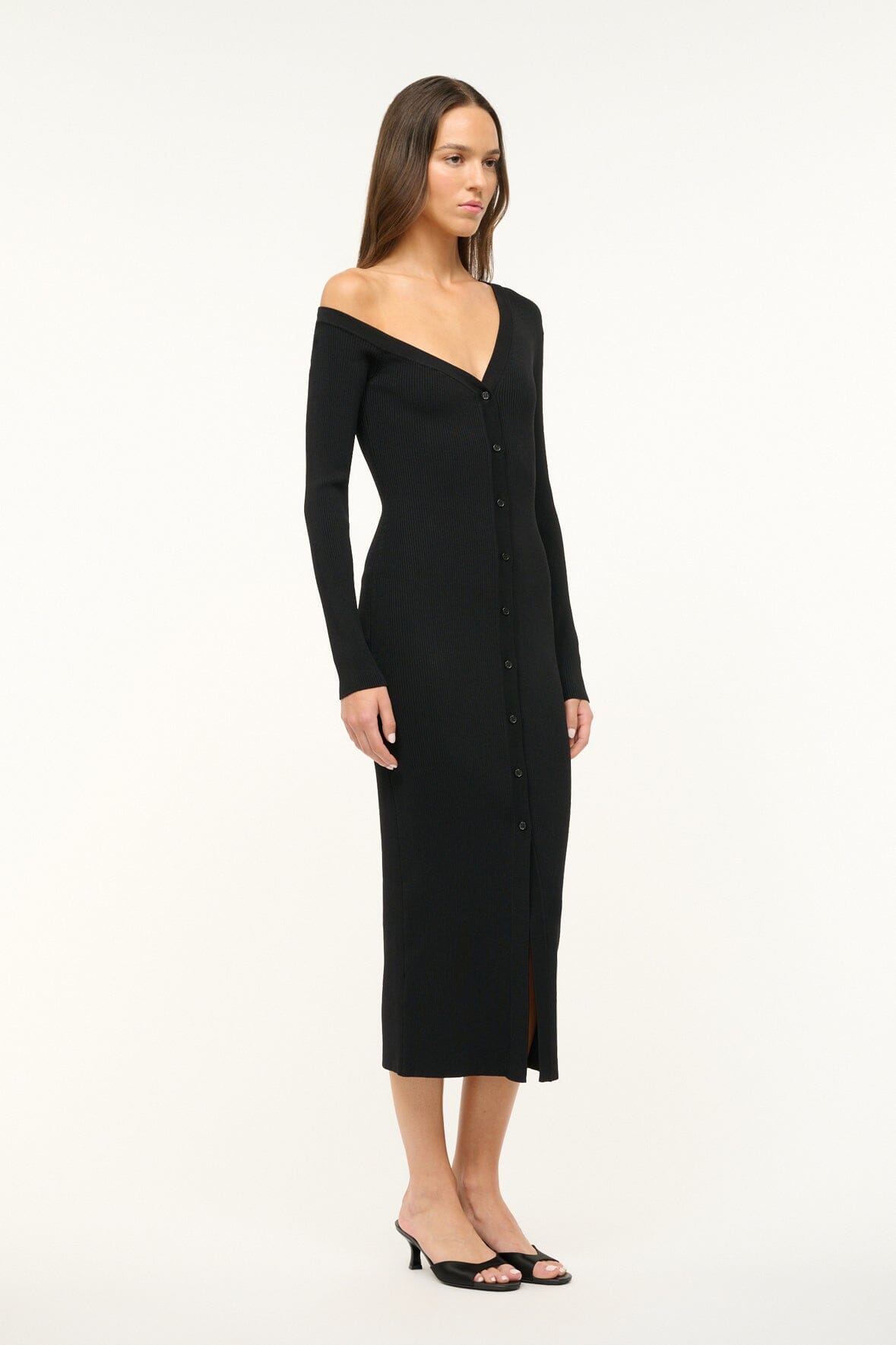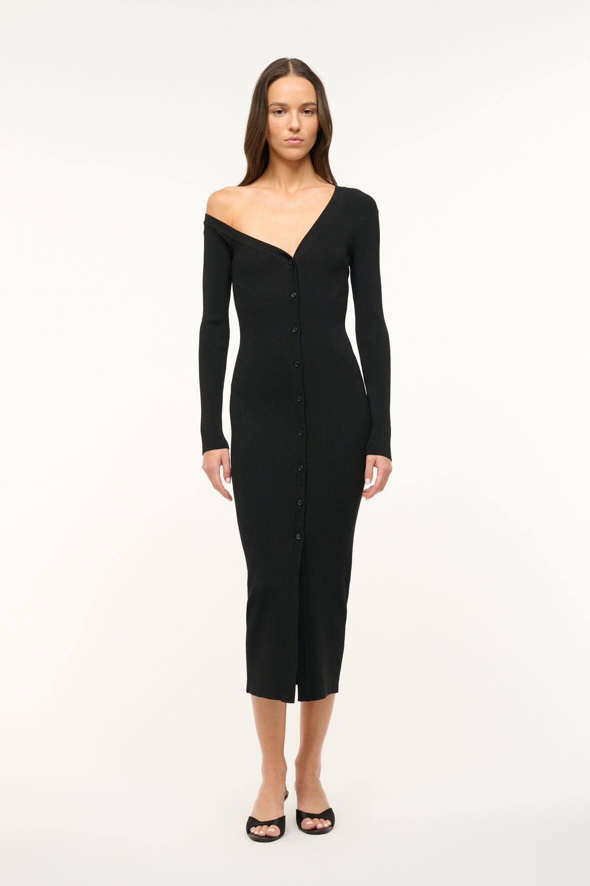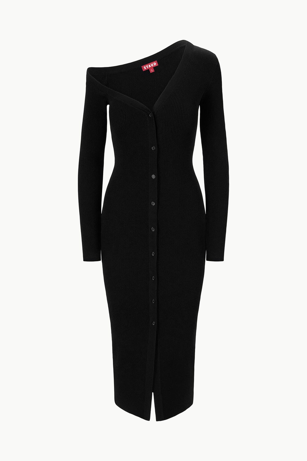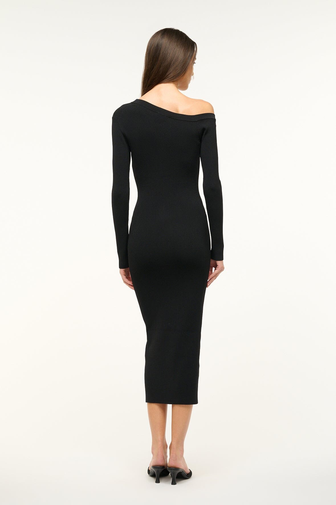 The Craftsman Sweater Dress is our update to the Craftsman Sweater. This style is an off-one-shoulder fitted midi dress.