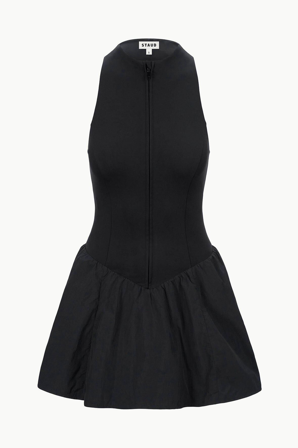 A sleeveless. halter neck mini dress made from stretchy shapewear for all your active needs. Featuring a front zipper and drop waist. the Crevasse Dress is a combo style with nylon flutter skirt and built-in liner shorts with storage pockets.