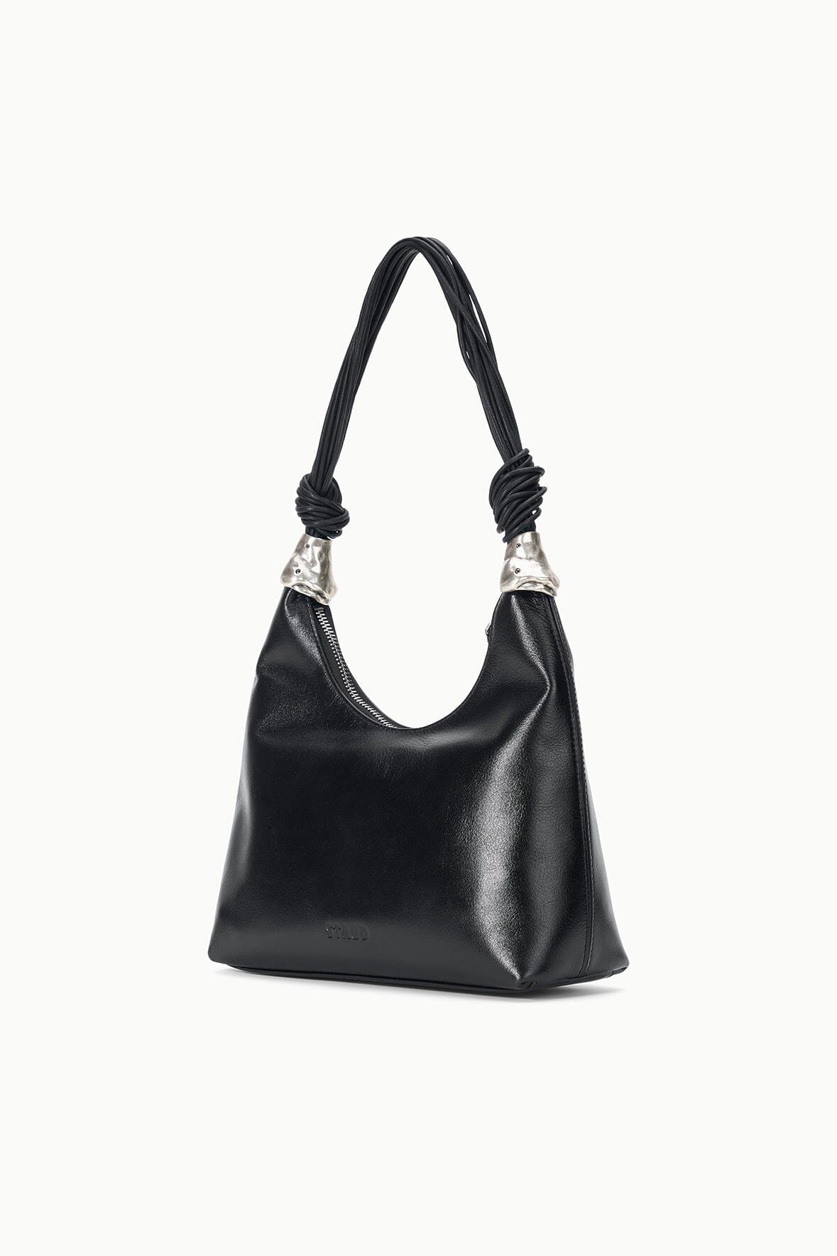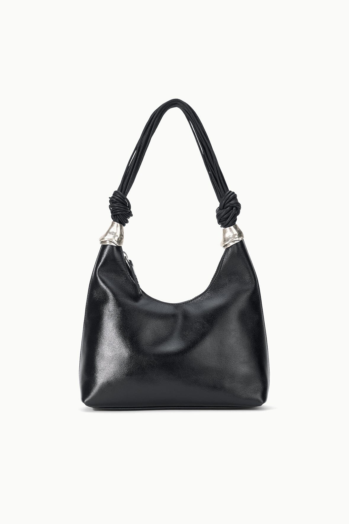 The Cuff Shoulder Bag features our new metal cuff hardware at the base of the leather corded shoulder straps. It has a zip top opening and includes an interior zipper pocket to safely store your essentials.