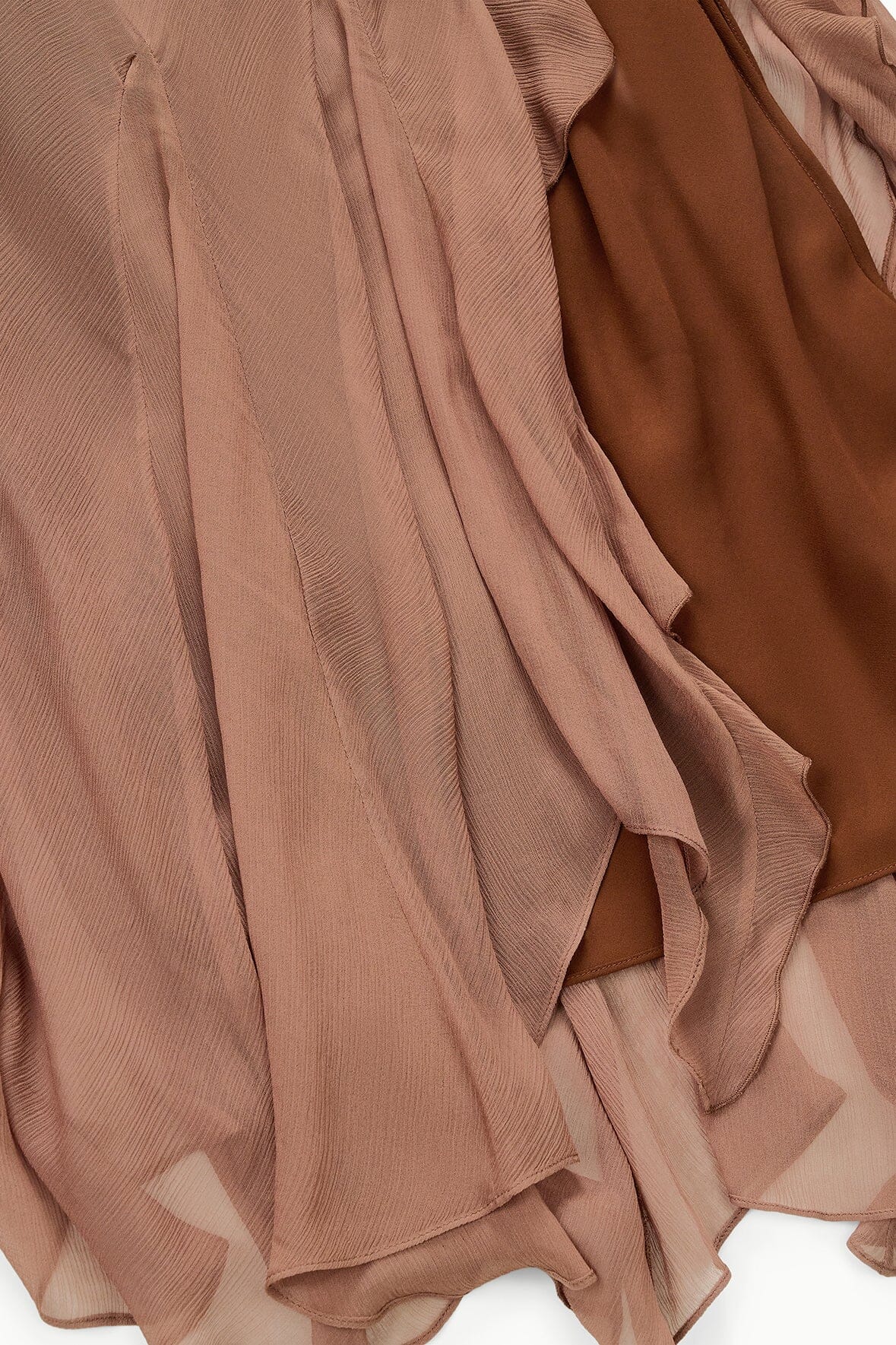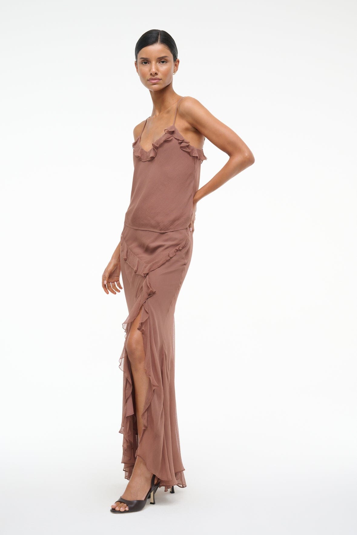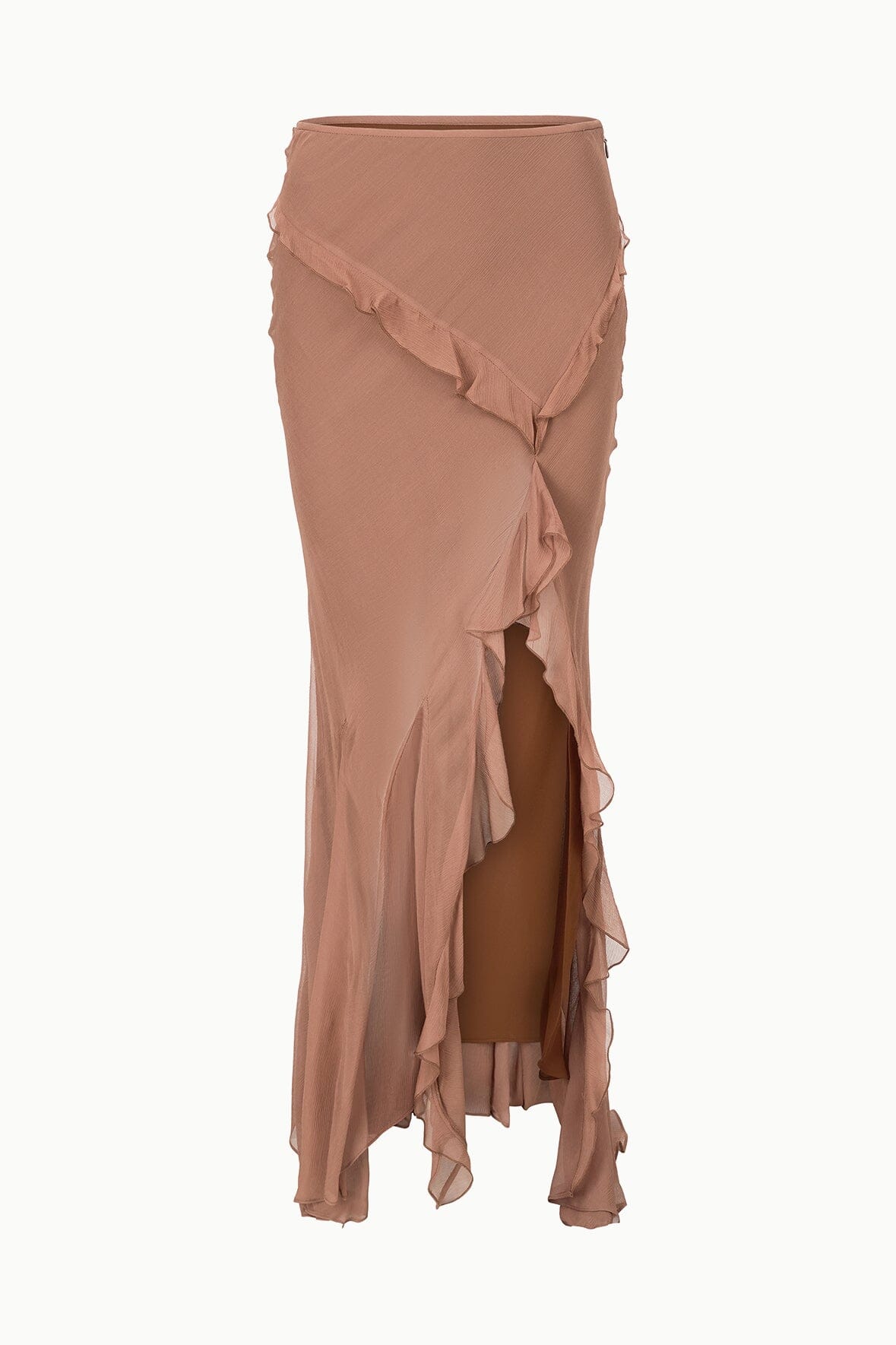 The Diana Skirt is a maxi skirt featuring a thigh high slit and flowy ruffle detailing. This style is crafted in our crinkle chiffon and can be paired with the Selena Top as a matching set.