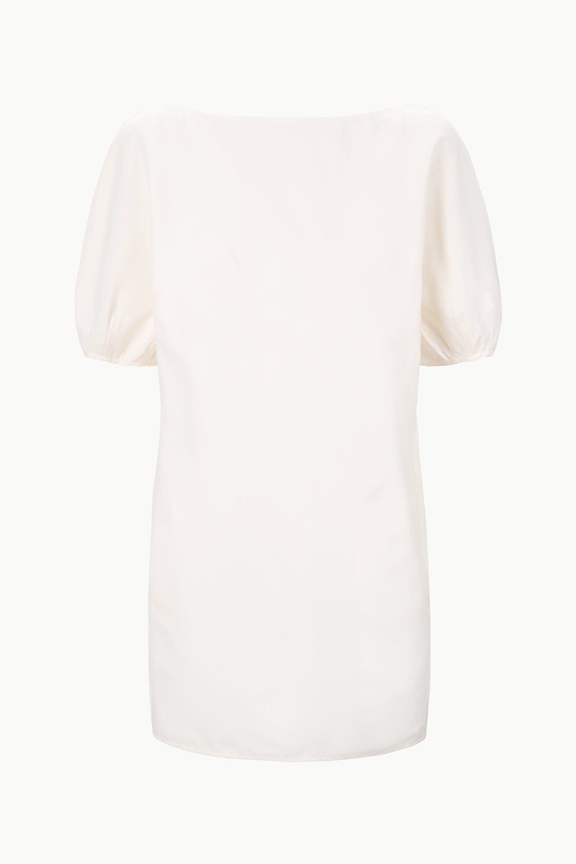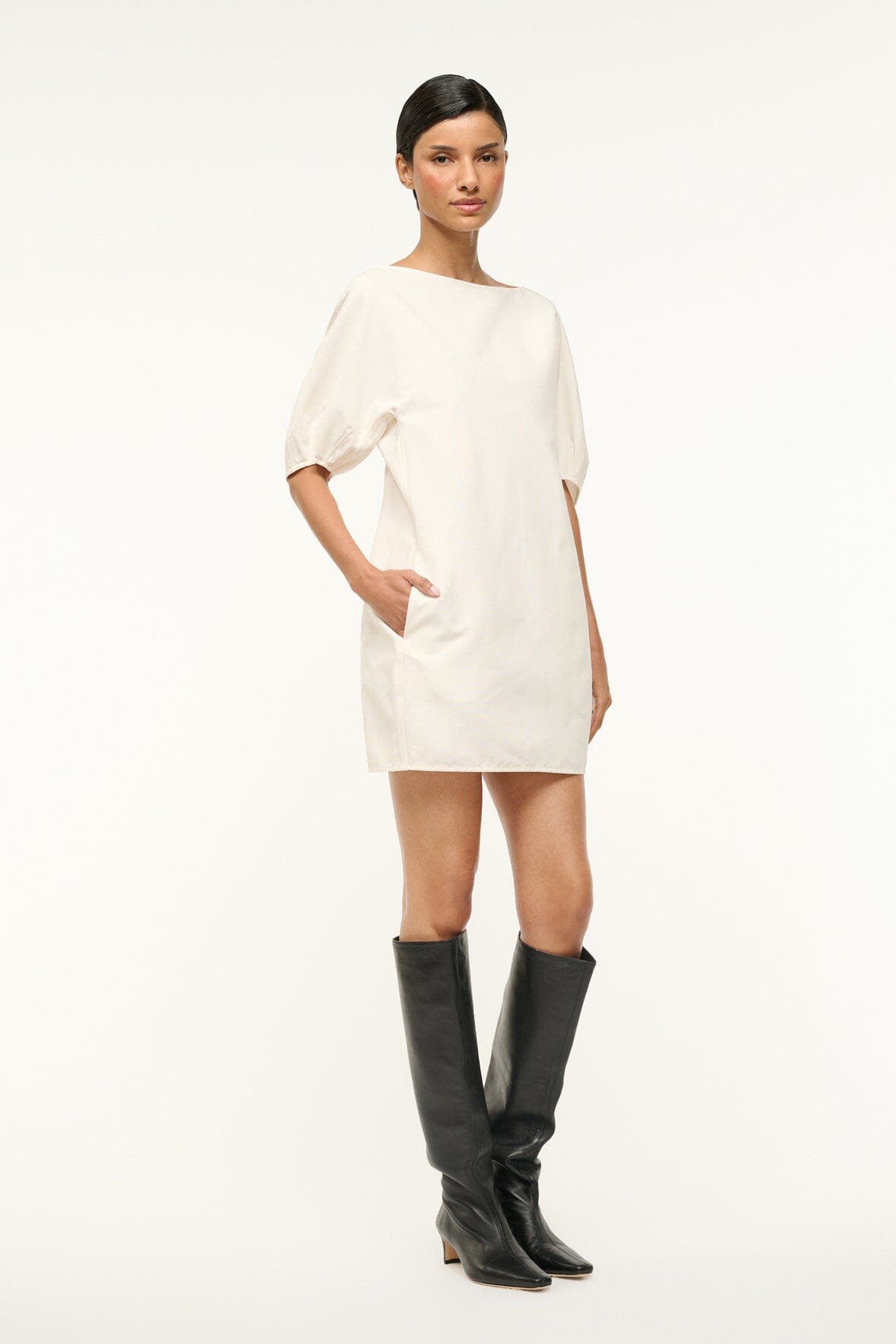 An updated shift dress featuring a boat neck and balloon half-sleeves. Crafted from grosgrain. the Didi is a great transitional dress.
