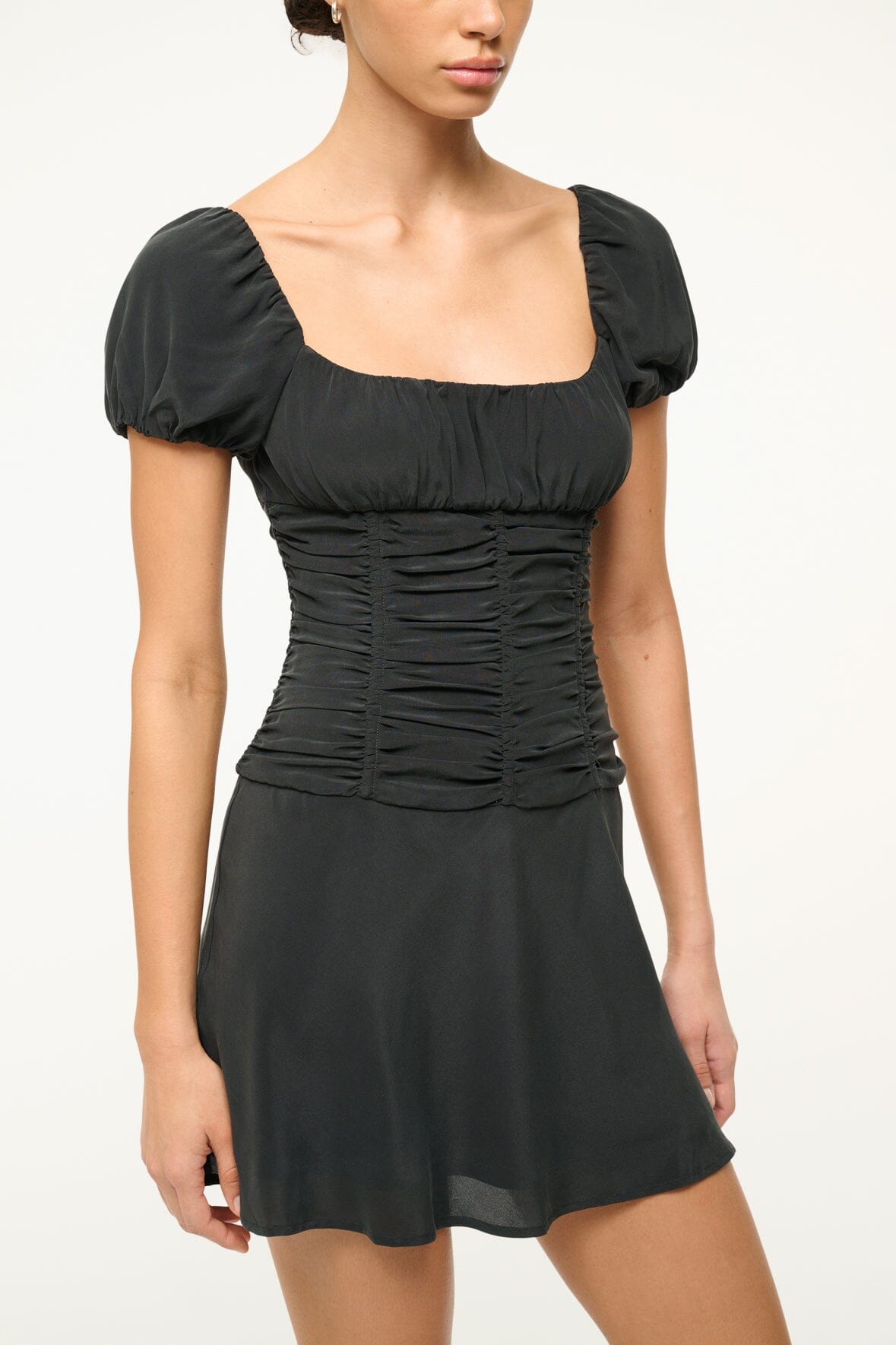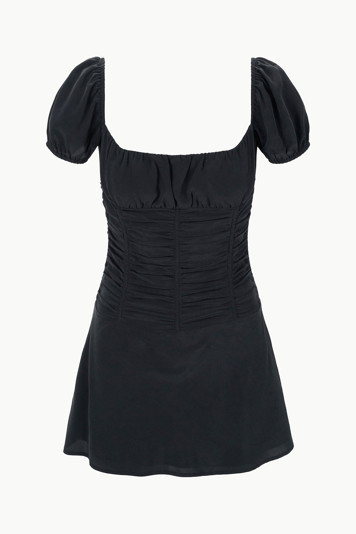 The Elba Mini Dress is a fitted mini with a shirred cap sleeve and corset-style seaming throughout the waist.