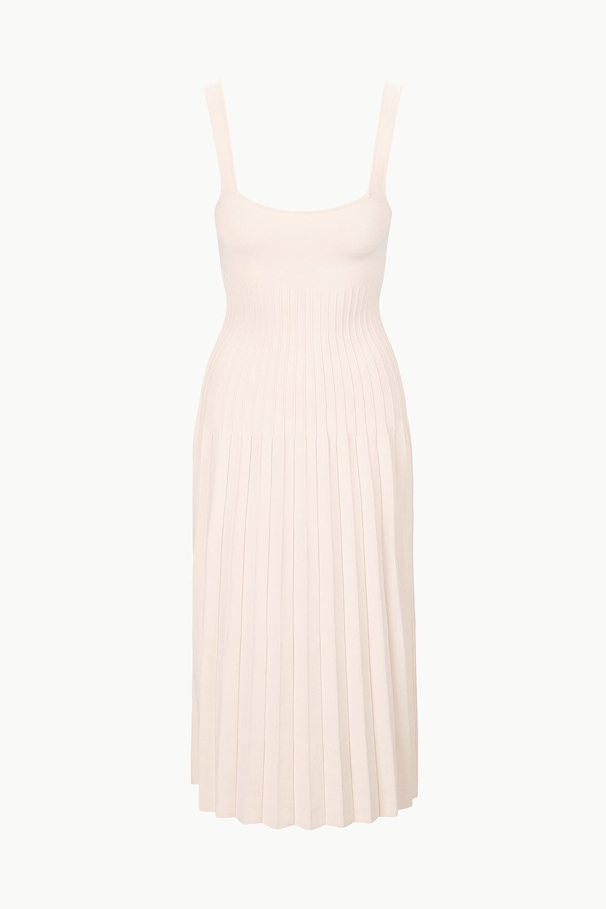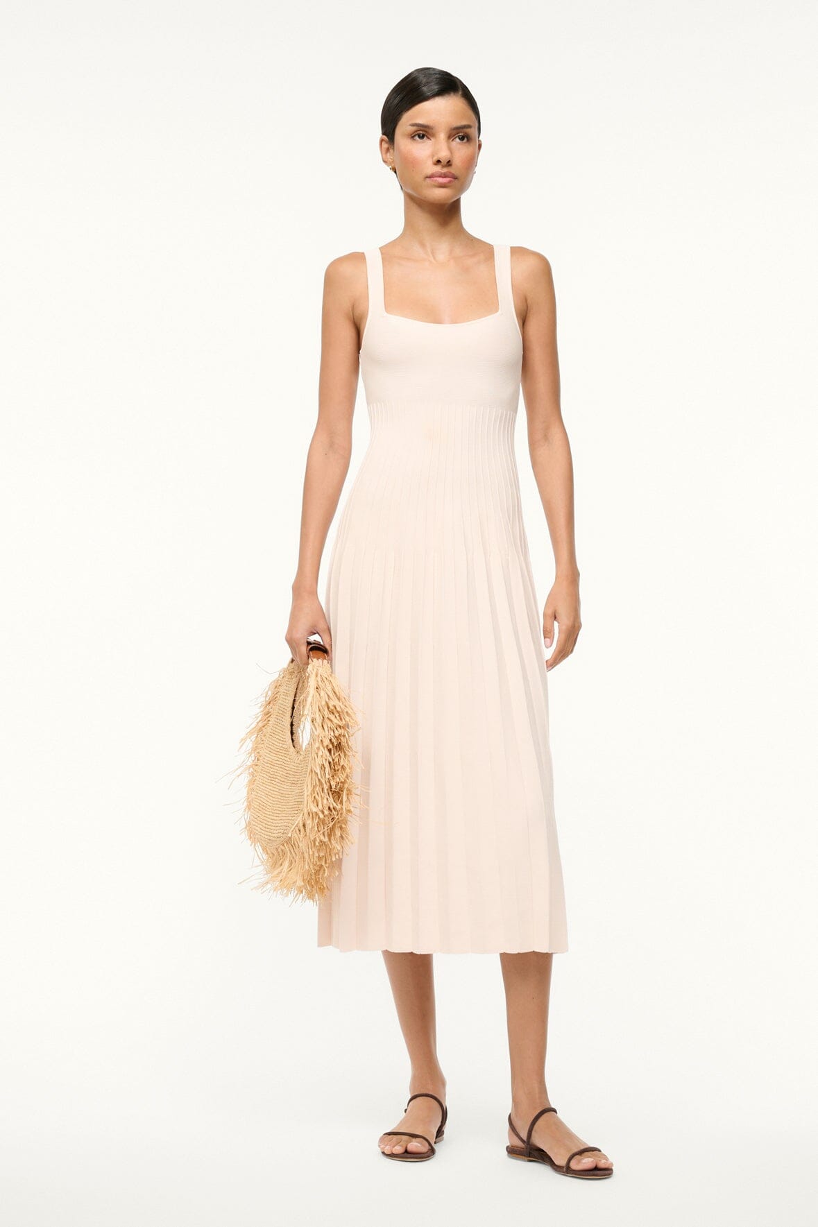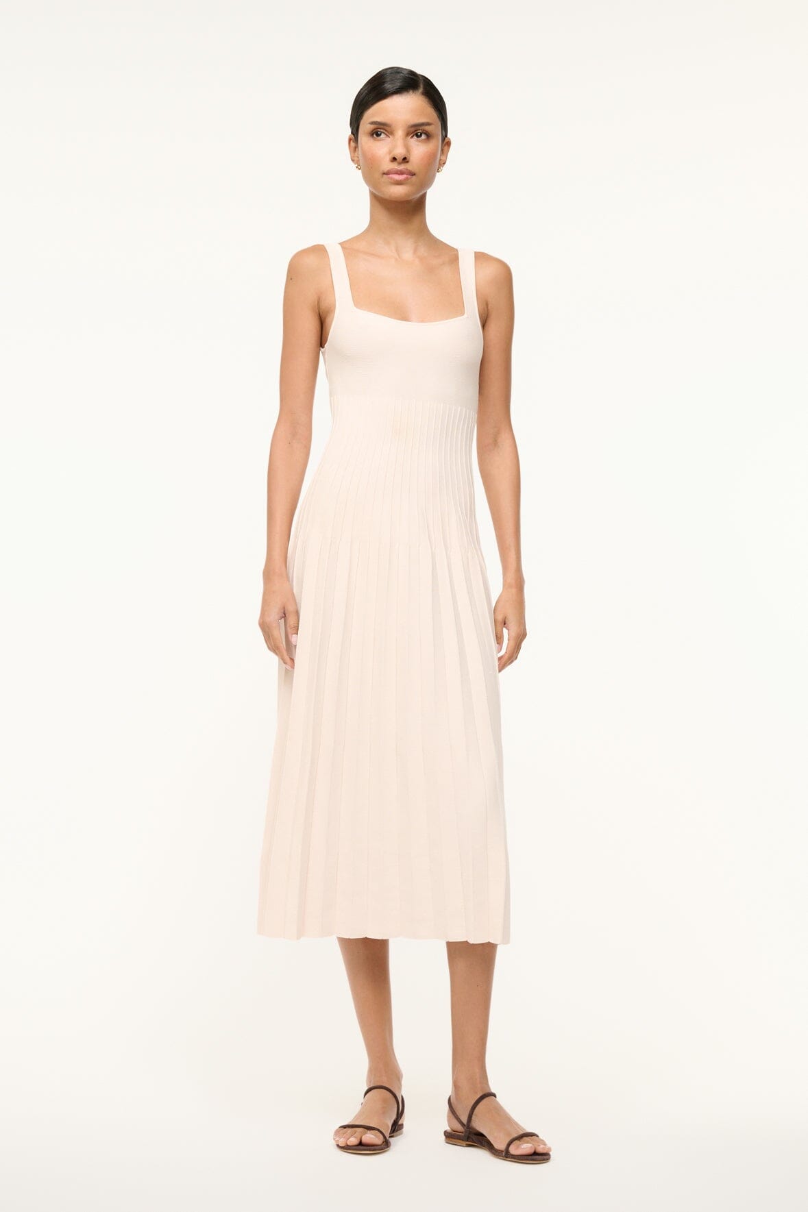 The Ellison Dress features a square neckline. bra-friendly straps. and ottoman stitch detailing at the waist for the perfect flattering fit.