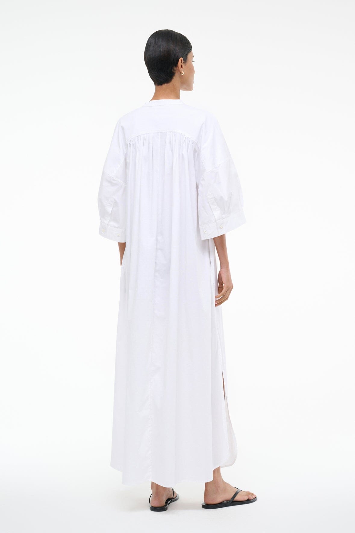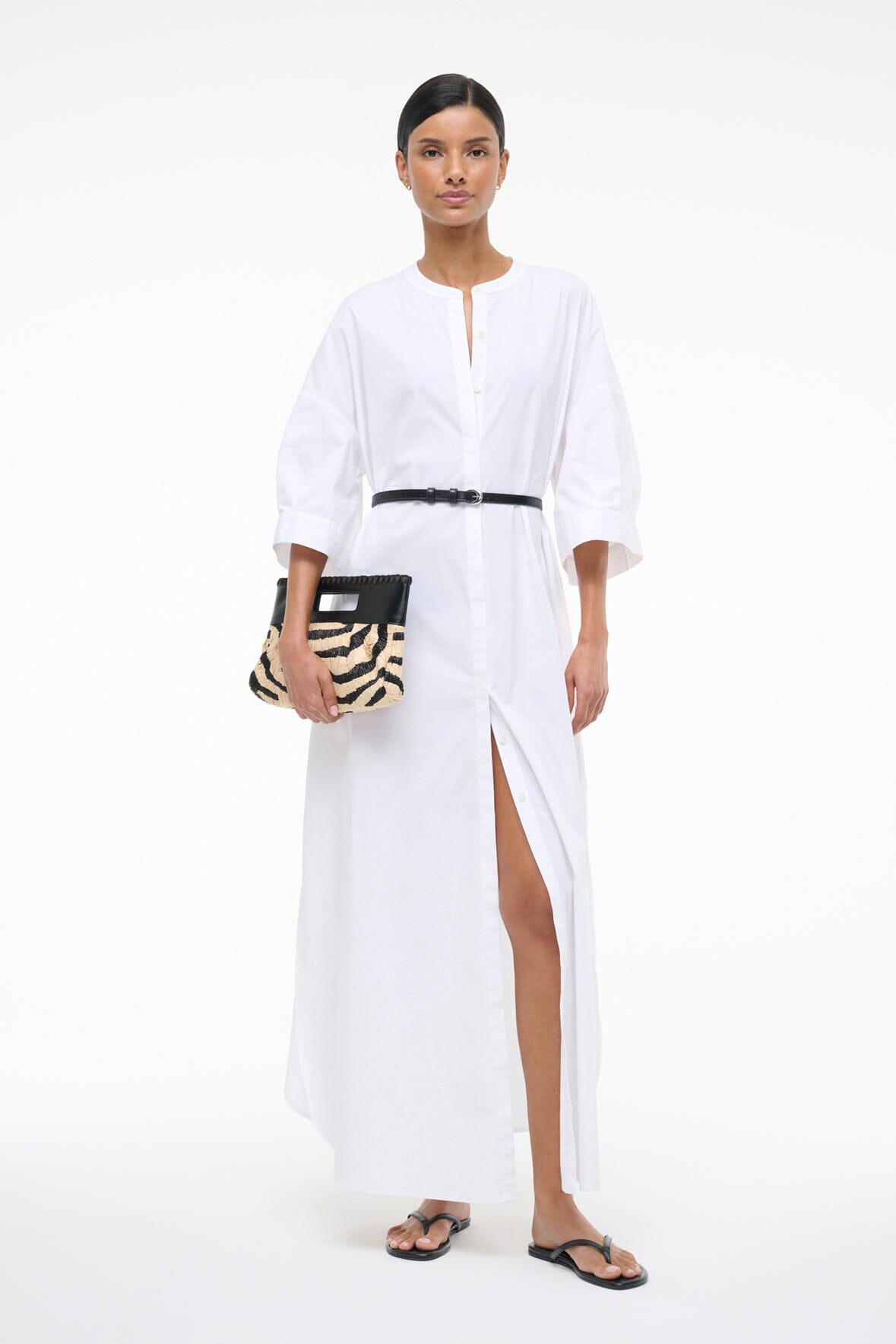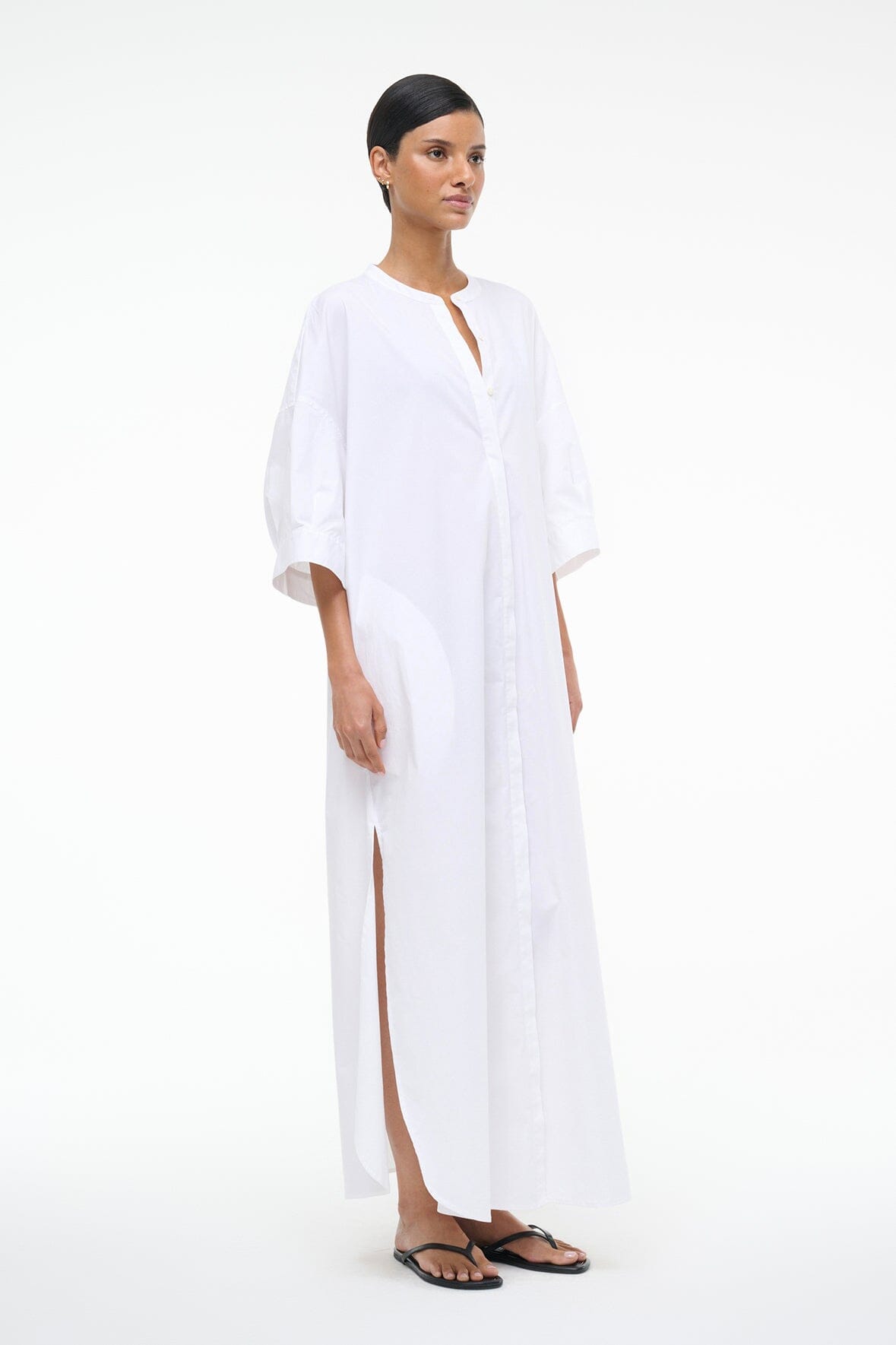 The Enzo Maxi Dress is a versatile flowy maxi dress in our cotton poplin. This dress features a 3/4 length sleeve and hidden front buttons. You can style the dress with or without a belt. or even wear it open as a swim coverup.