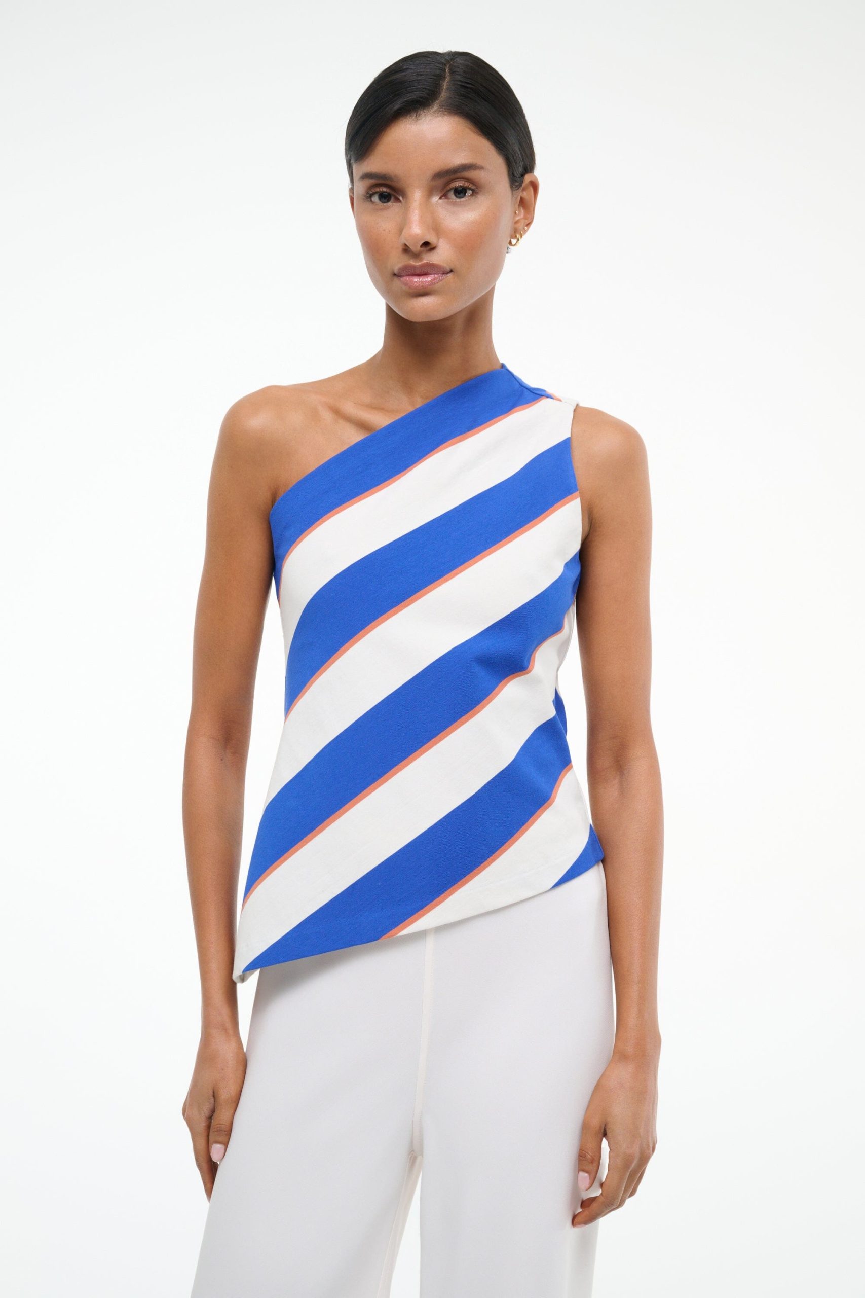 The Esme Top is a one shoulder sleeveless jersey top. featuring an asymmetrical hem. in our seasonal rugby stripe.