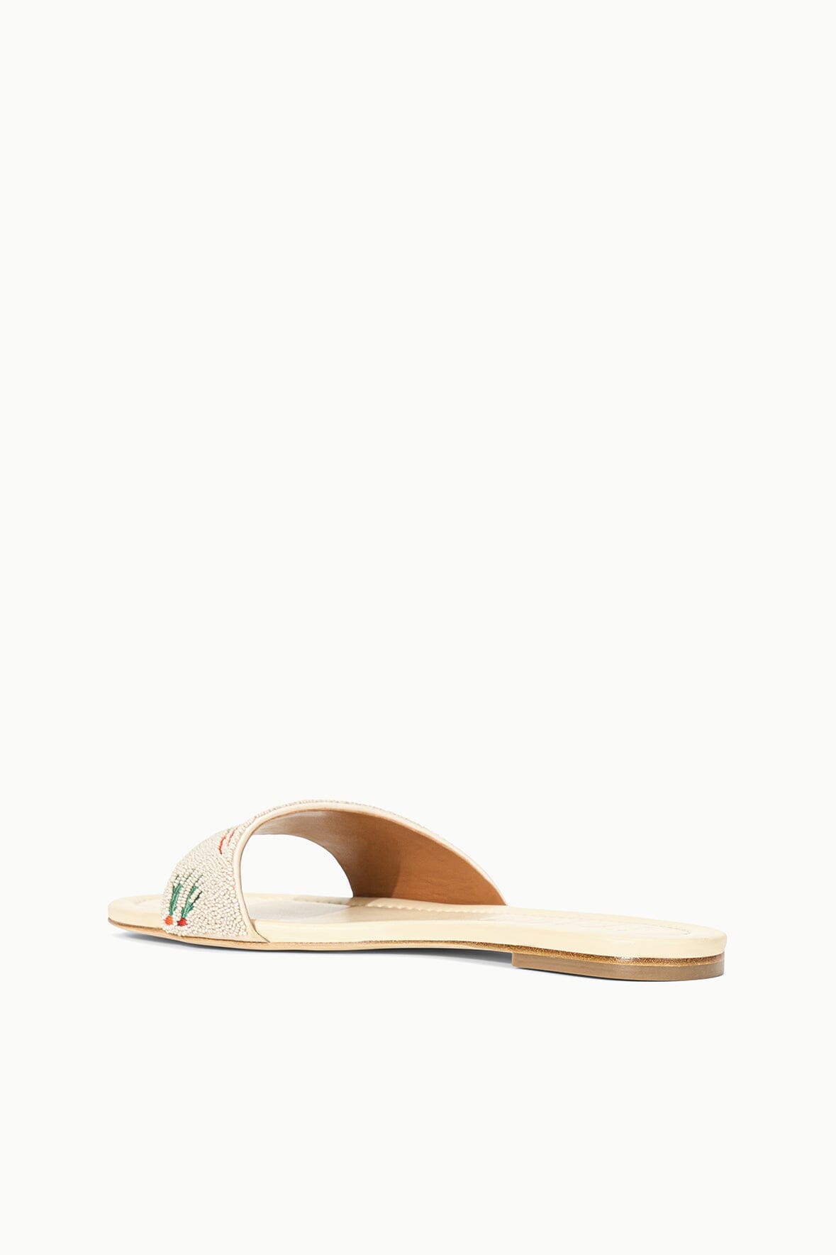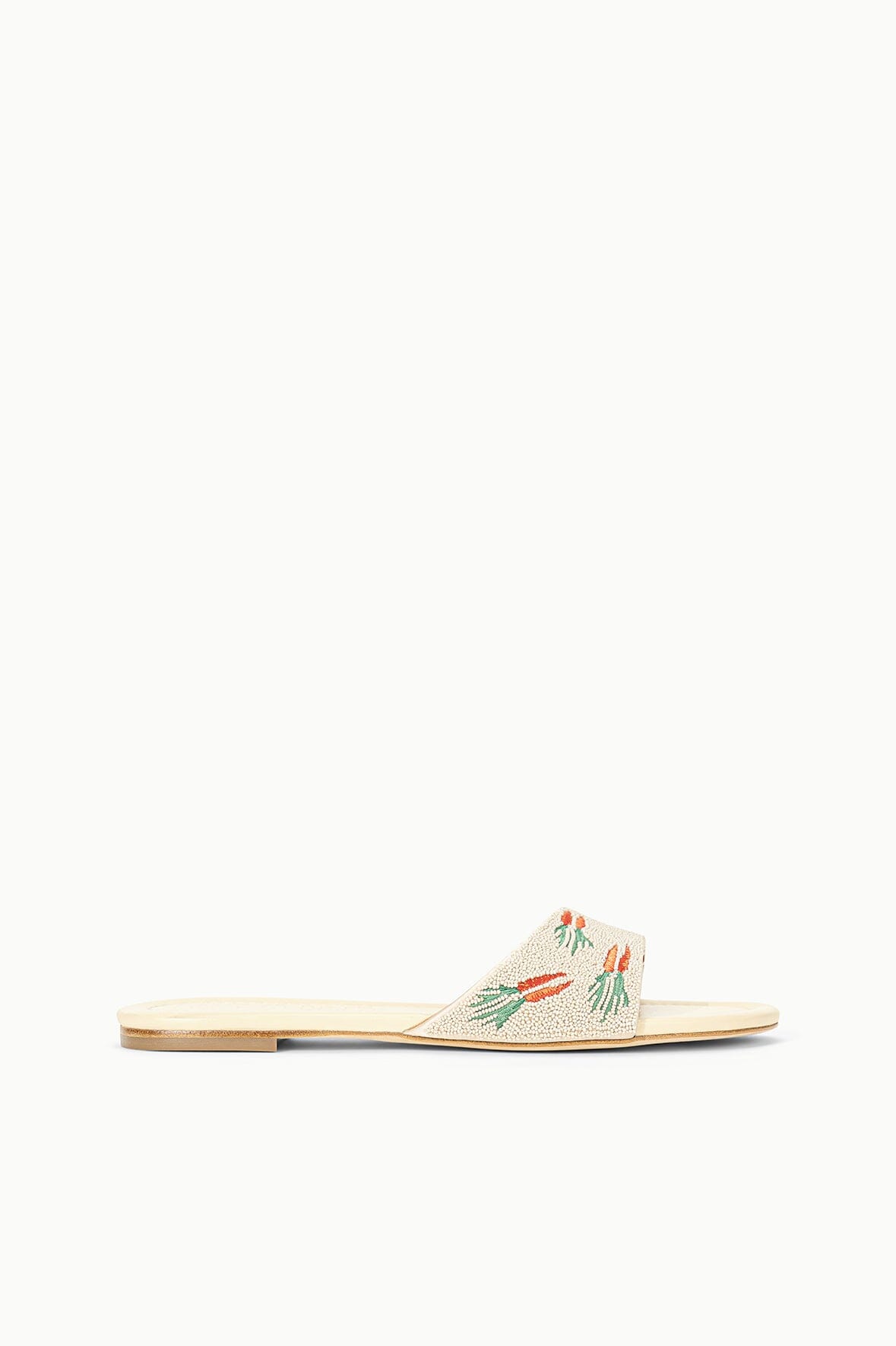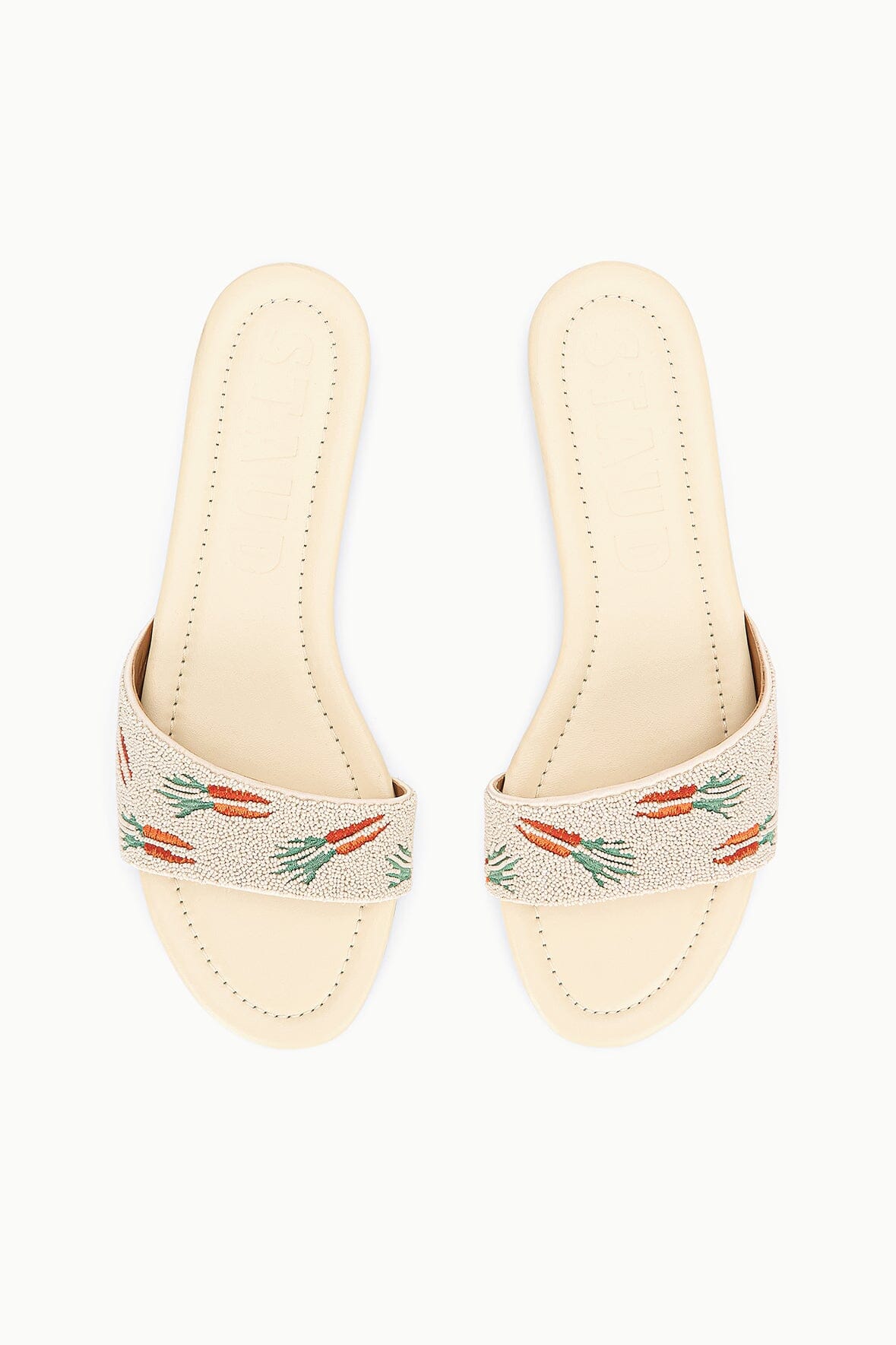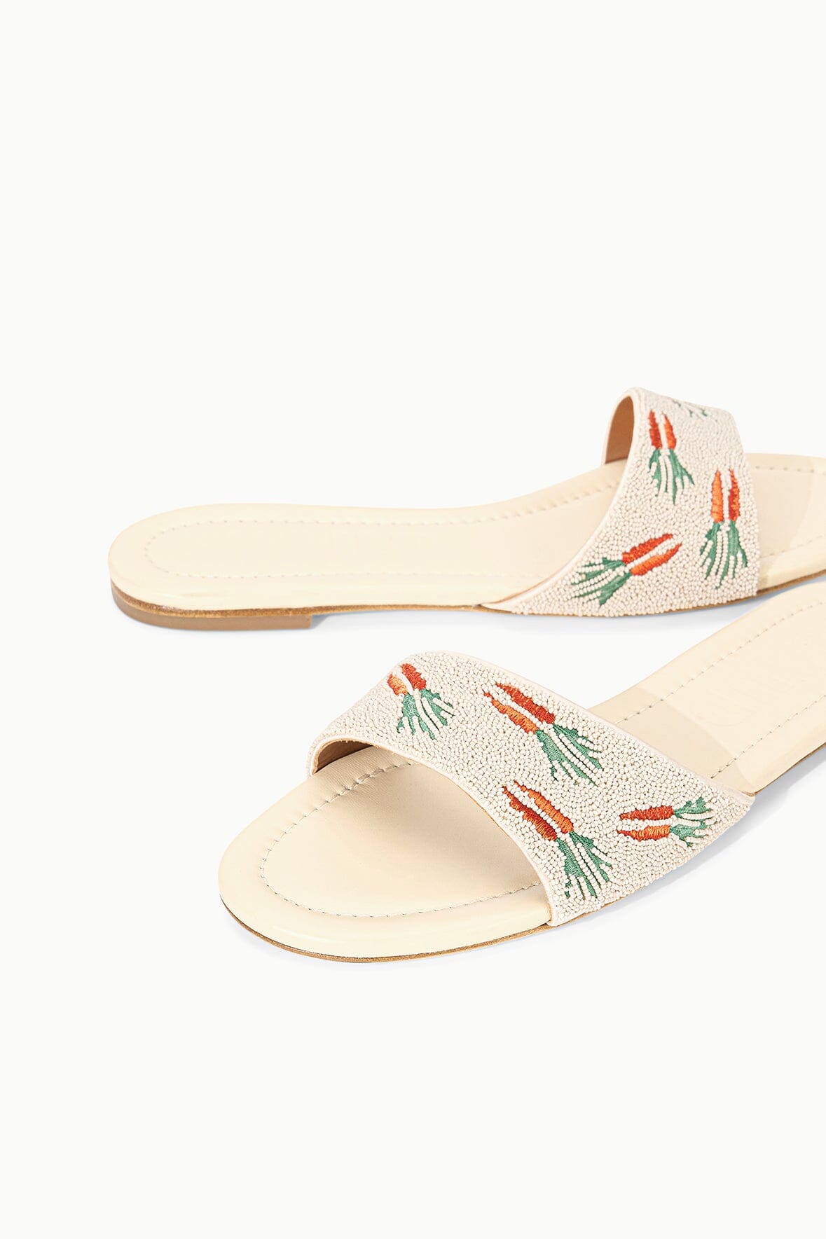 The Gracie Flat is a playful Summer slide featuring a seasonal carrot print. This style features a fully beaded and embroidered upper.