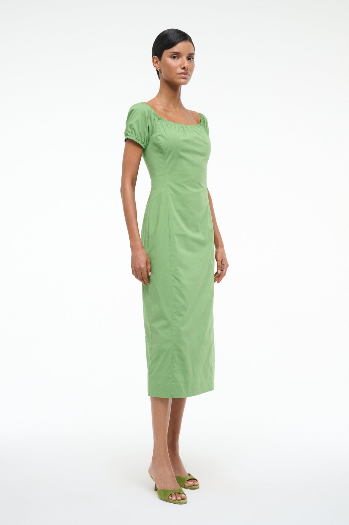 This is a short sleeve midi dress with a wide. stretchy neckline that can be worn on or off-the-shoulder. The Helene Dress features a center back slit and has a zip closure.