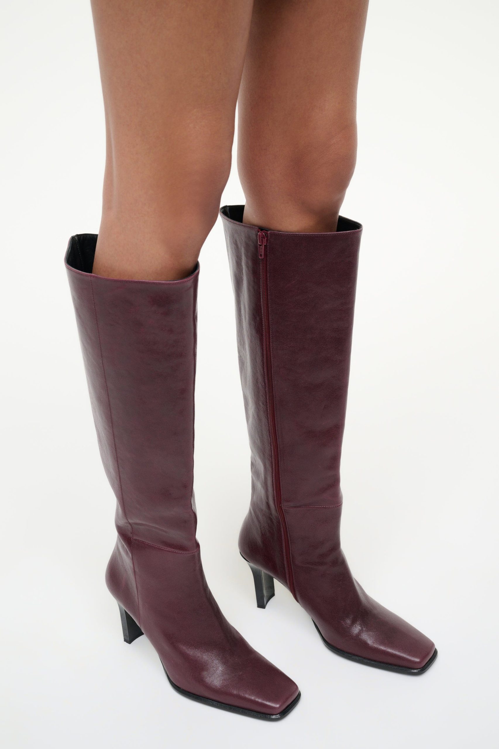 The Hendrix Boot is a high heel boot with an inside zipper and a square toe box. It features a wide blade heel and leather lining.
