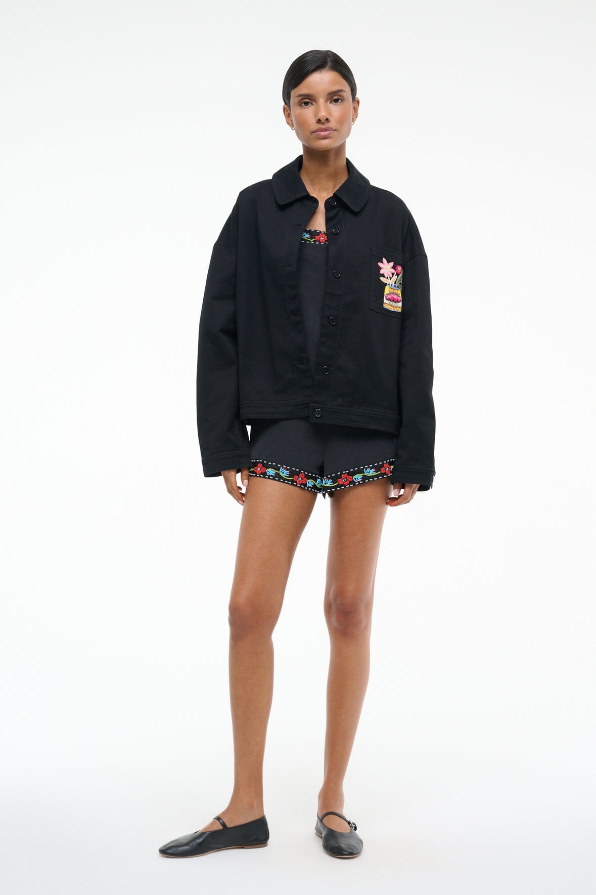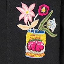 The Jane Jacket is a collard utility jacket with a front patch pocket featuring a seasonal embroidered motif.