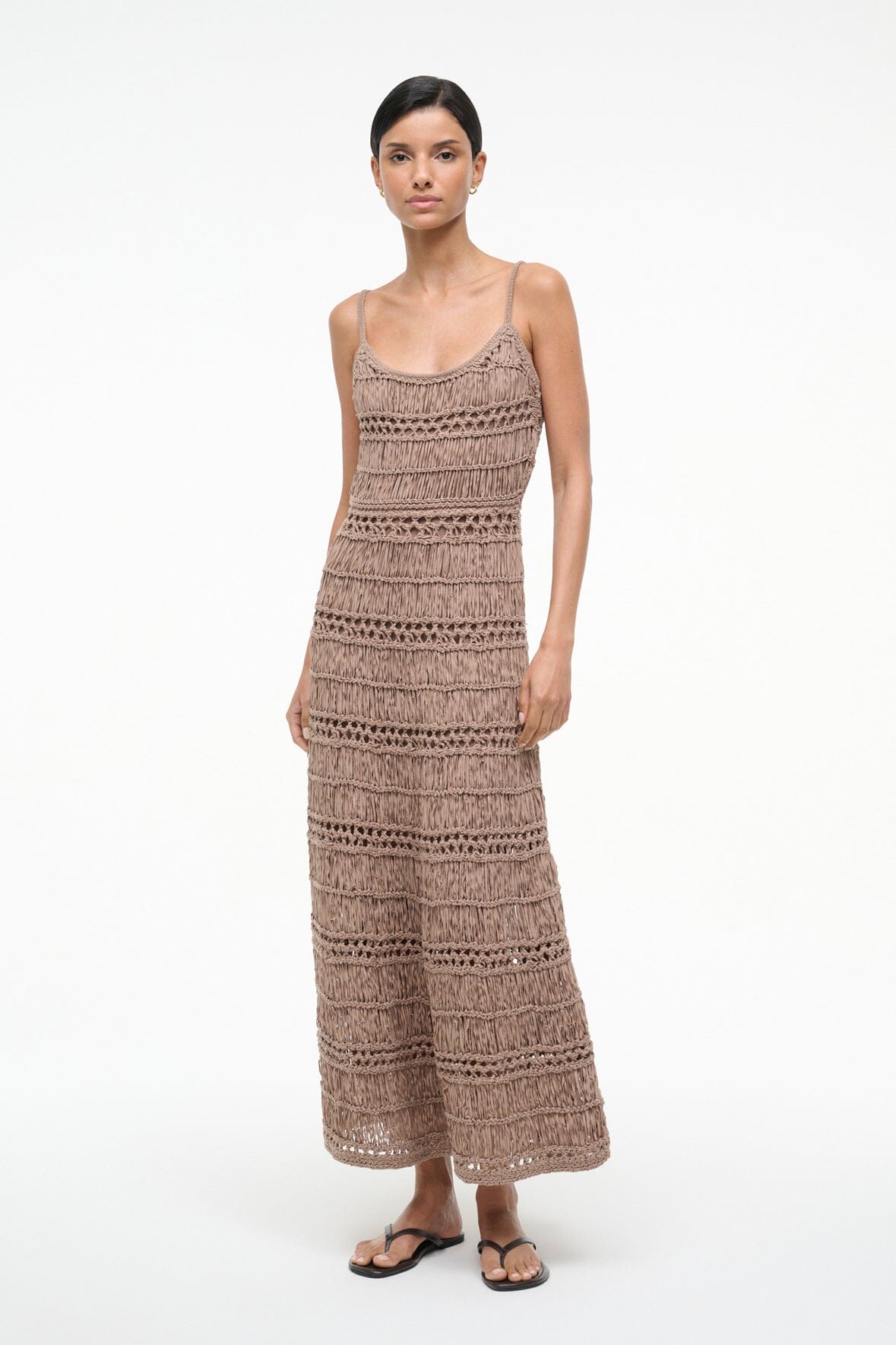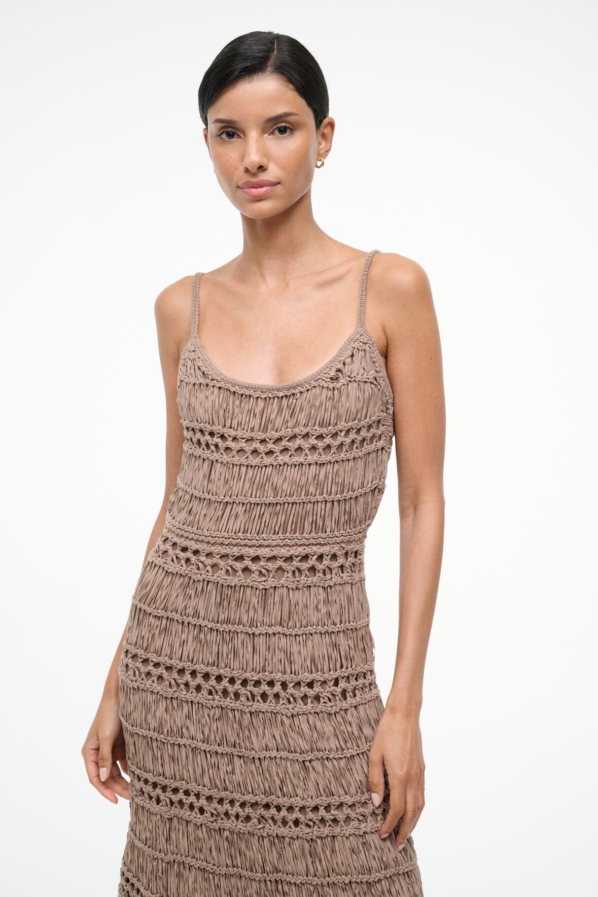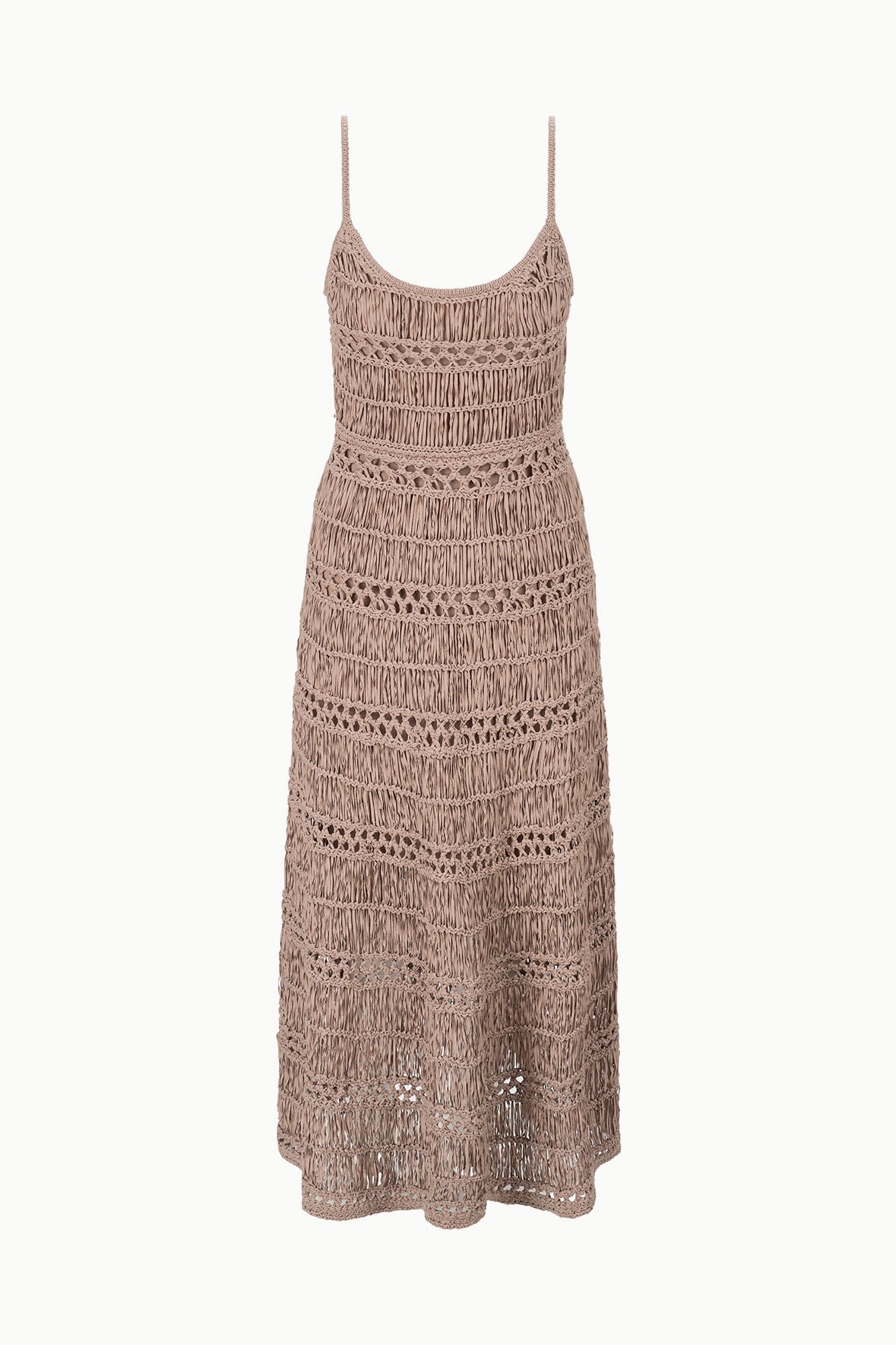 The Kingston Dress is a crochet tape yarn maxi dress. This style is fitted throughout the bodice and features thin spaghetti straps.