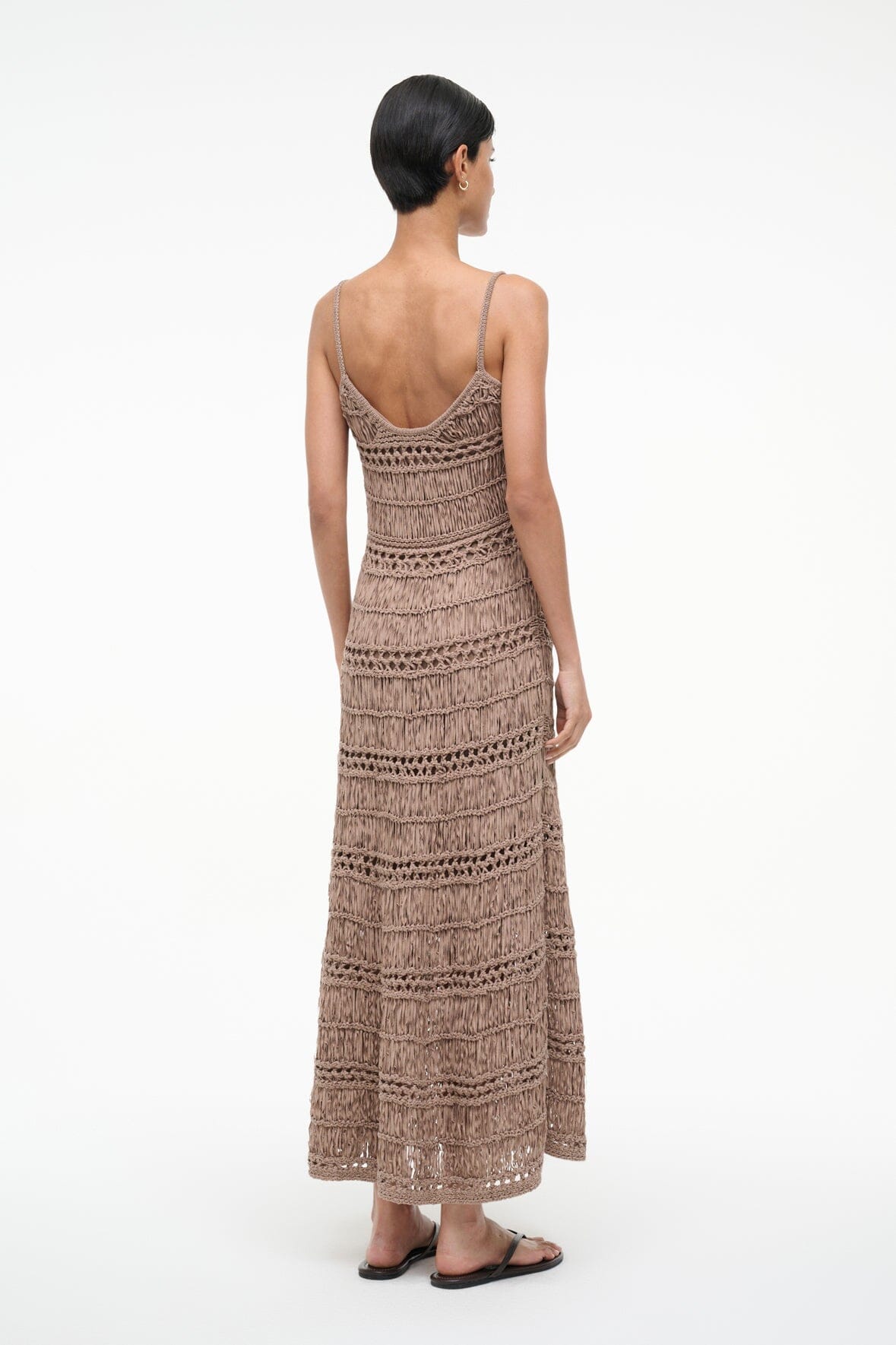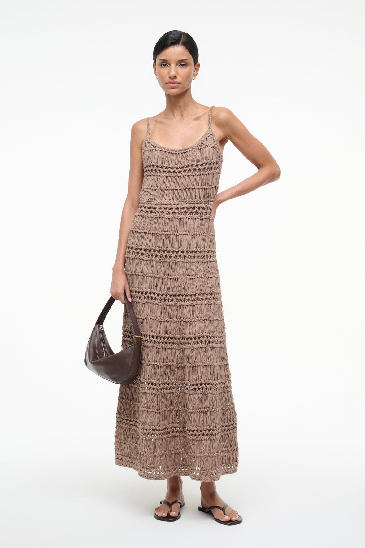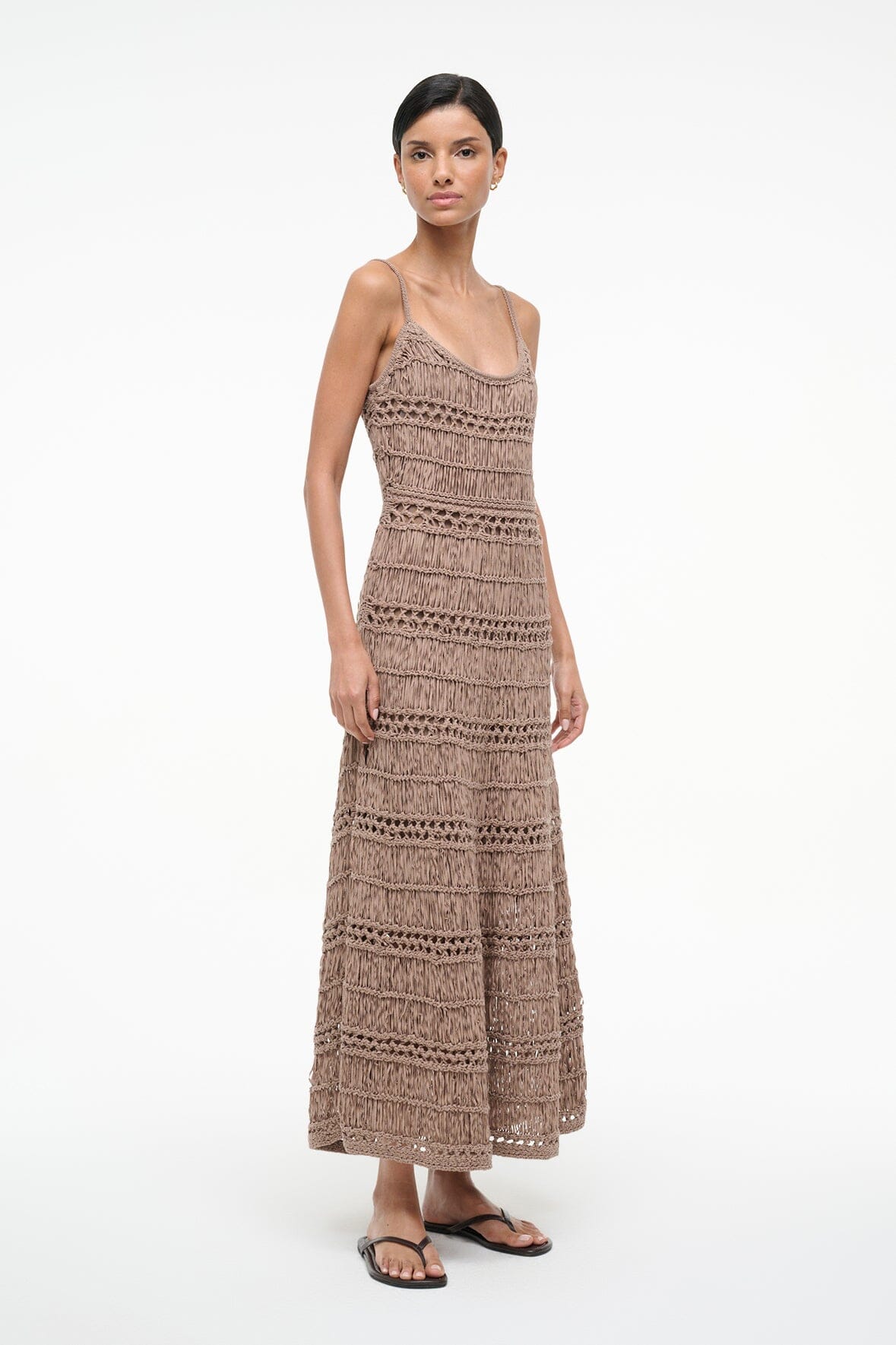The Kingston Dress is a crochet tape yarn maxi dress. This style is fitted throughout the bodice and features thin spaghetti straps.
