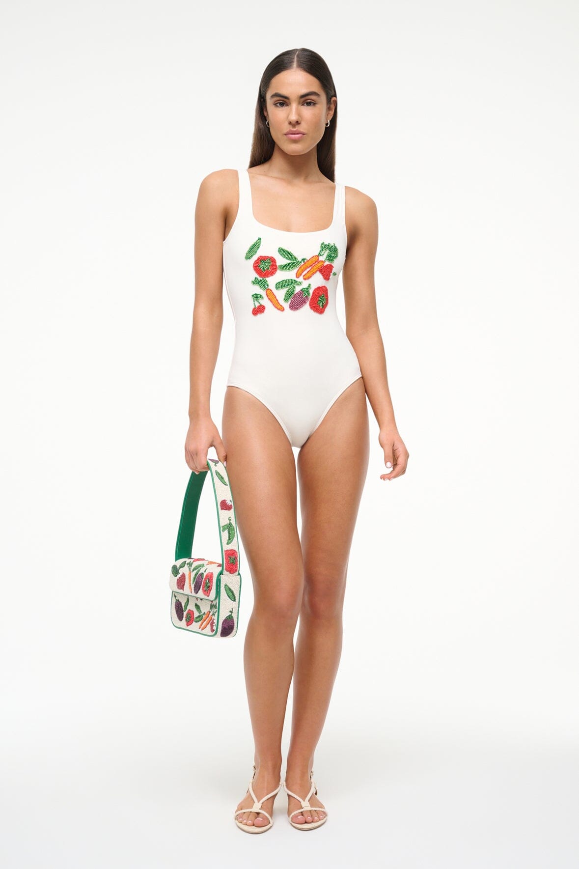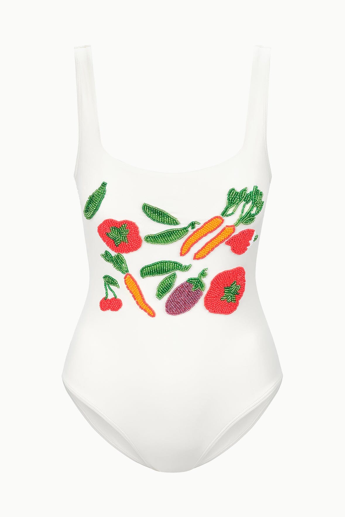 The Lea One Piece is a novelty one piece featuring our seasonal crudite pattern beaded at the front.