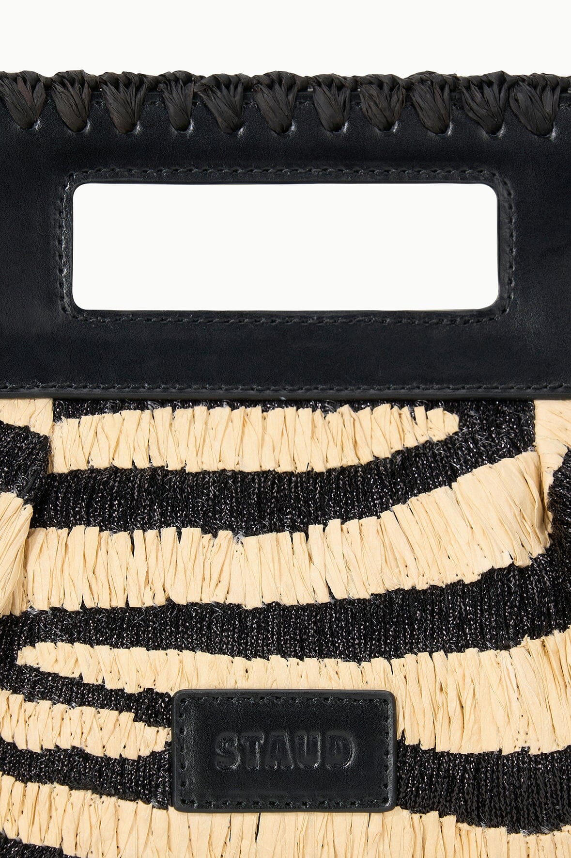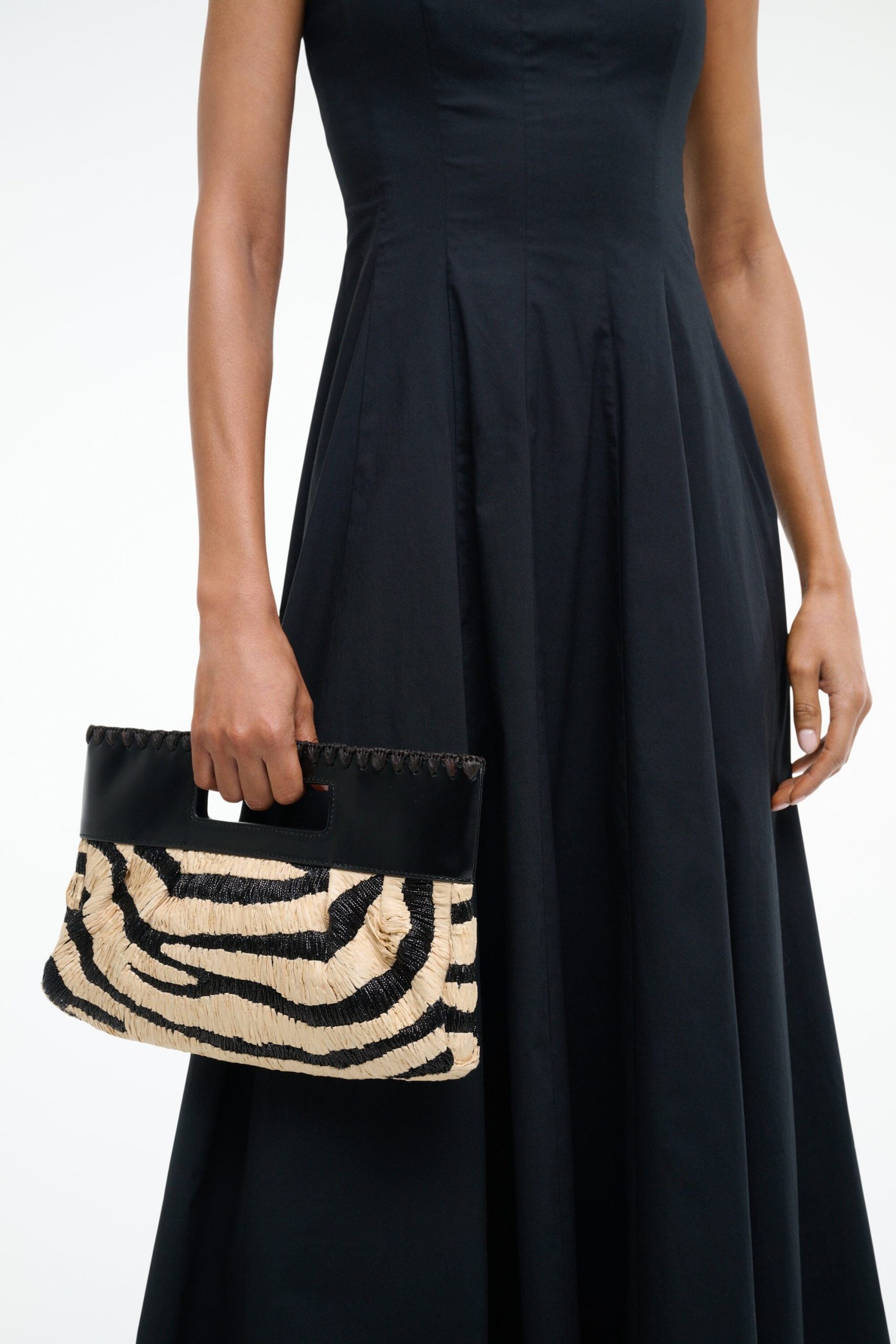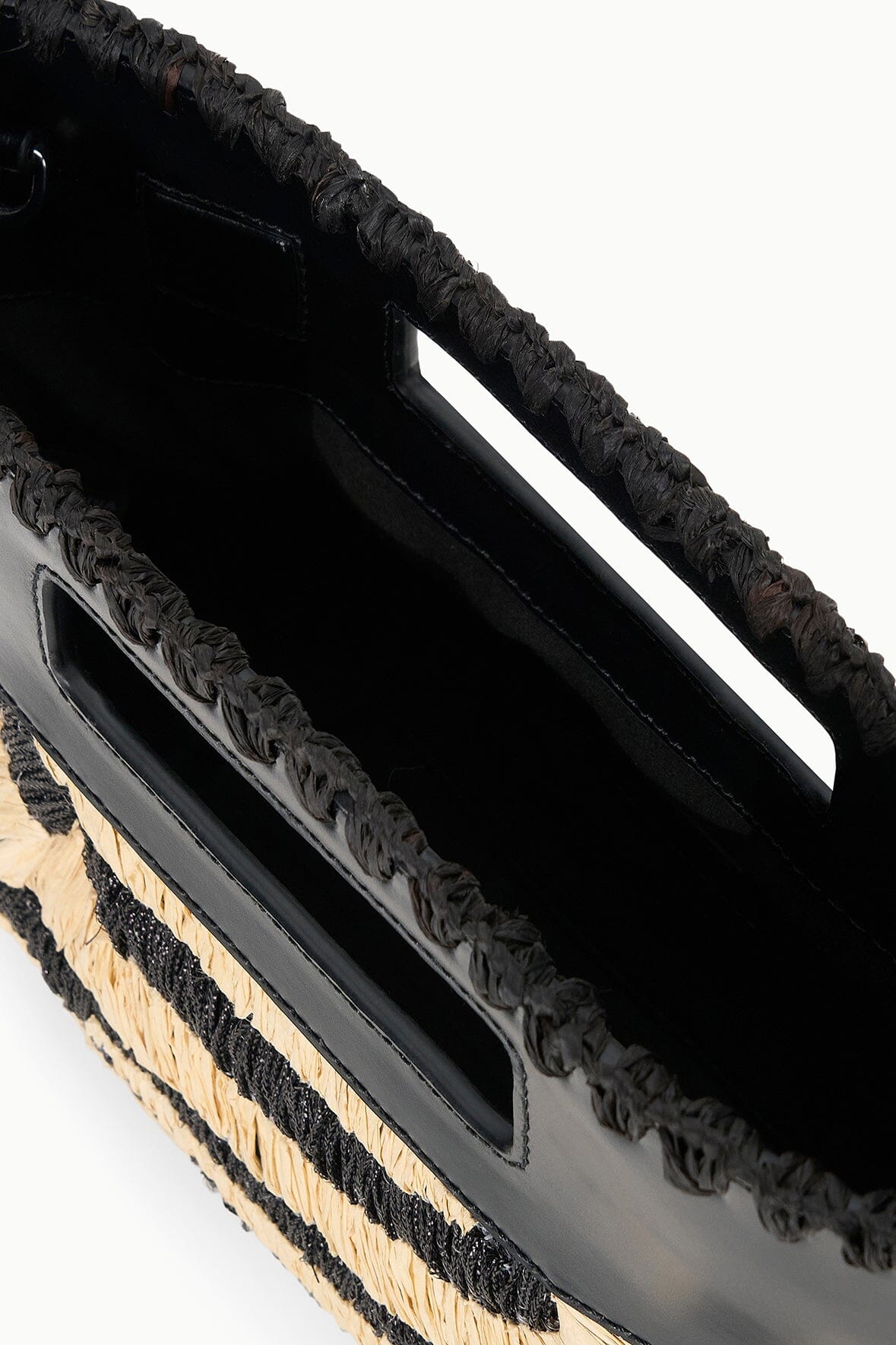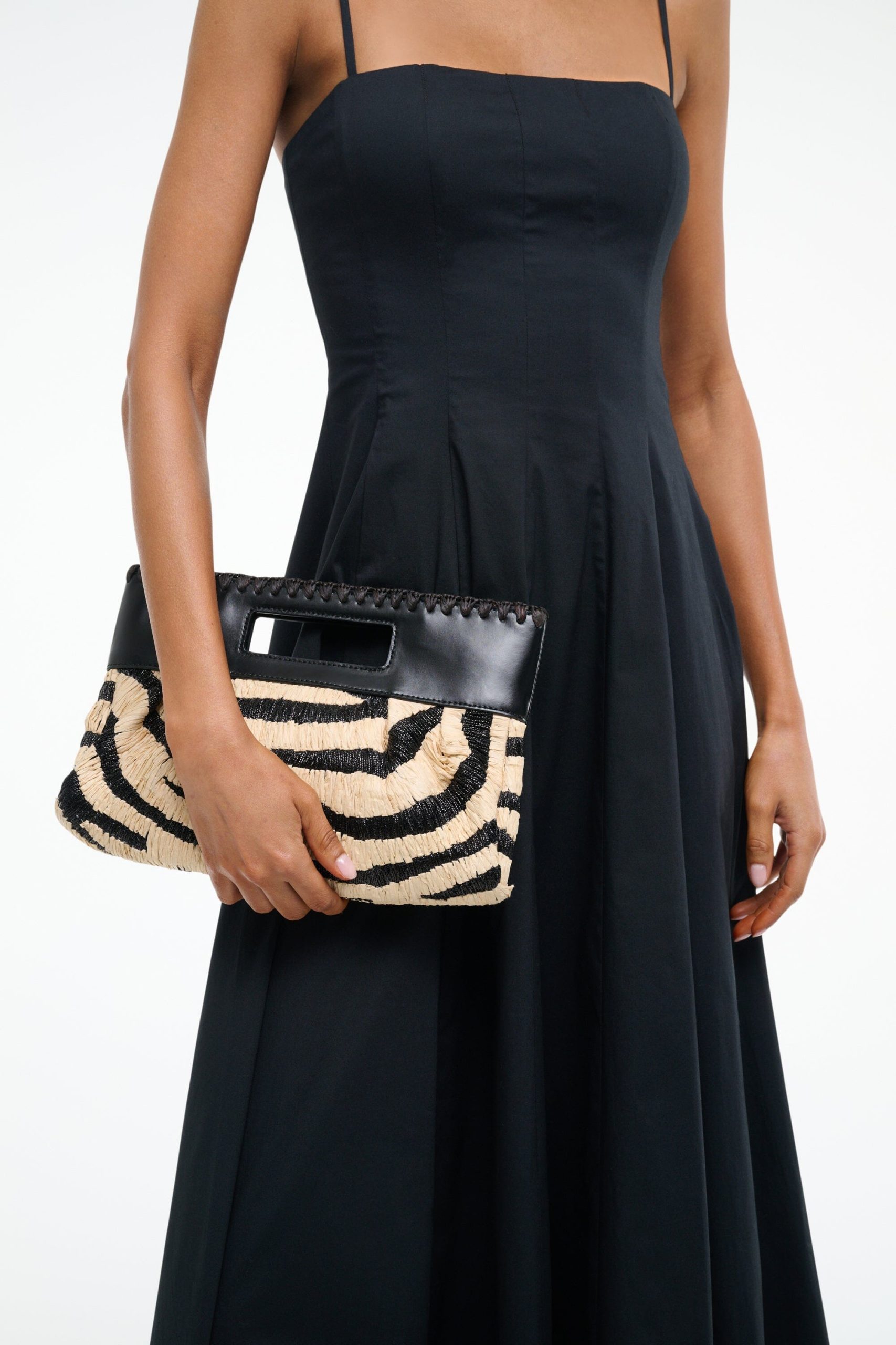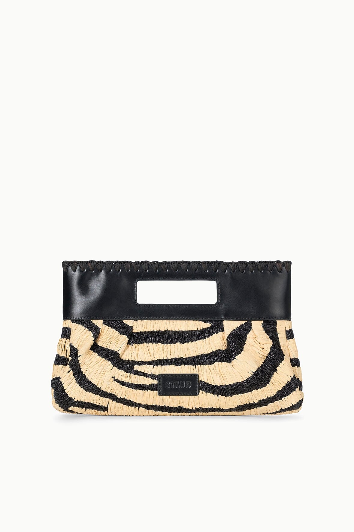 The Lena is a crochet raffia convertible clutch. featuring a removable long shoulder strap. leather handles. and a magnetic closure.