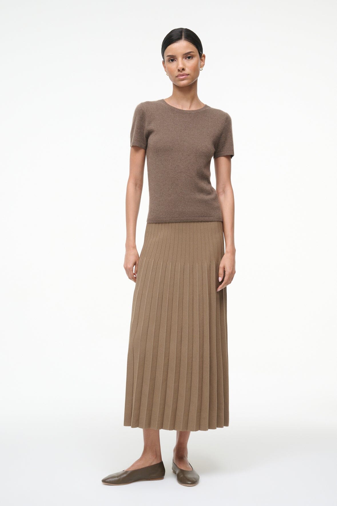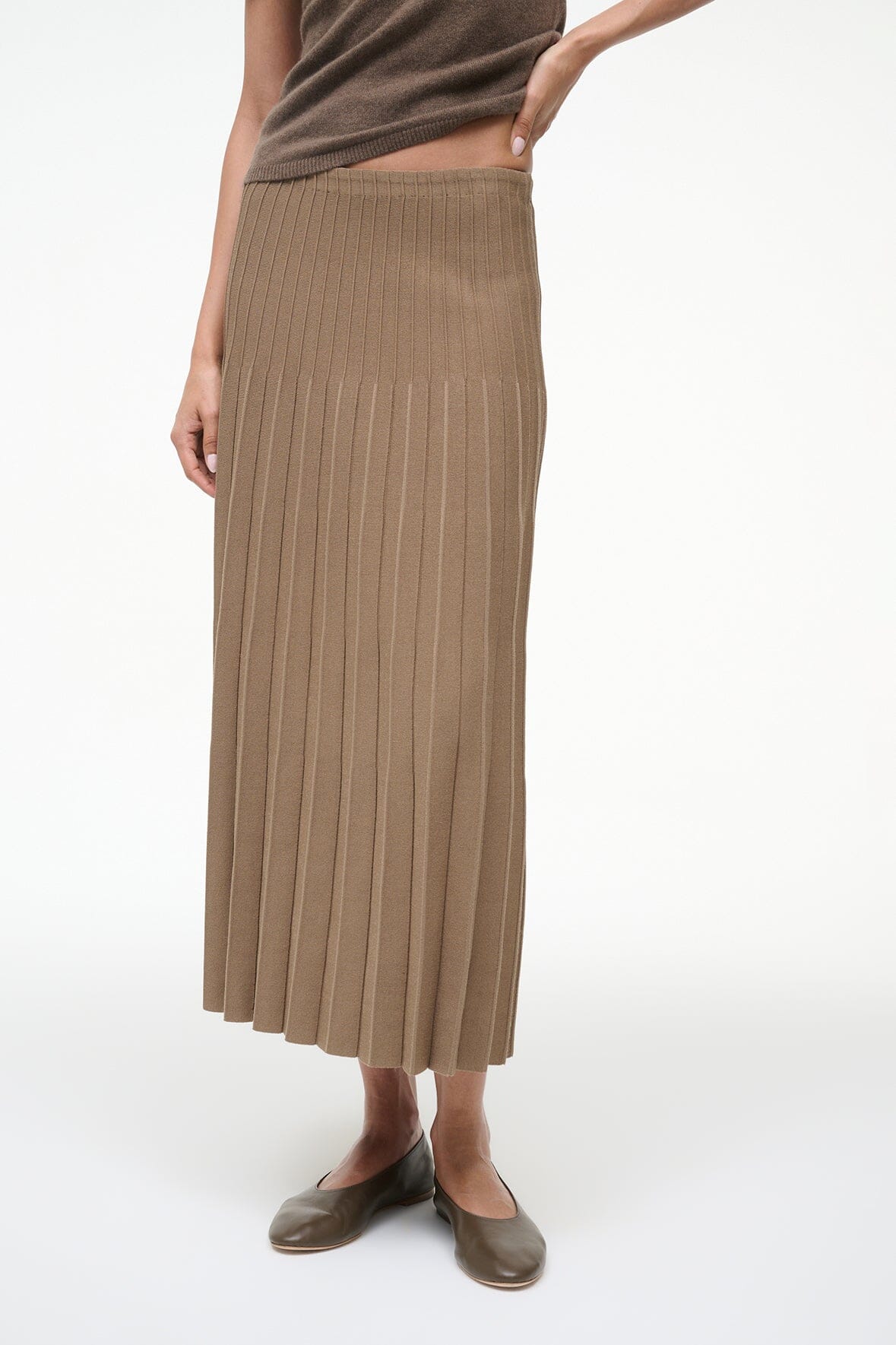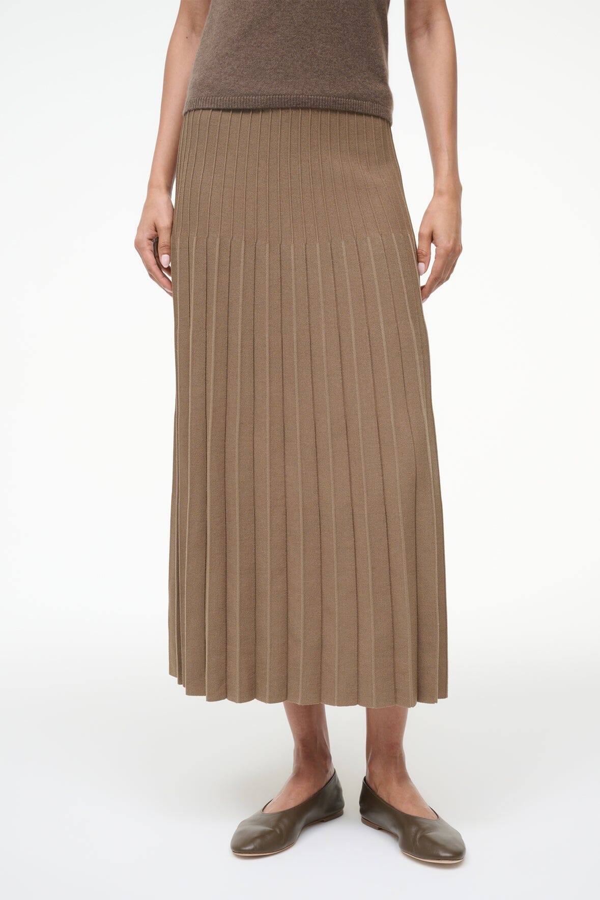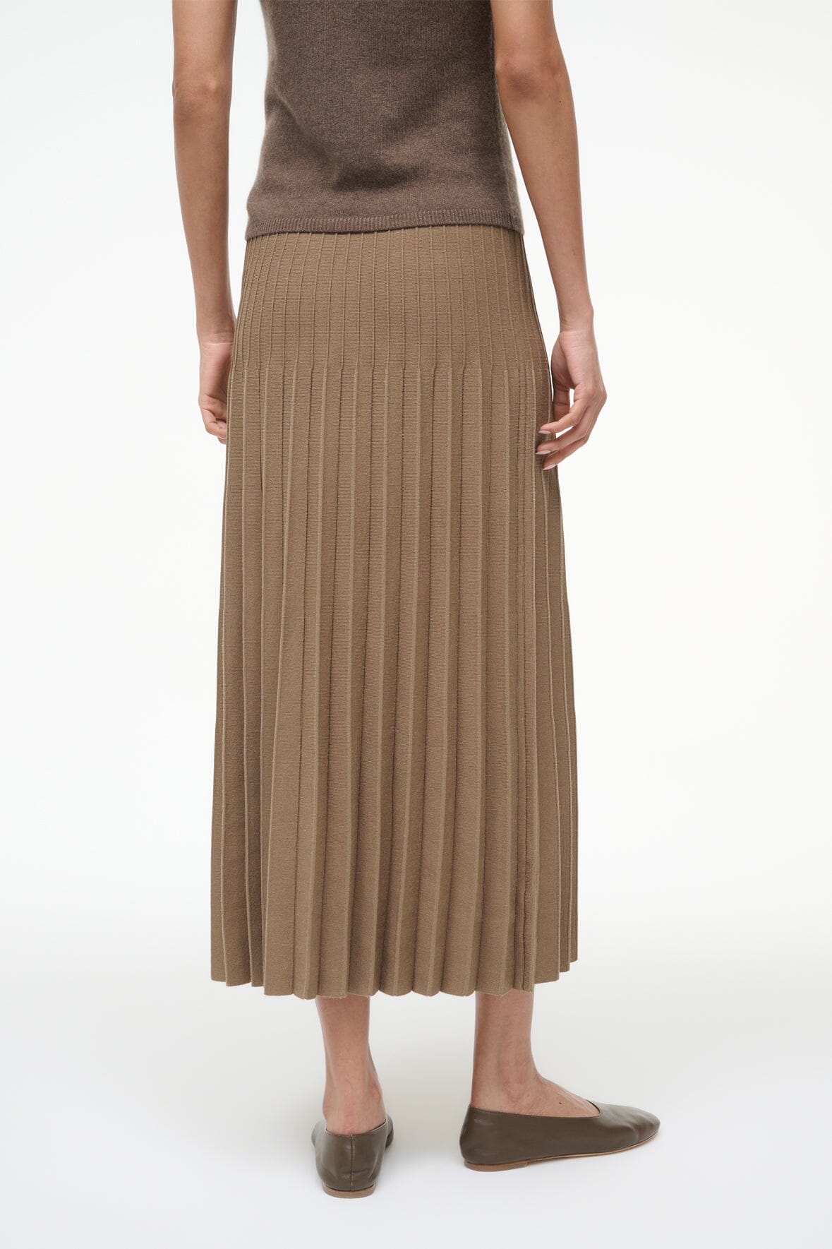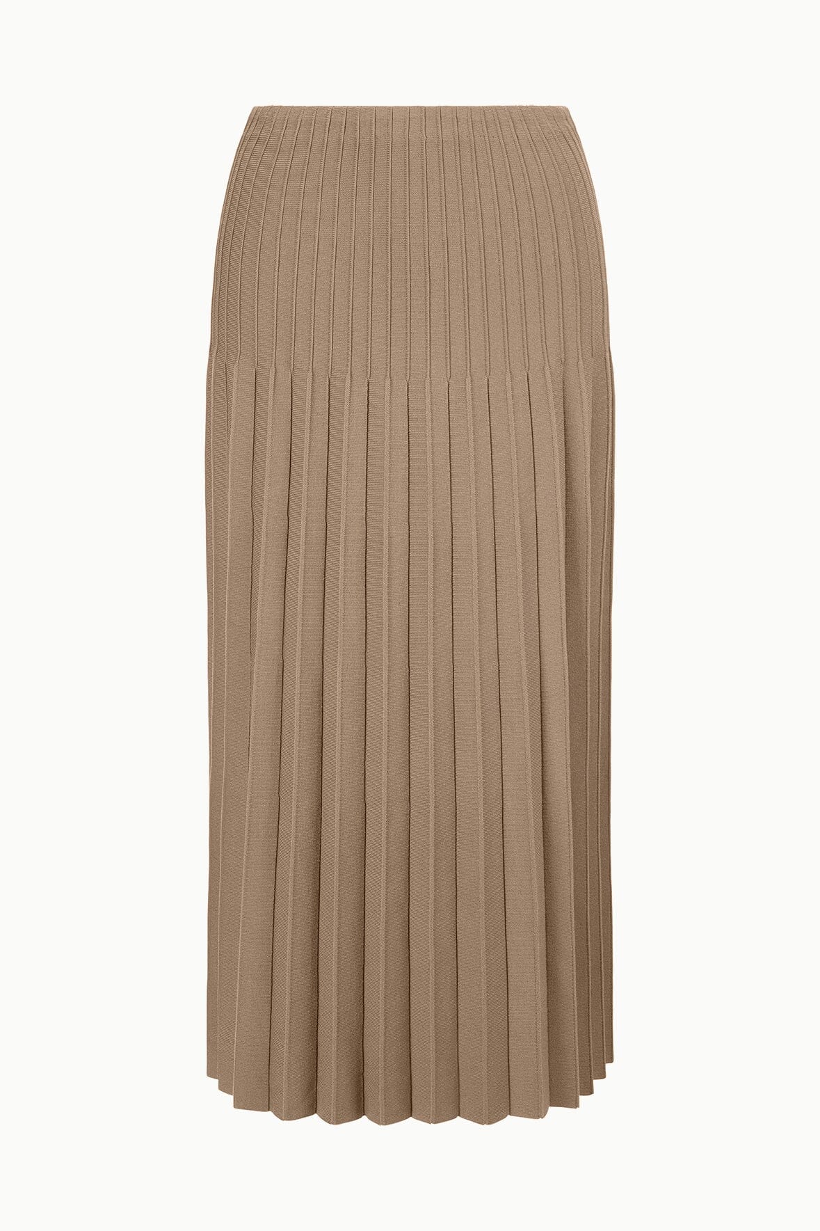 The Lena Skirt is an easy compact knit midi length skirt with pleats and ottoman stitch detailing at the waist.