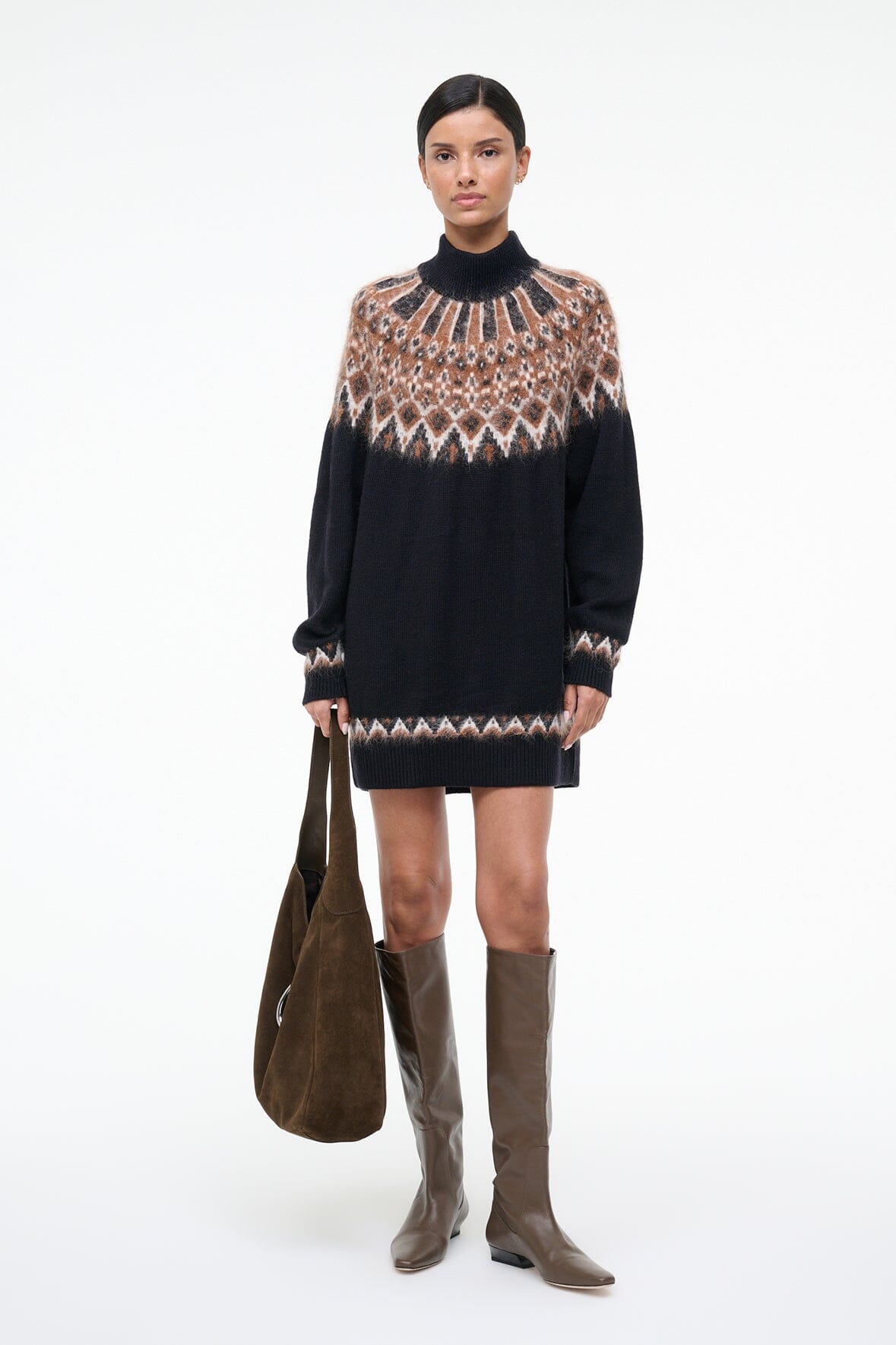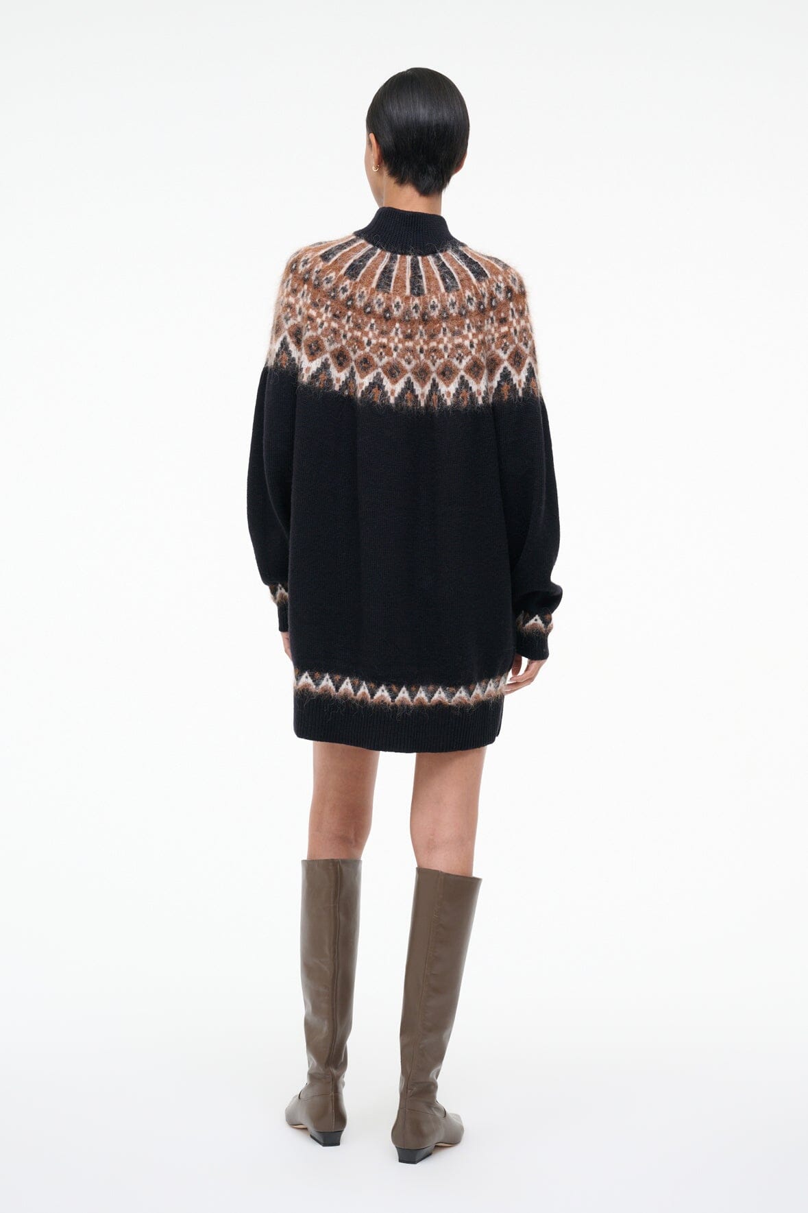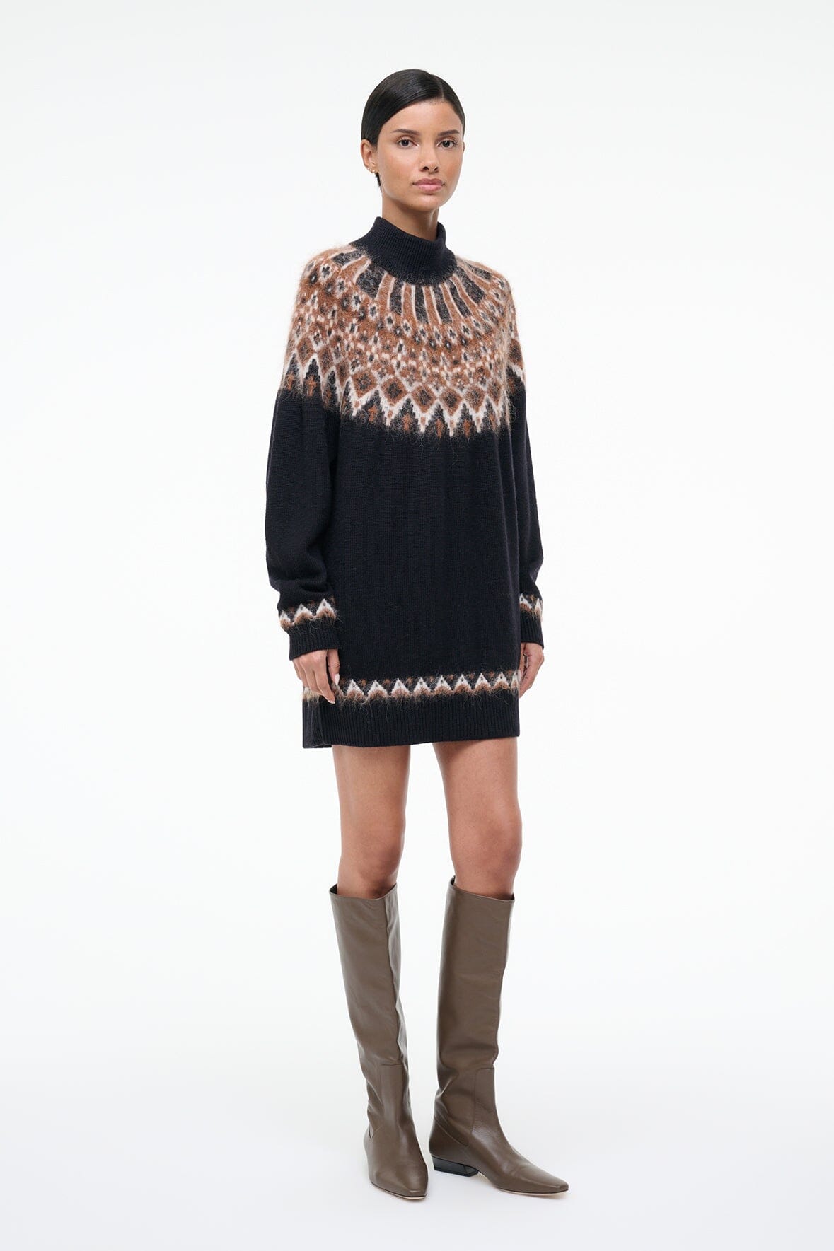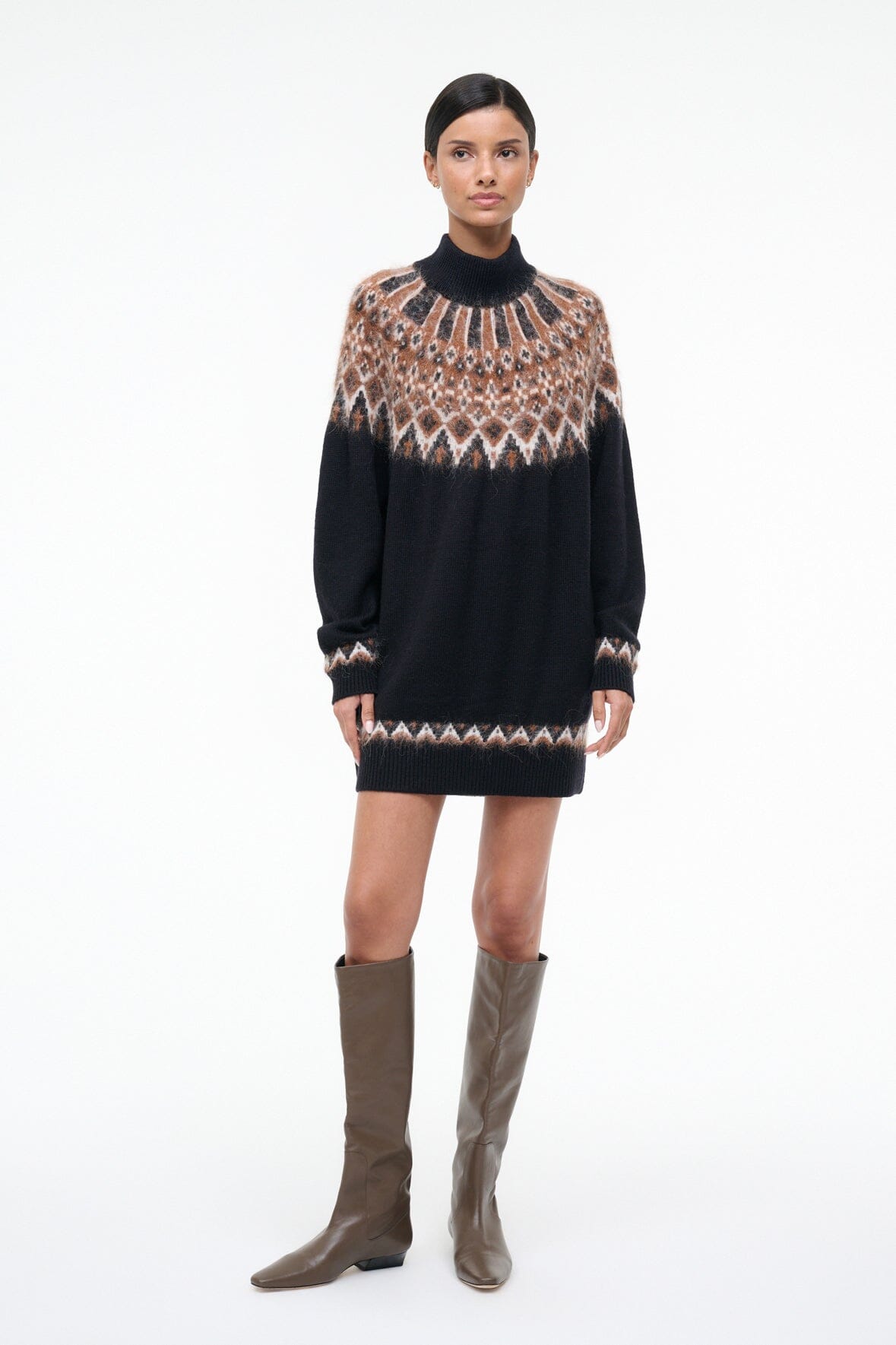 A cozy wool blend turtleneck dress. the Liza features a fairisle jacquard pattern and slightly boxy fit.