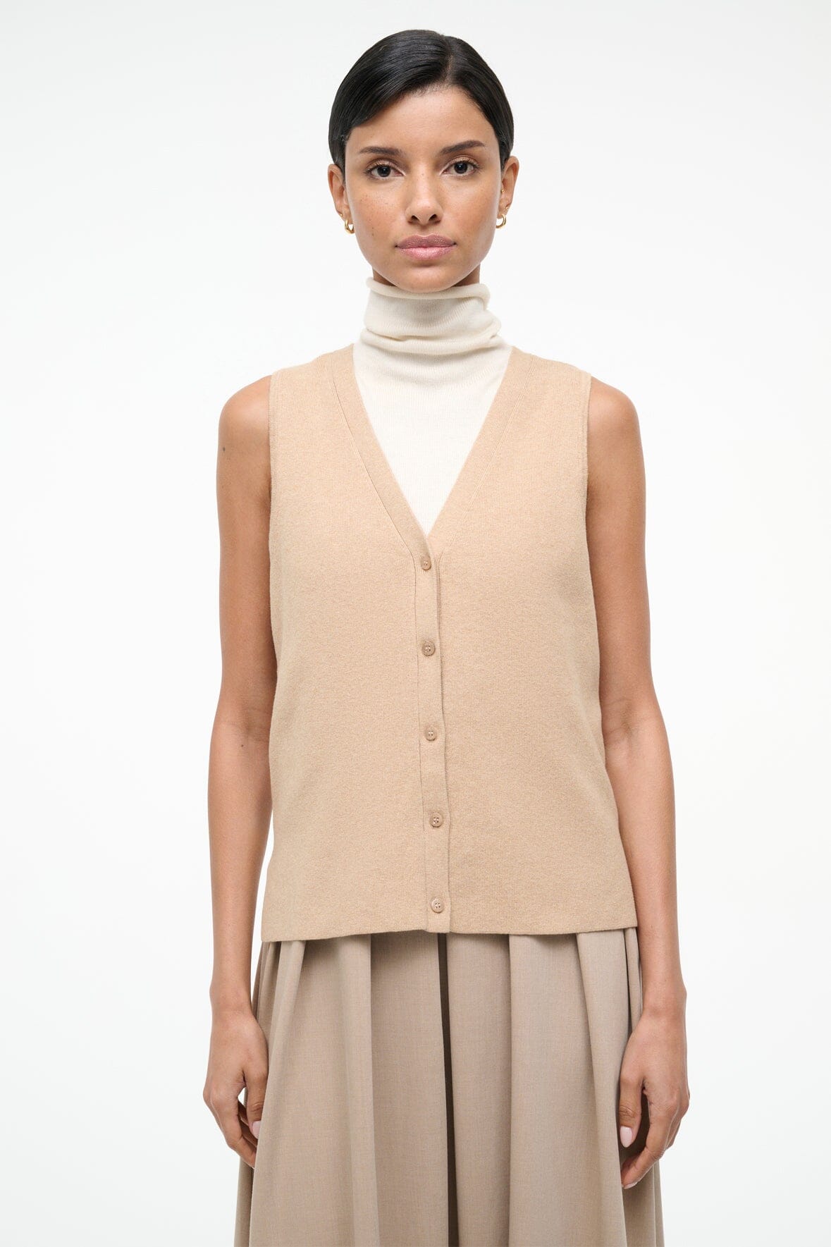 The perfect transitional dress. this pre-styled cotton and cashmere piece offers a pre-styled woven skirt and fully fashioned sleeveless knit vest.