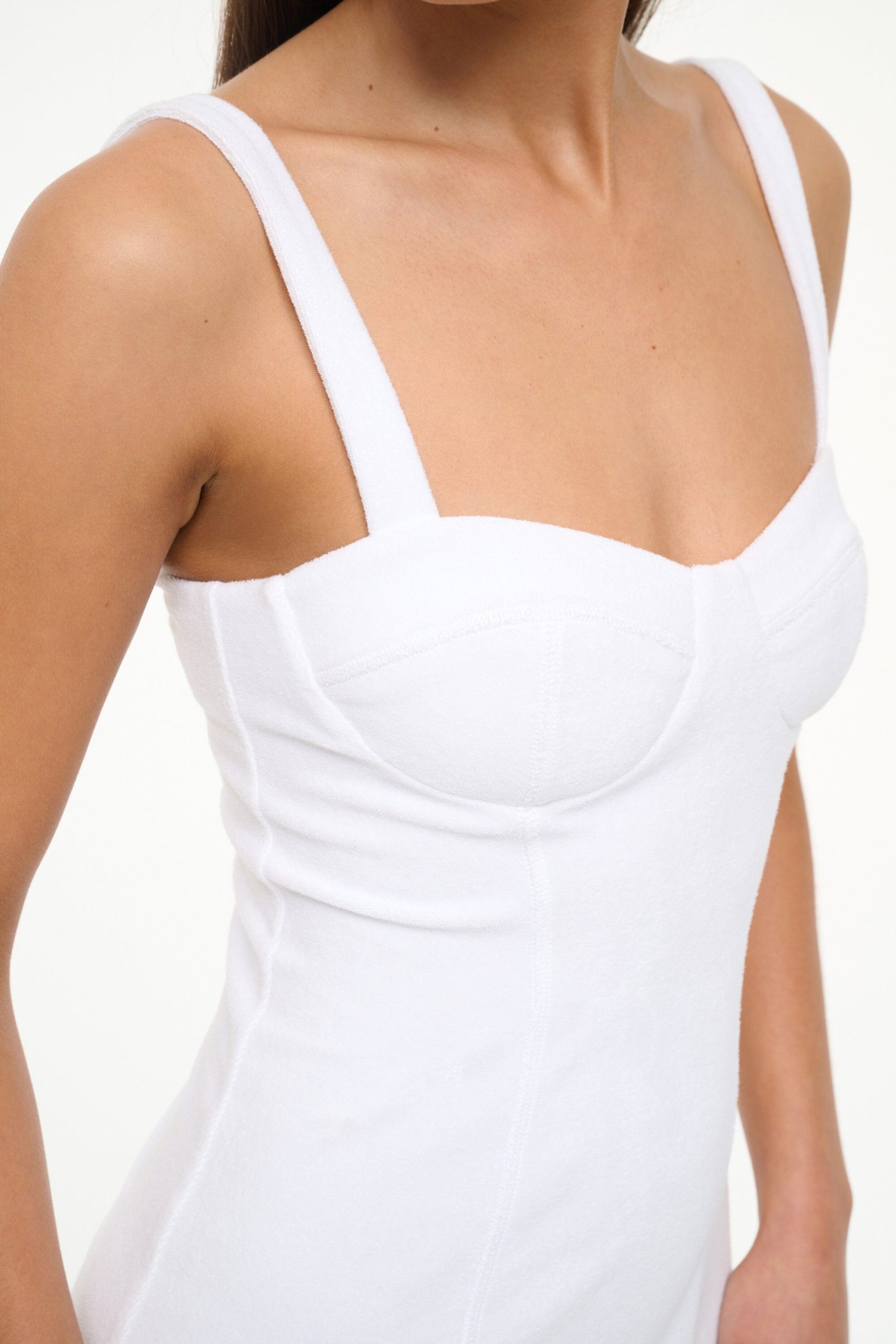 The Marilyn Dress is a terrycloth swim coverup mini dress. featuring bustier detailing and princess seams.
