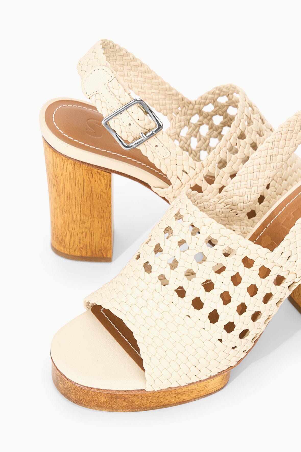 The Martina Platform is a new block heel sandal for Spring. This style features a wooden sole and a woven leather upper. with an adjustable ankle strap.