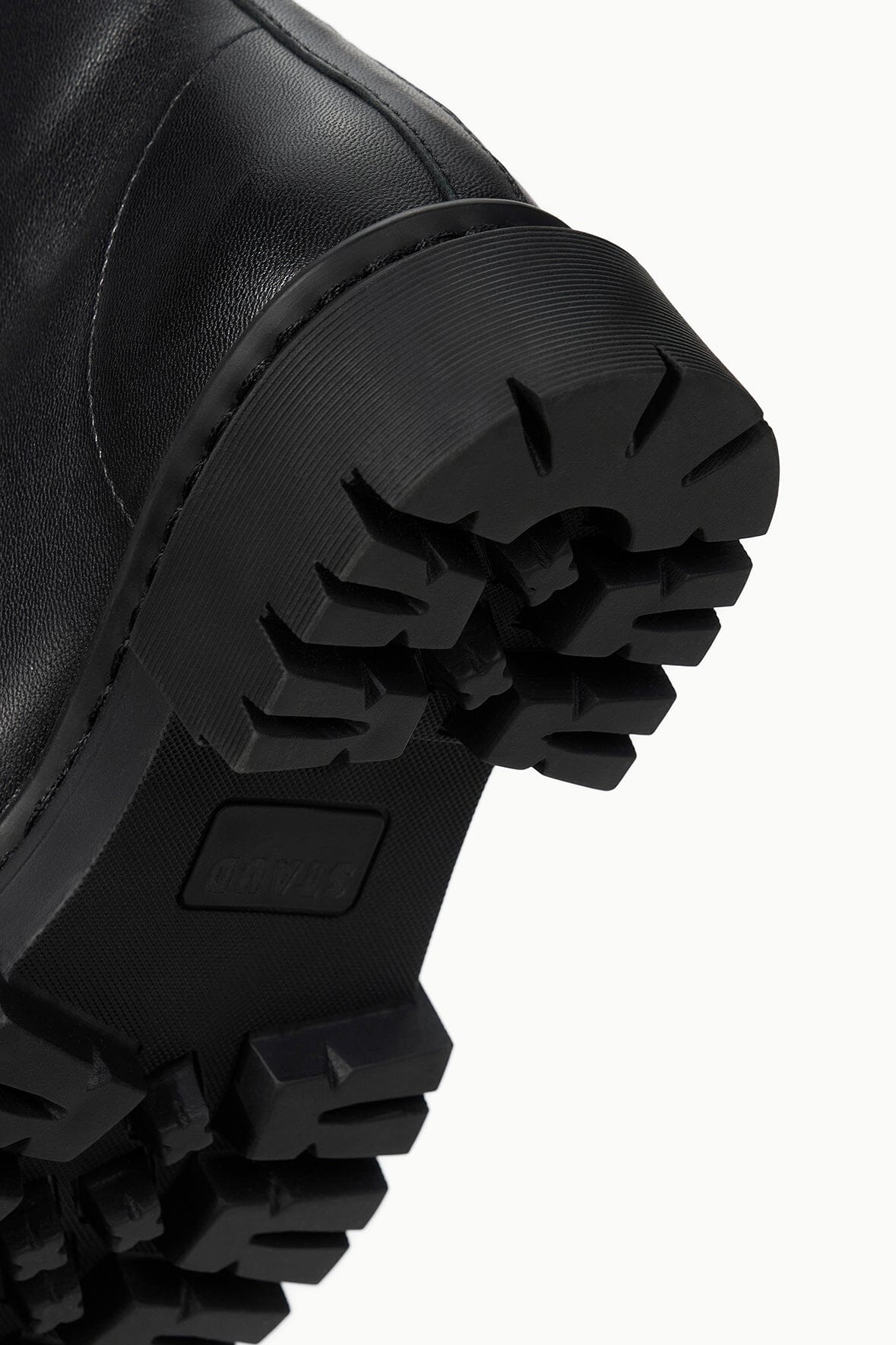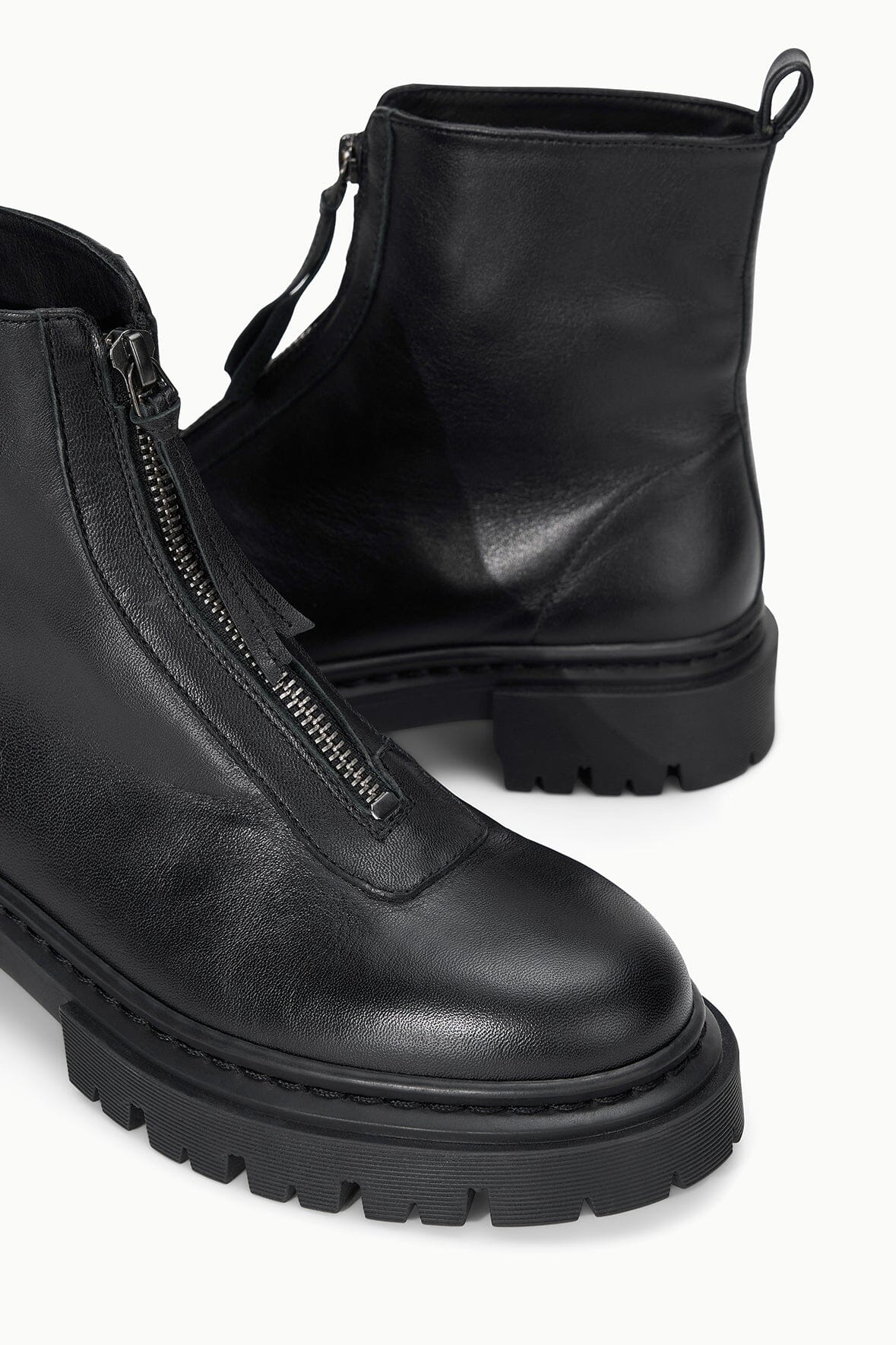 The Miles is a nappa leather combat boot with a zip front. pull tab and an all-weather lug sole.