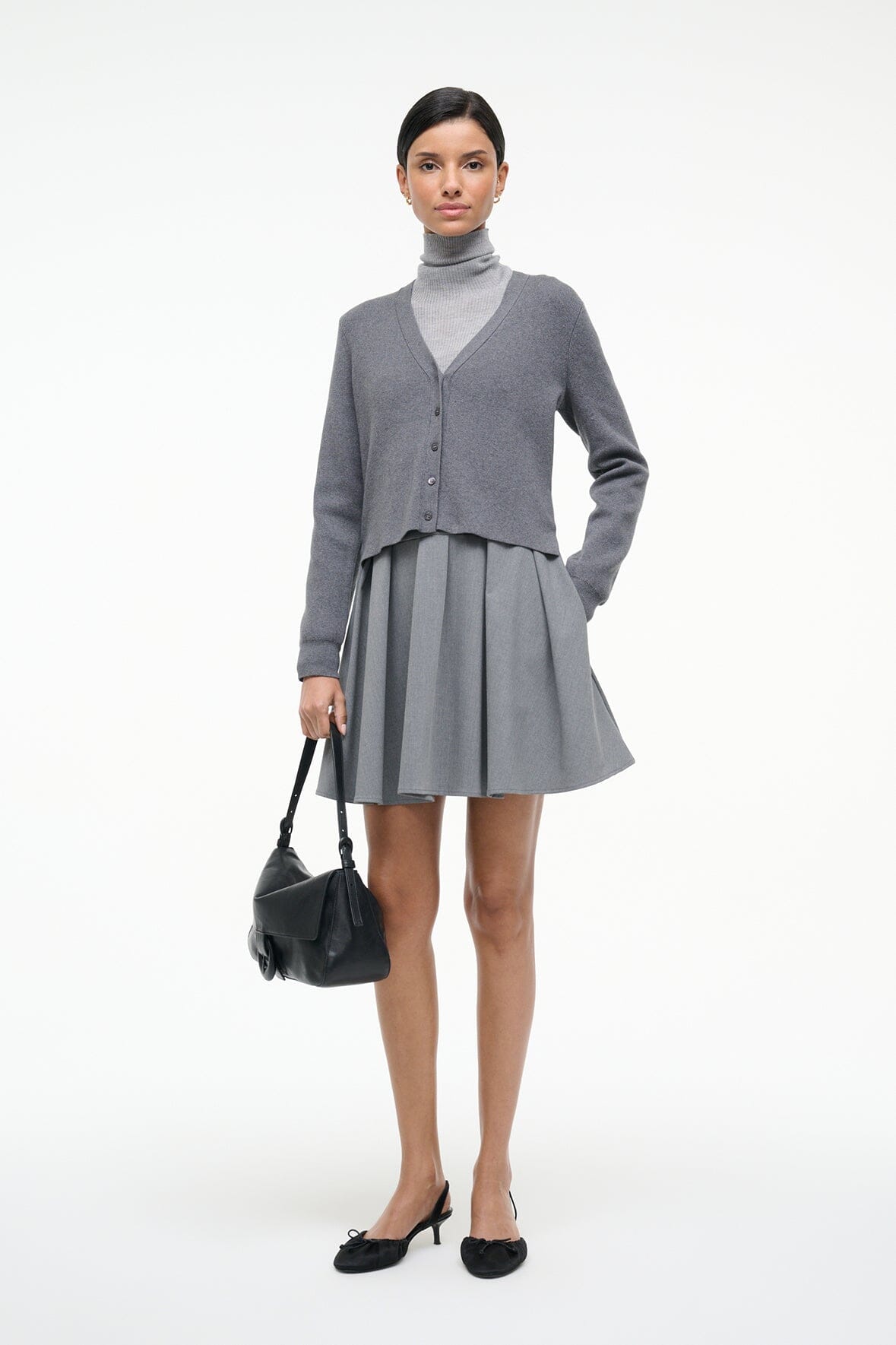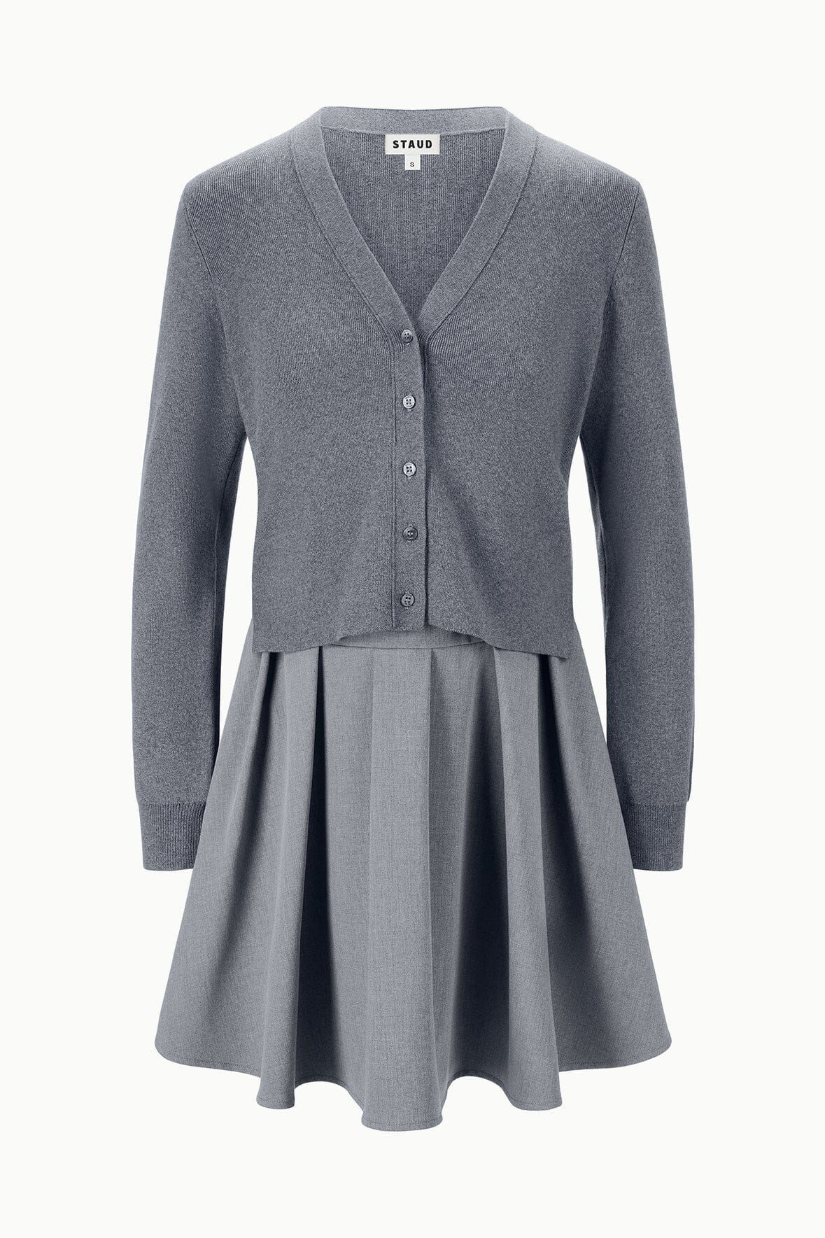 The Milo Dress is a mixed media mini dress. with a woven tonal skirt and a full-fashioned long sleeve cardigan in our cotton cashmere.