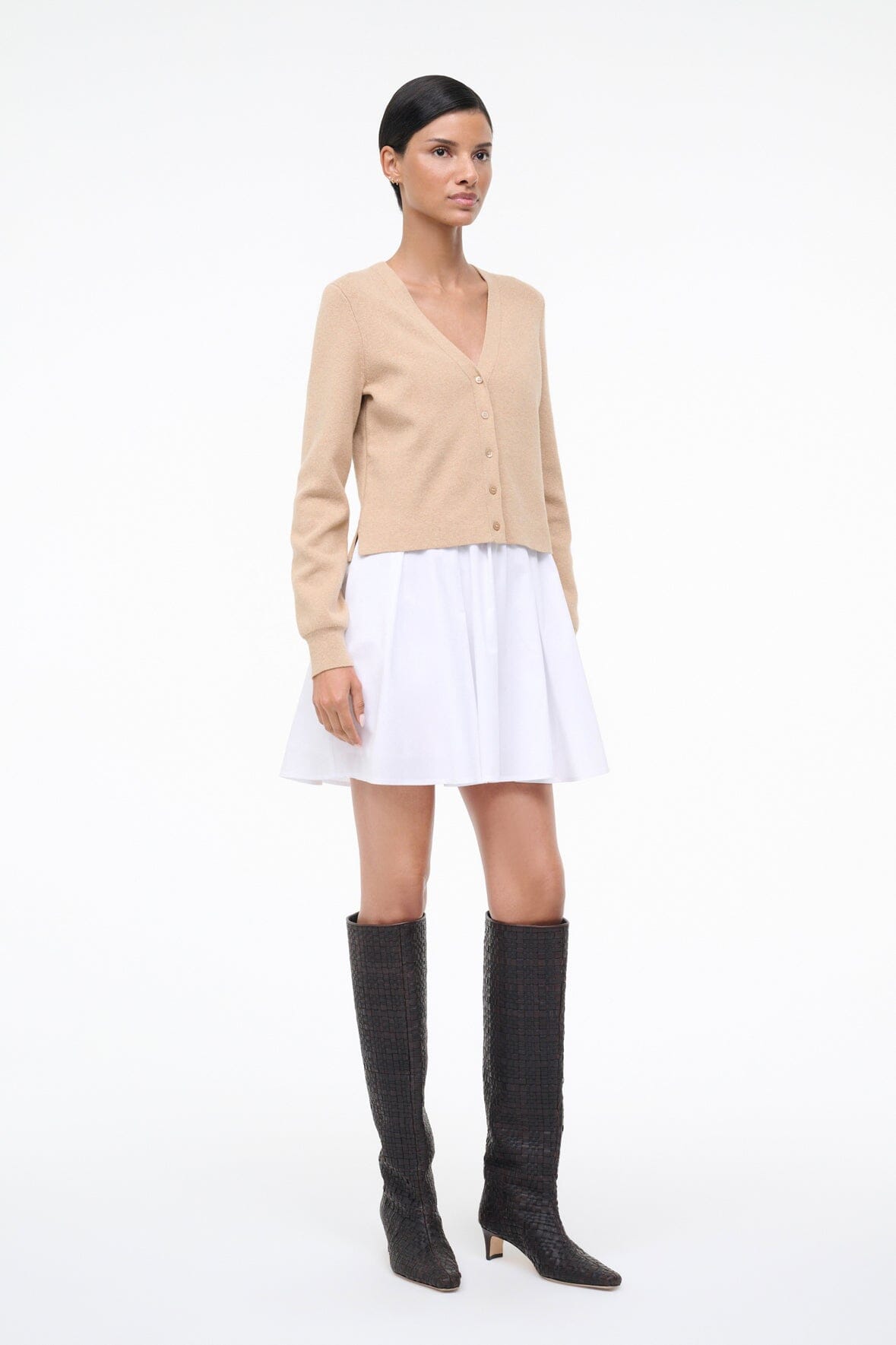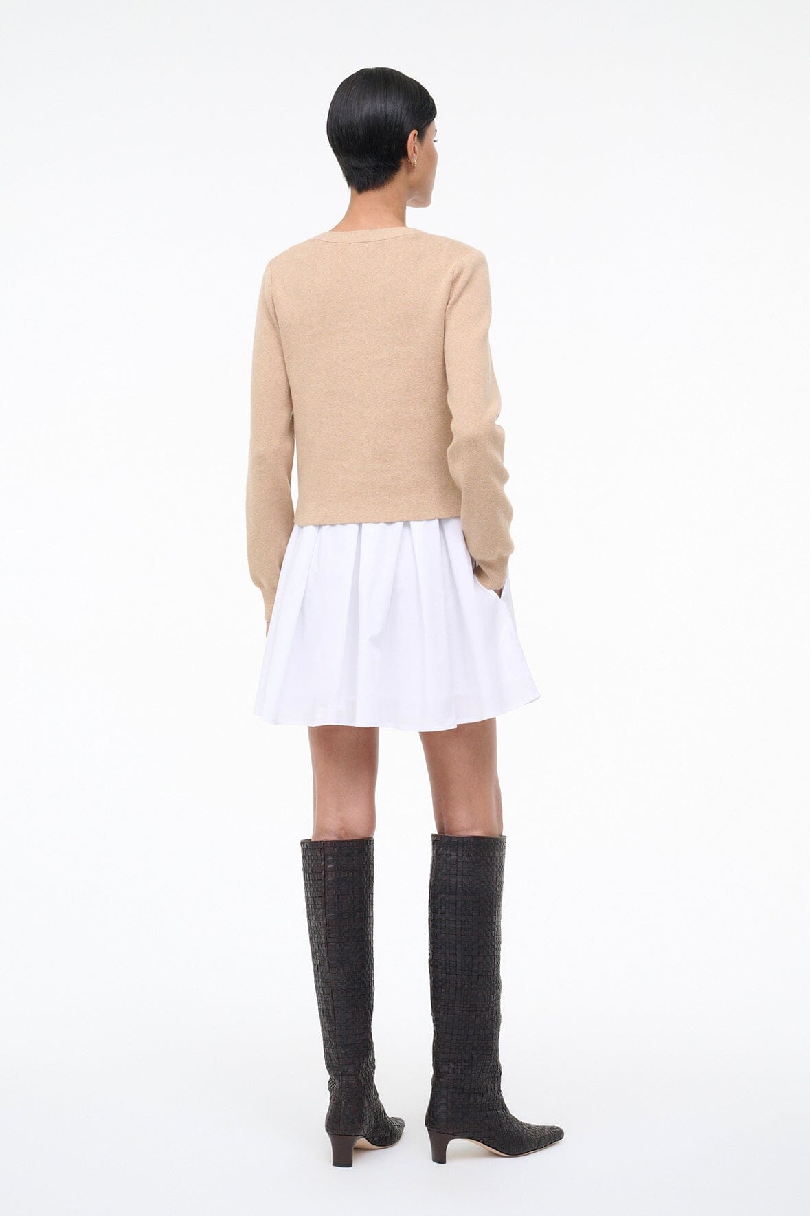The Milo Dress is a mixed media mini dress. with a cotton poplin skirt and a full-fashioned long sleeve cardigan in our cotton cashmere.