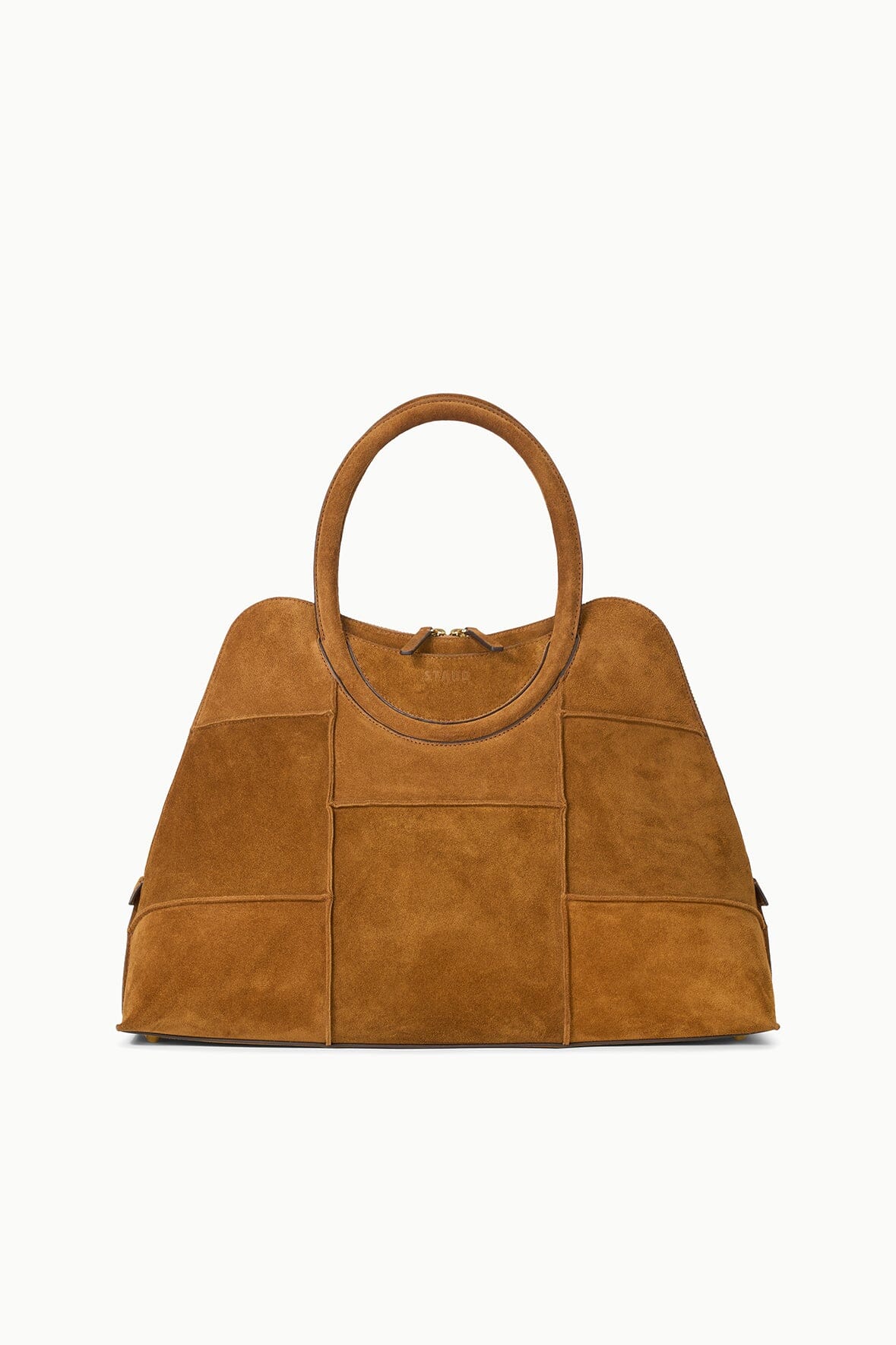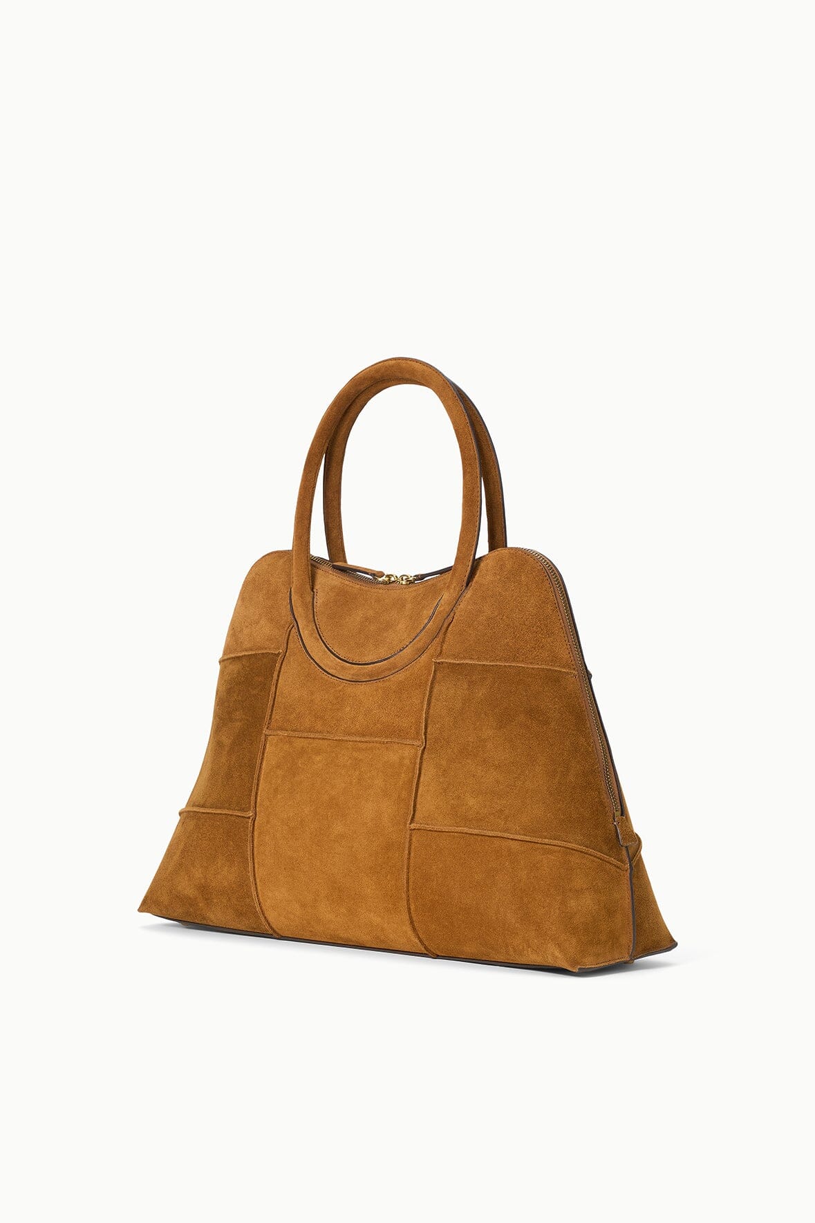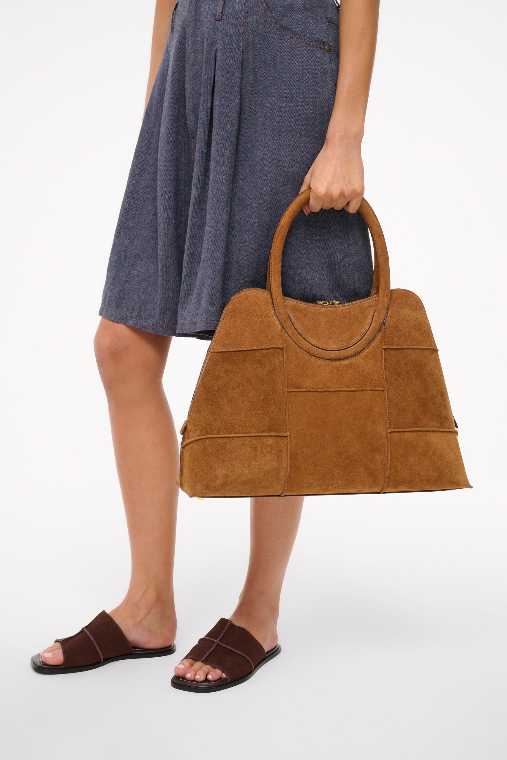 The Naomi Satchel is a new shape featuring our signature moon handles. This style is offered in our seasonal patchwork suede and features a double zipper and a front pocket.