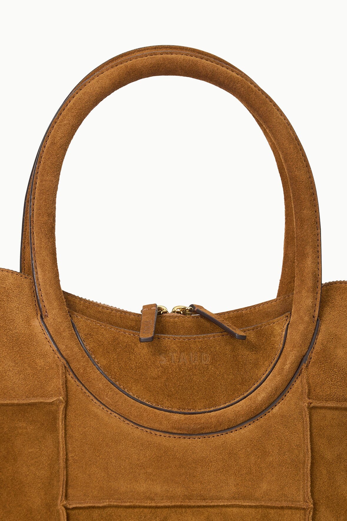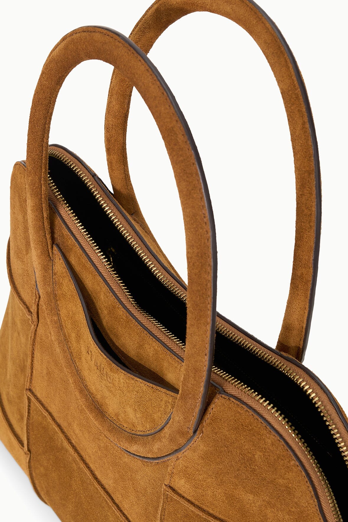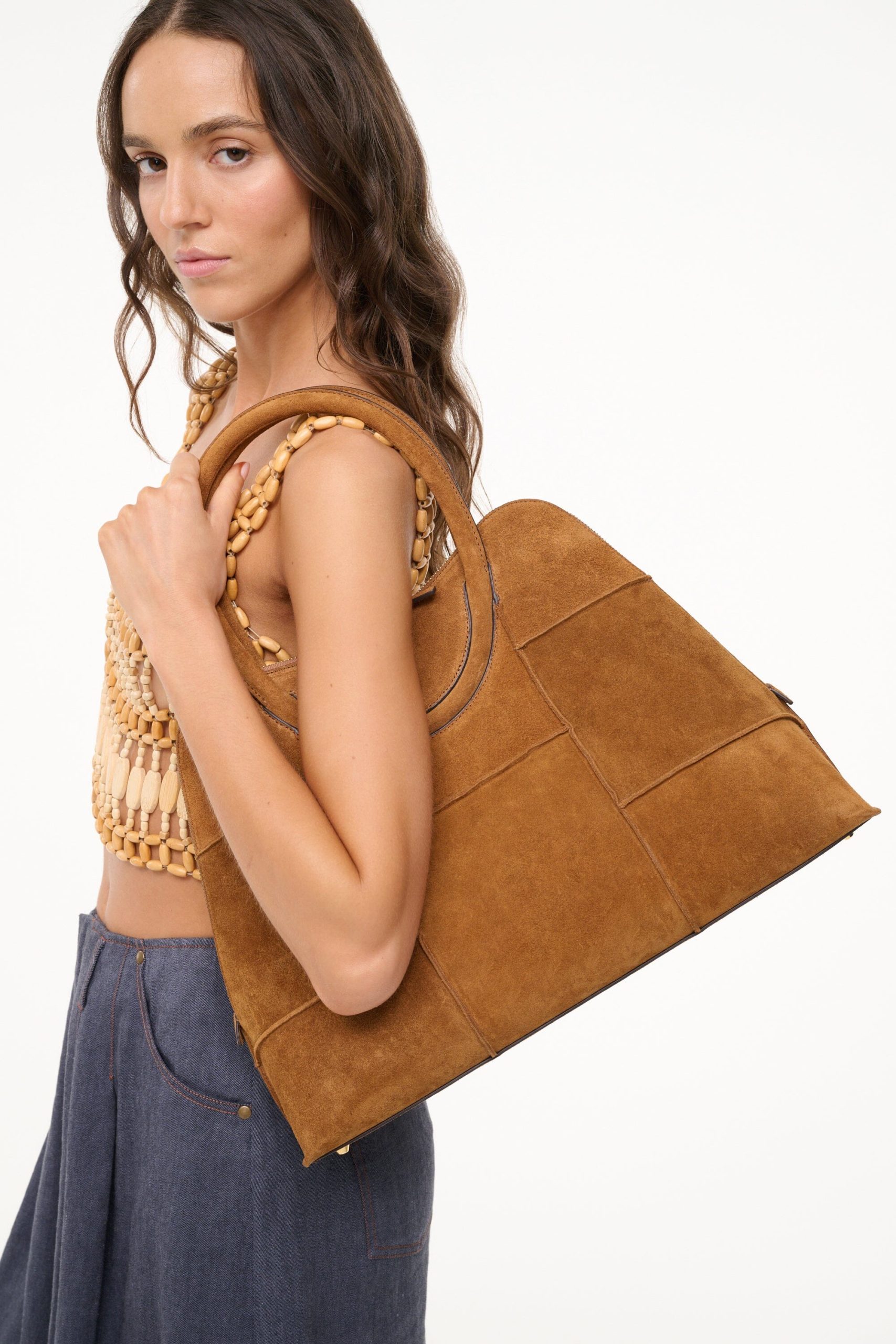 The Naomi Satchel is a new shape featuring our signature moon handles. This style is offered in our seasonal patchwork suede and features a double zipper and a front pocket.