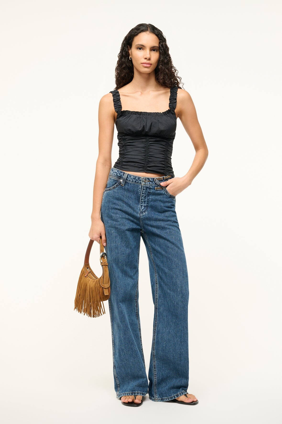 The Nic is a scoop neck sleeveless top made in our popular stretch poplin fabric. featuring ruffled straps and shirred corset seaming at the waist.