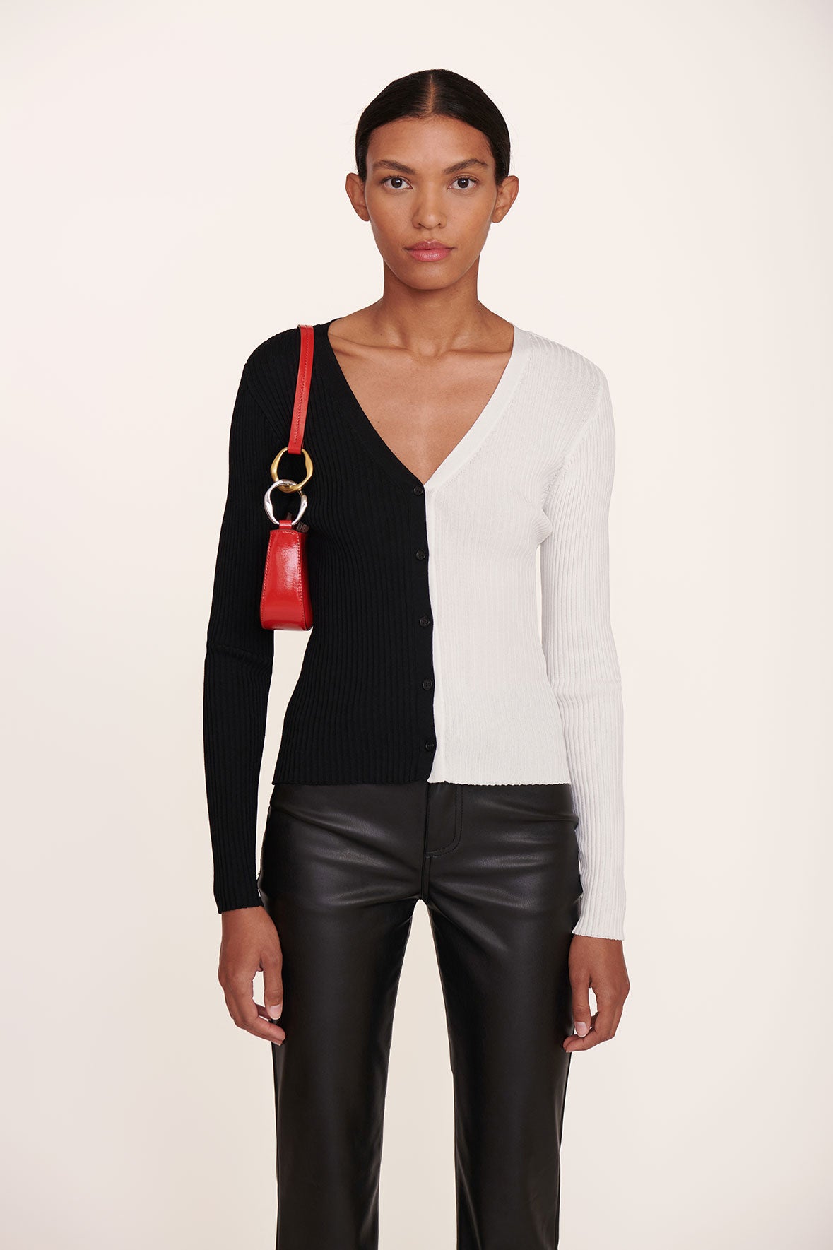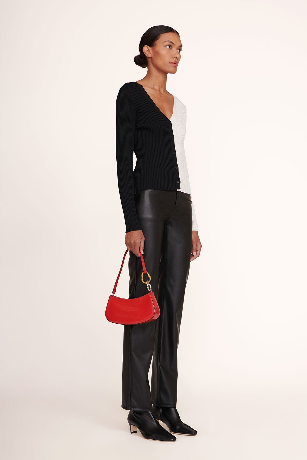 The Ollie Bag is a mini shoulder bag made out of polished leather. This style features a hardware design on the strap and a zip closure.