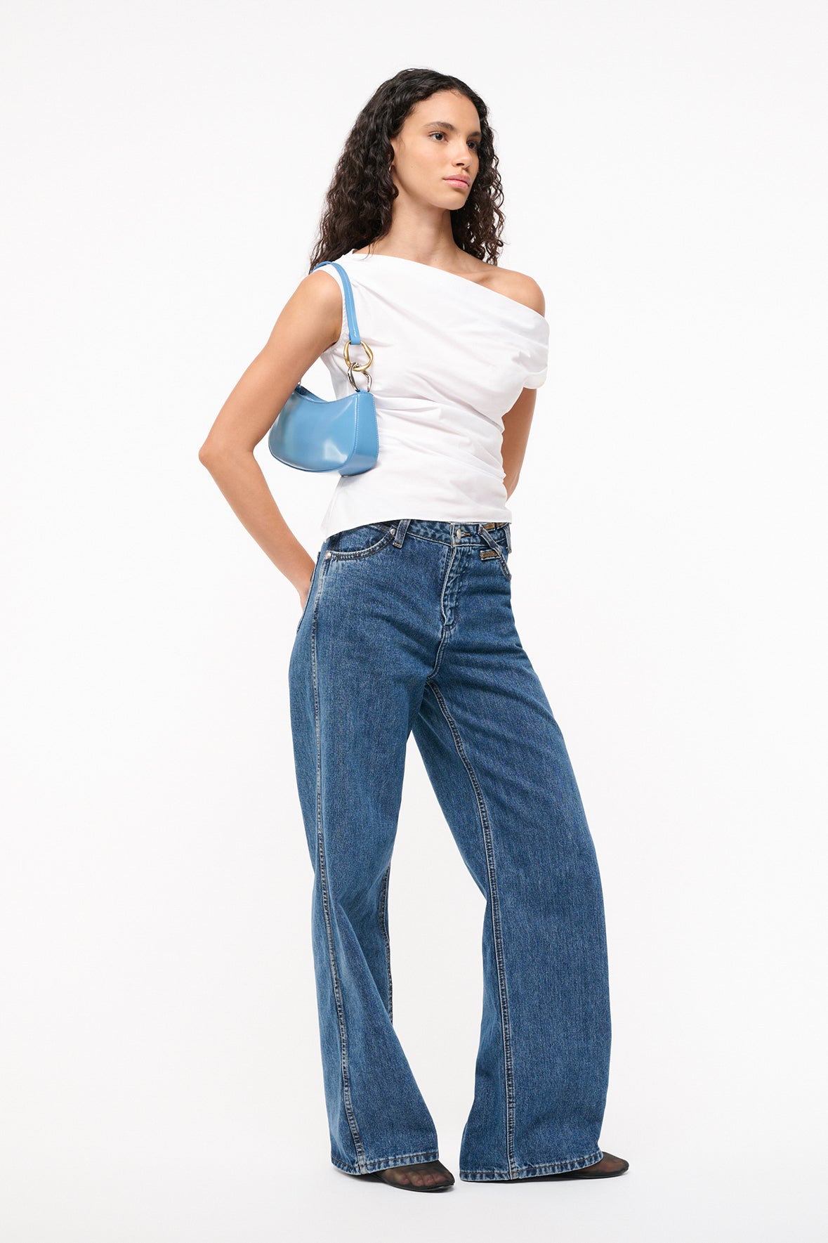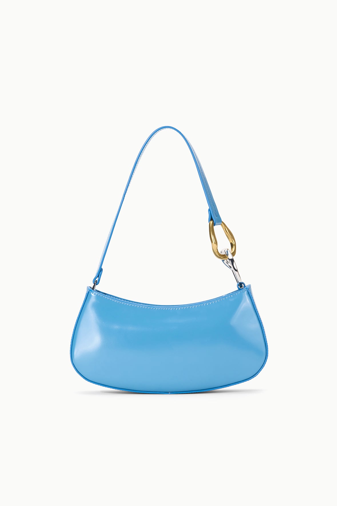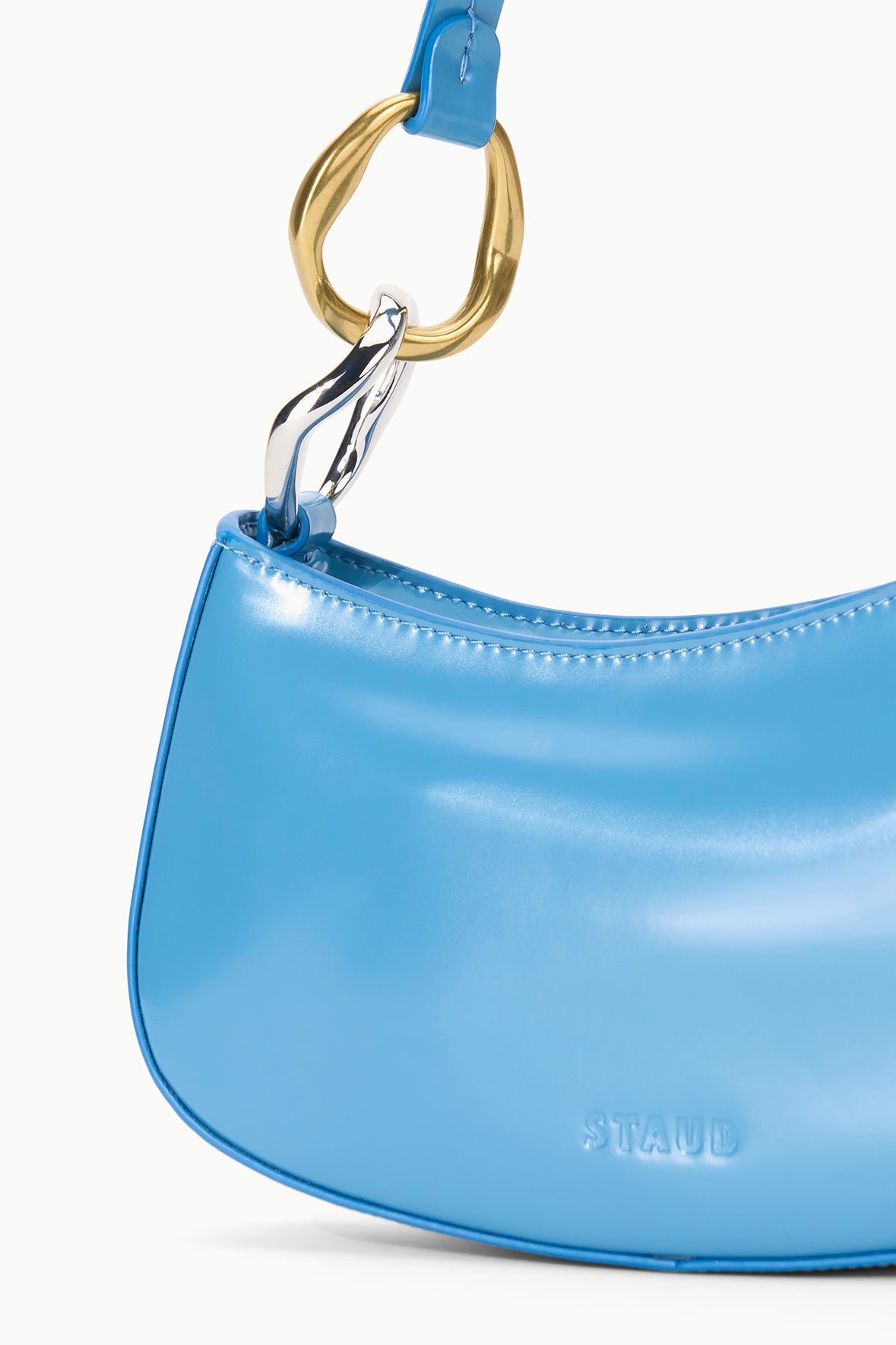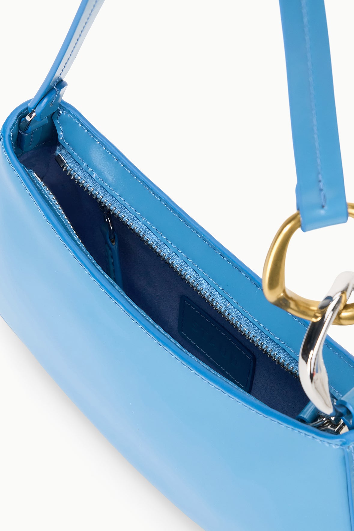 The Ollie Bag is a mini shoulder bag made out of polished leather. This style features a hardware design on the strap and a zip closure.