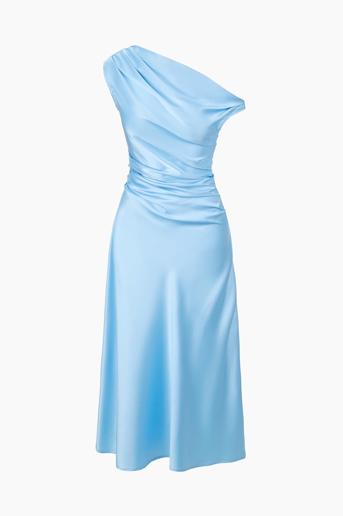 The Phare Dress features a draped off-the-shoulder neckline. a fitted waist and an ankle-grazing length. Updated in our stretch silk. this dress is perfect for a special occasion.