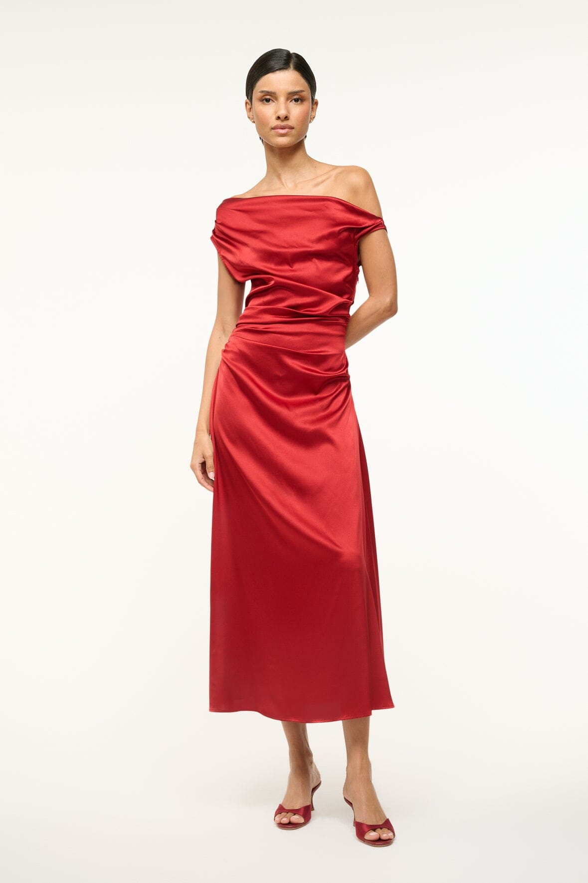 The Phare Dress features a draped off-the-shoulder neckline. a fitted waist and an ankle-grazing length. Updated in our stretch silk. this dress is perfect for a special occasion.