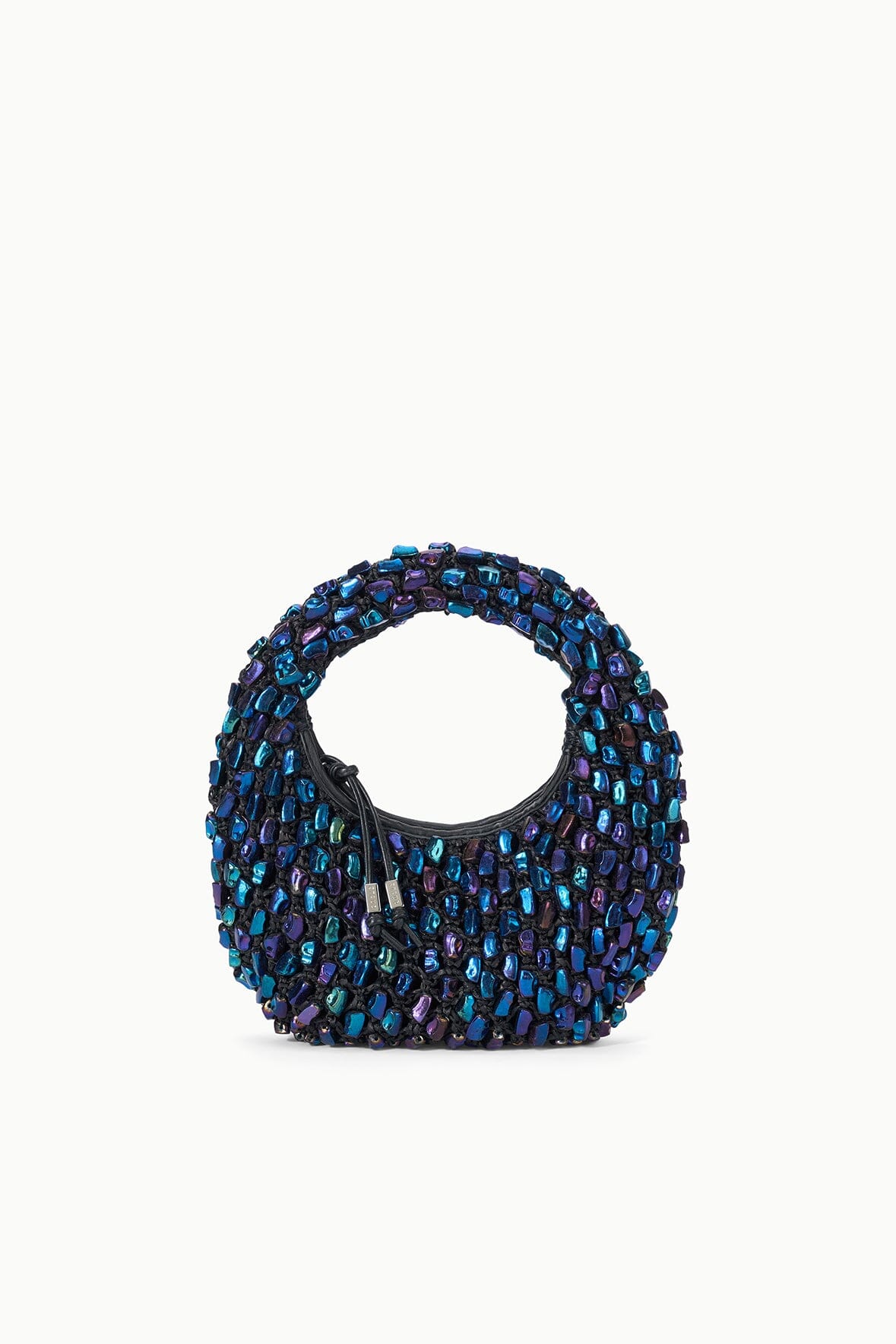 The Reef Bag is a hand held novelty bag crocheted with pearlescent beads. This style features a curved top handle and a zipper closure.?