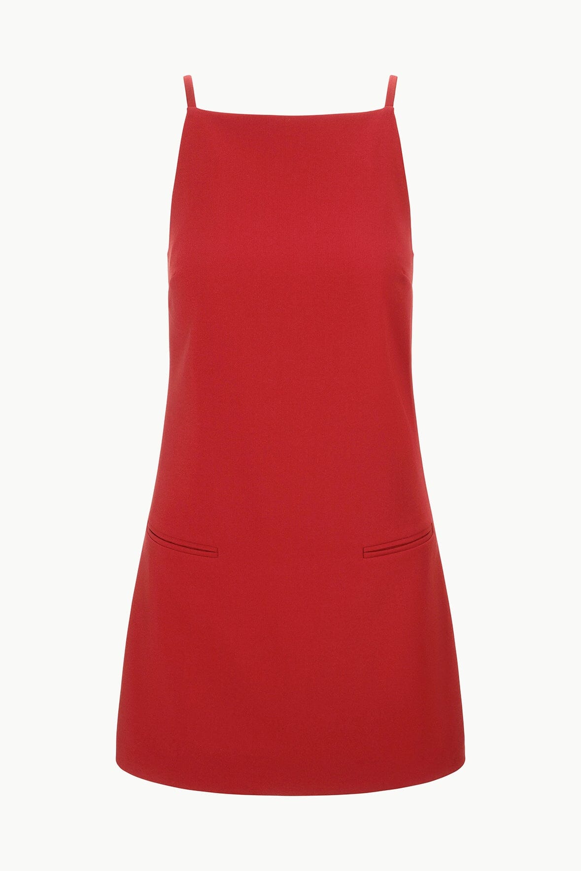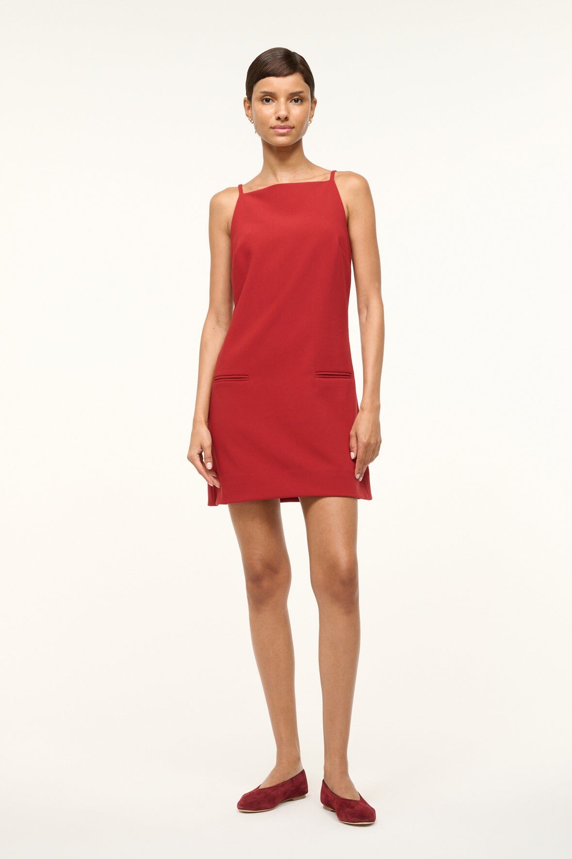 A tailored mini dress with relaxed silhouette. this style features double welt pocket details at the front and a square neckline.