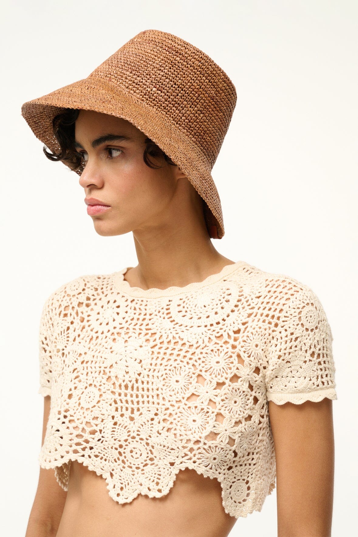 The Rita Bucket Hat is a straw crochet bucket hat perfect for Summer days. With a wide brim. this style is a great accessory to style with Staud Sea and beyond.