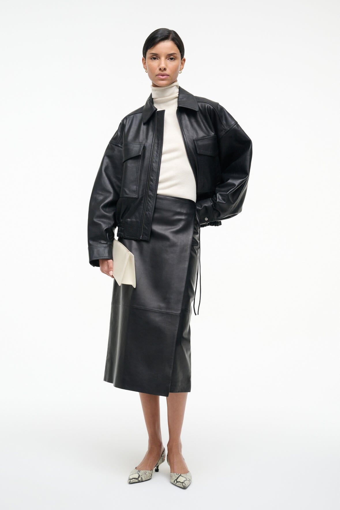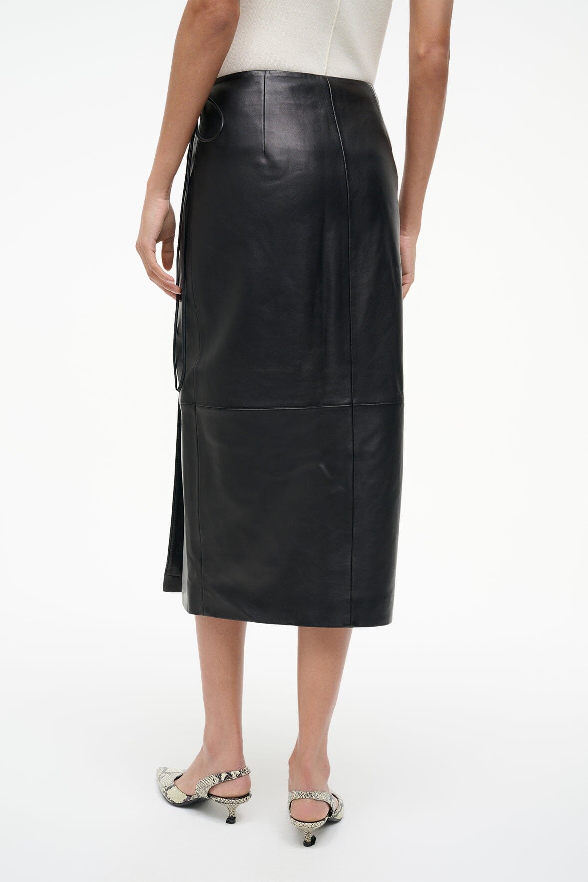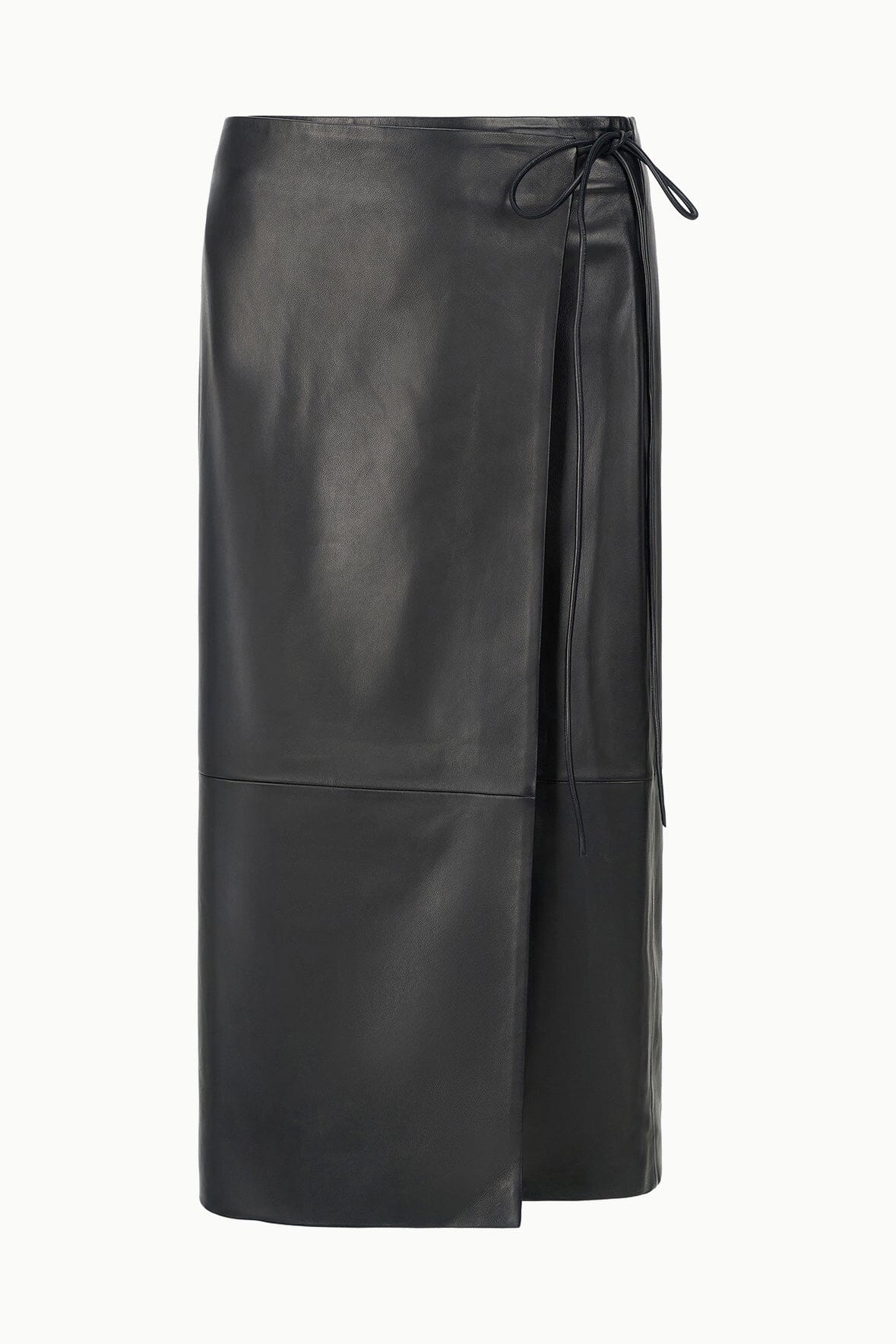 The Roman Leather Skirt is a midi-length wrap skirt crafted in supple calfskin leather. This style features a side tie.