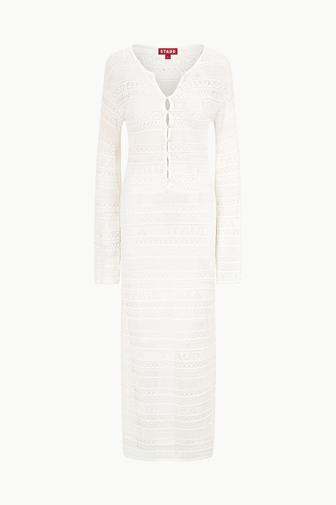 The Rosslare Cover-Up Dress is a sheer knit cover-up. featuring a slightly flared cuff. button detailing at the chest. and a side slit.?