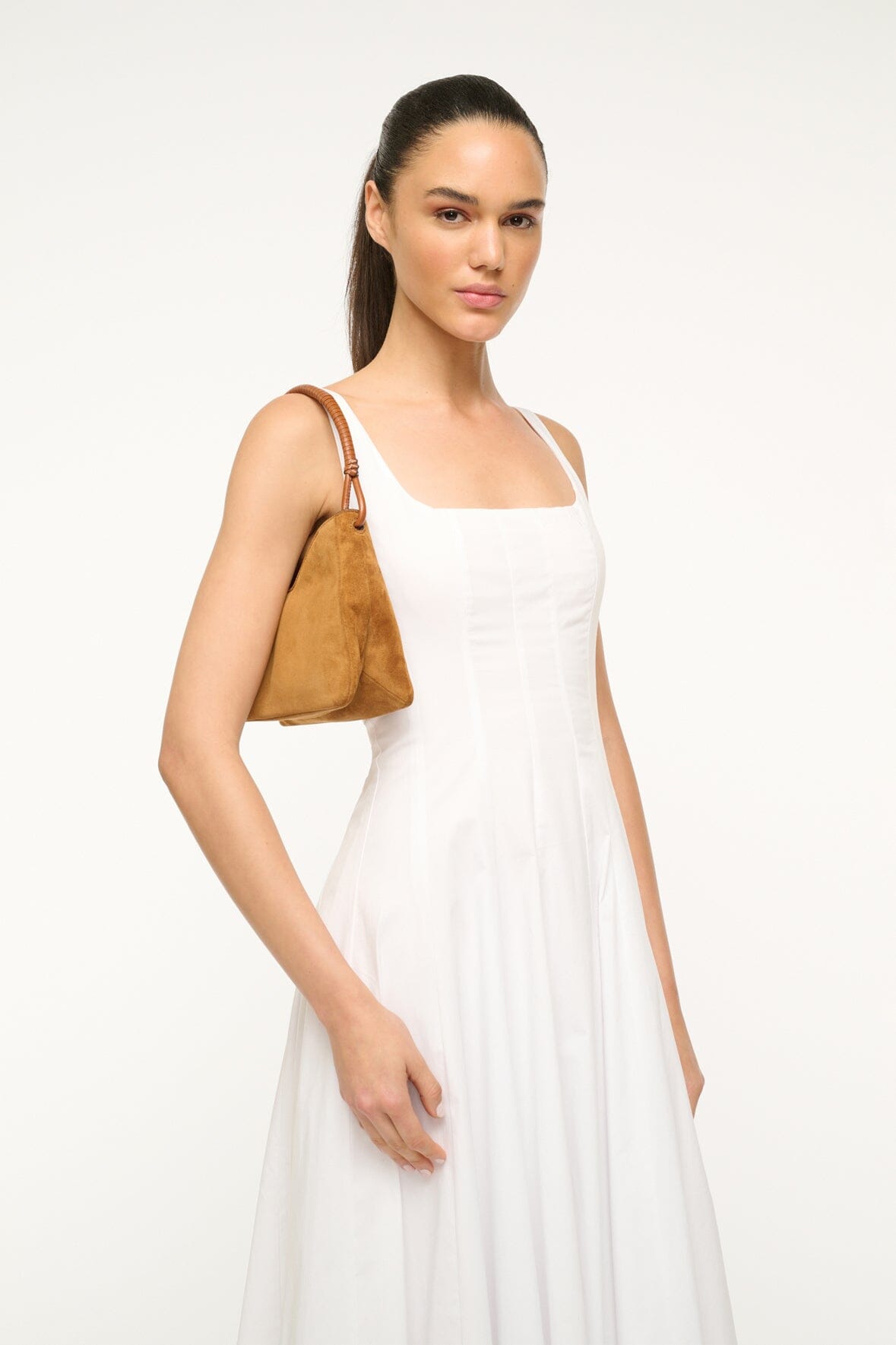 A minimal shoulder bag with removable crossbody strap. the Valerie features our signature hand-wrapped and knotted handle detailing. This style is lined with a moire fabric and features a zip closure.