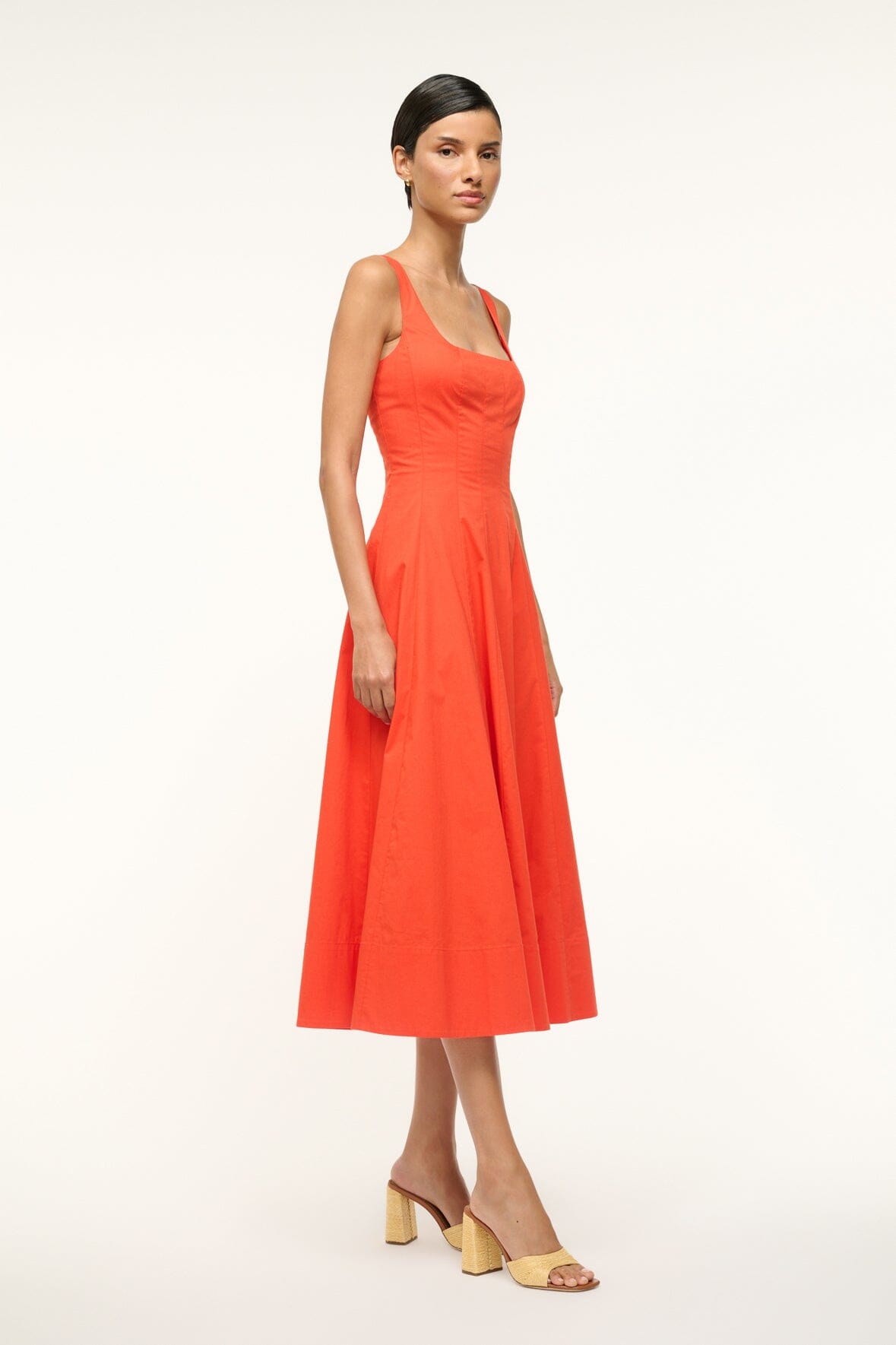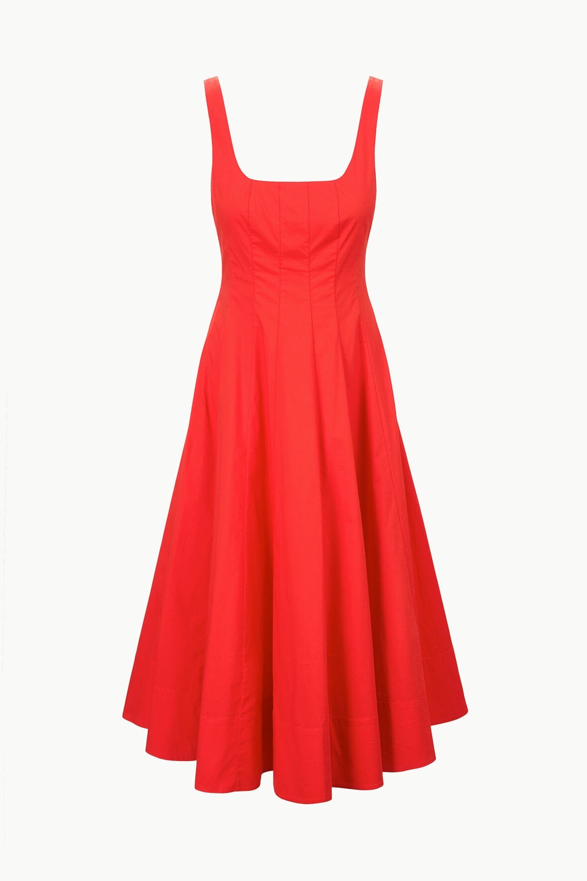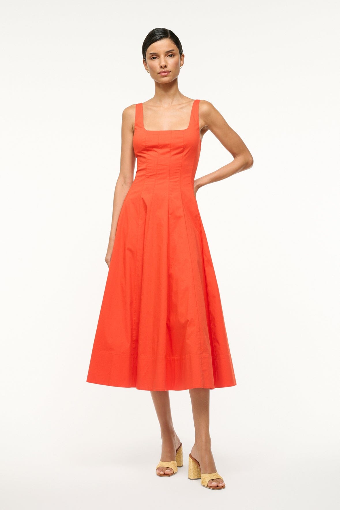 The Wells Dress has a square neckline and features a corset-inspired paneled bodice to create a flattering. fitted shape through the waist. It is made out of a lightweight cotton poplin and has a center back zipper.