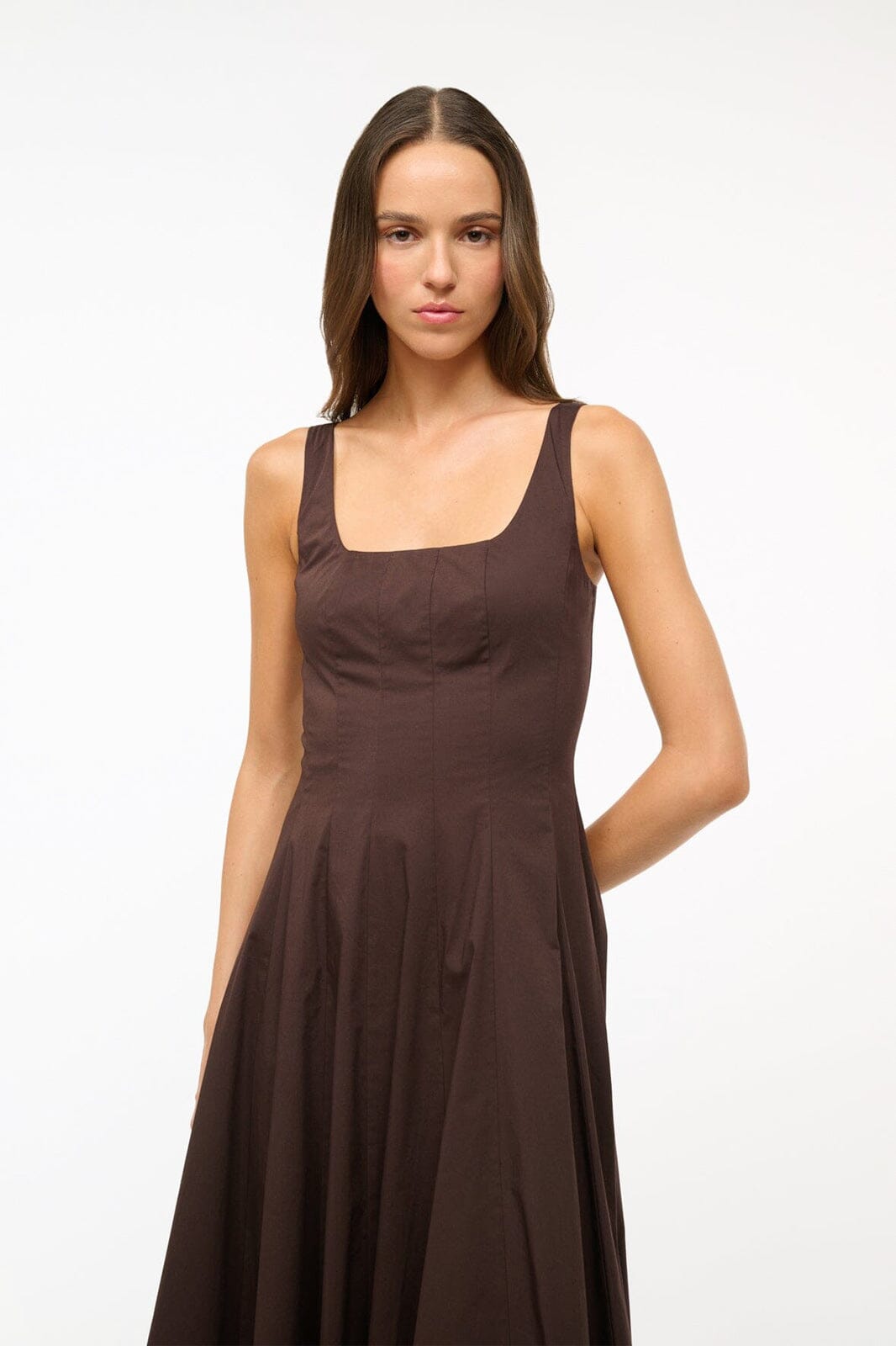 The Wells Dress features a corset-style panel construction to create a flattering. fitted shape through the waist and a full skirt which hits just below the knee. Constructed in lightweight cotton poplin.
