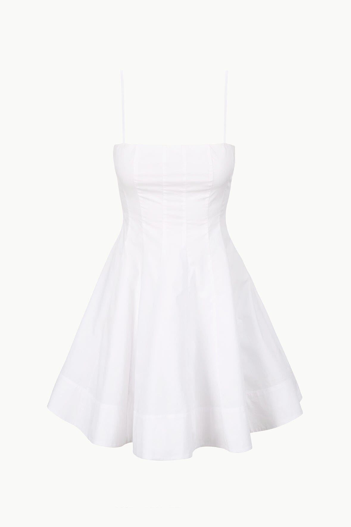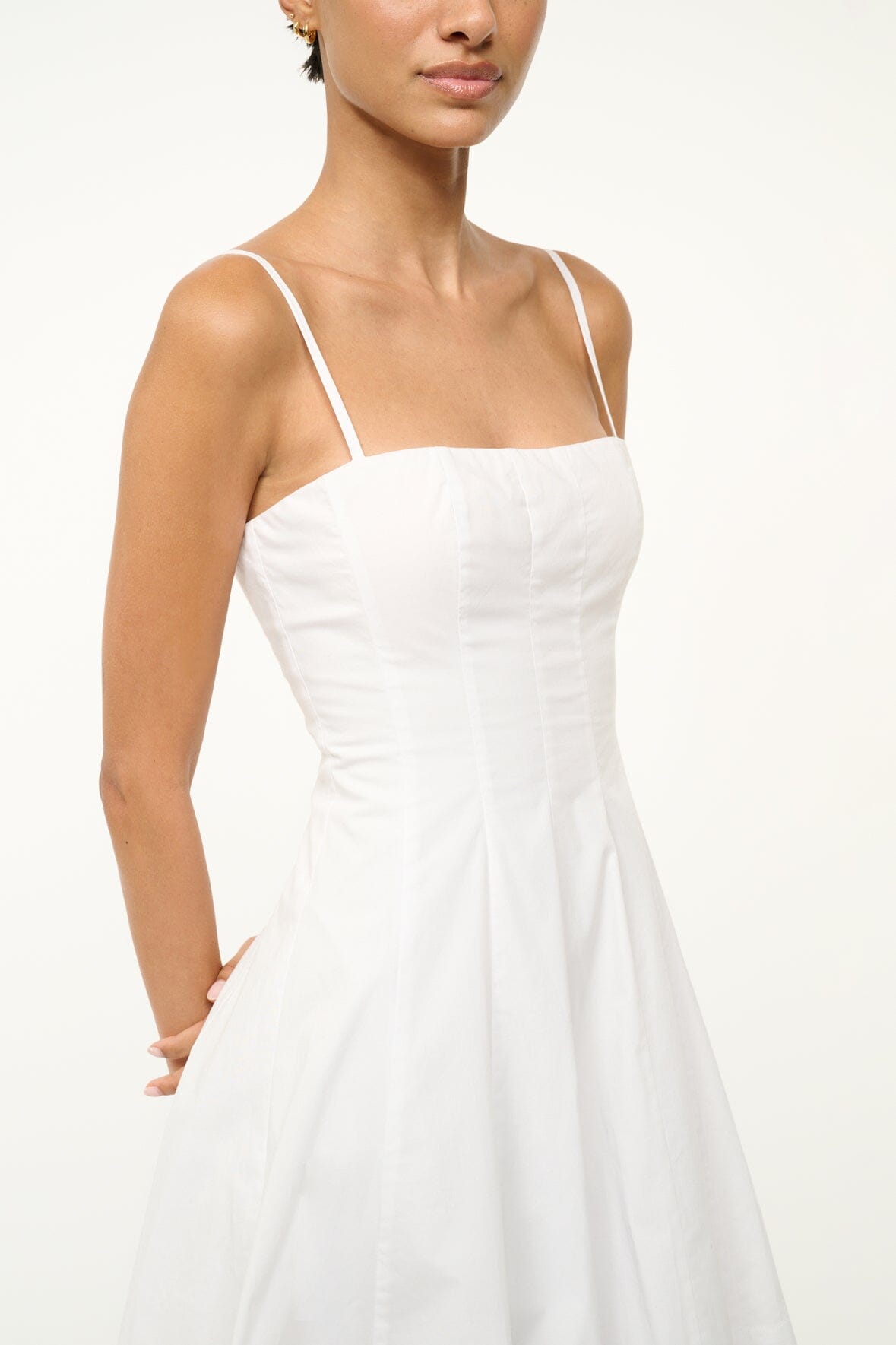 Introducing the Wylie. our newest mini dress crafted in our classic cotton poplin fabric. This style features a corset-style panel construction as seen in the Wells Dress. spaghetti straps and a straight neckline.